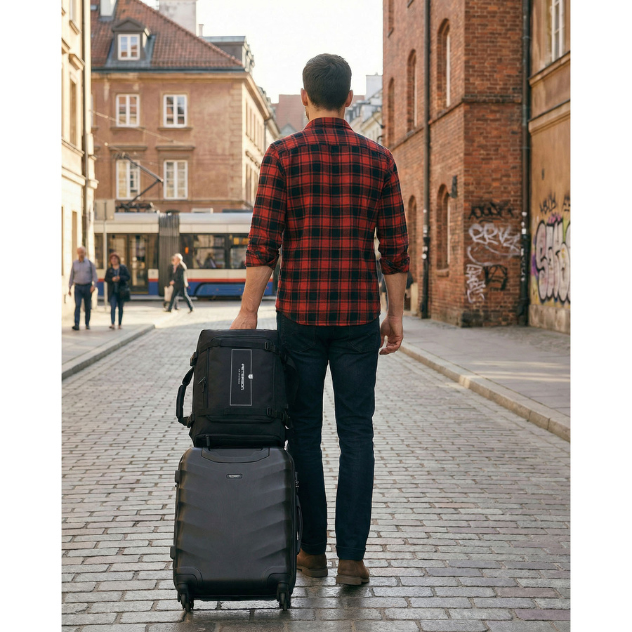 Pe spatele rucsacului există o curea practică care permite atașarea acestuia la mânerul unei valize, ceea ce face deplasarea mult mai ușoară în timpul călătoriilor - în special la aeroport sau la gară.