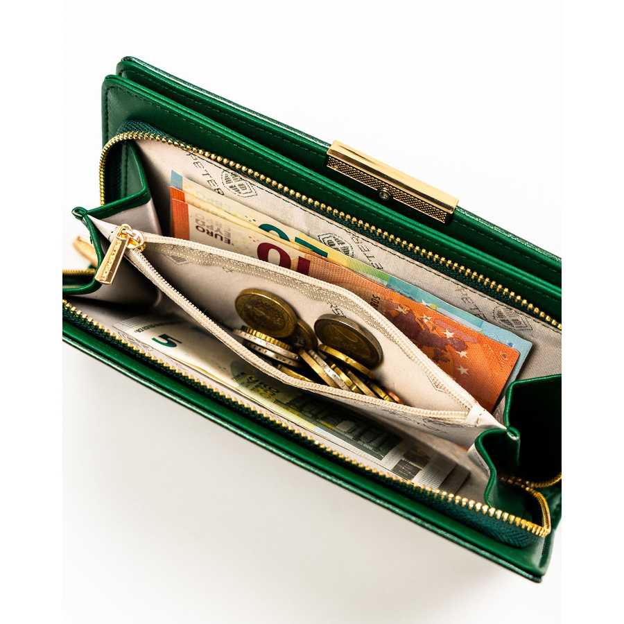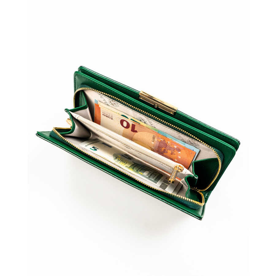 Przemyślany układ przegródek pozwala na wygodne przechowywanie kart, dokumentów i gotówki. Znajdziesz tu miejsce na wszystko, co niezbędne – od kart płatniczych po banknoty i monety.