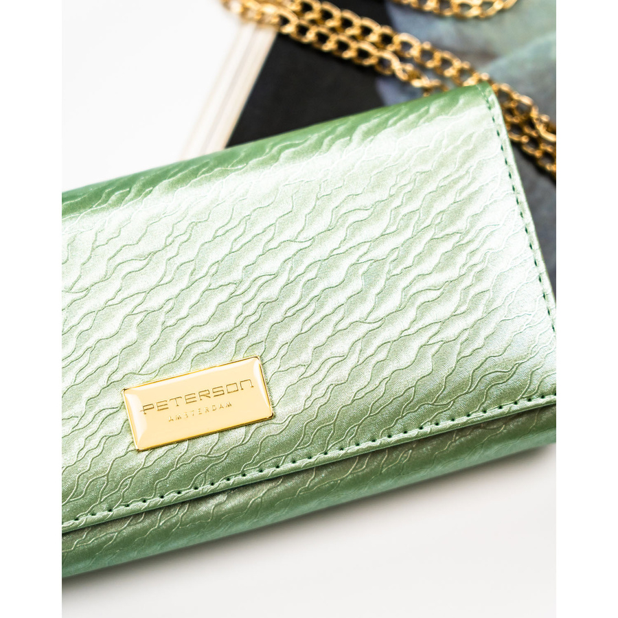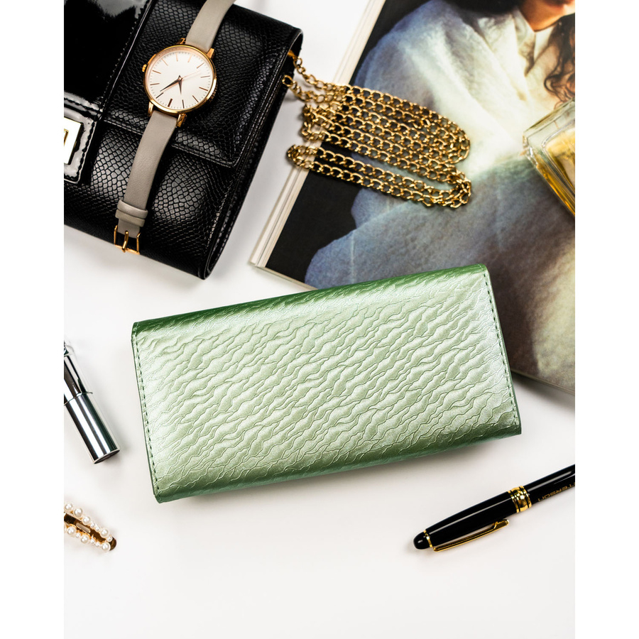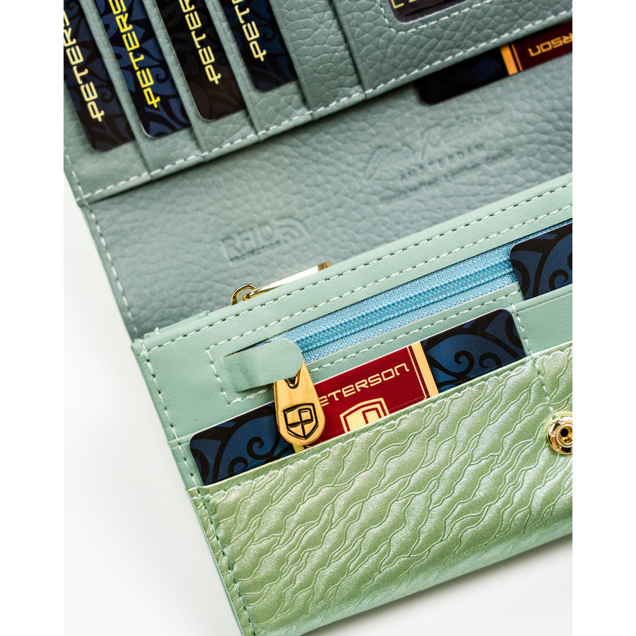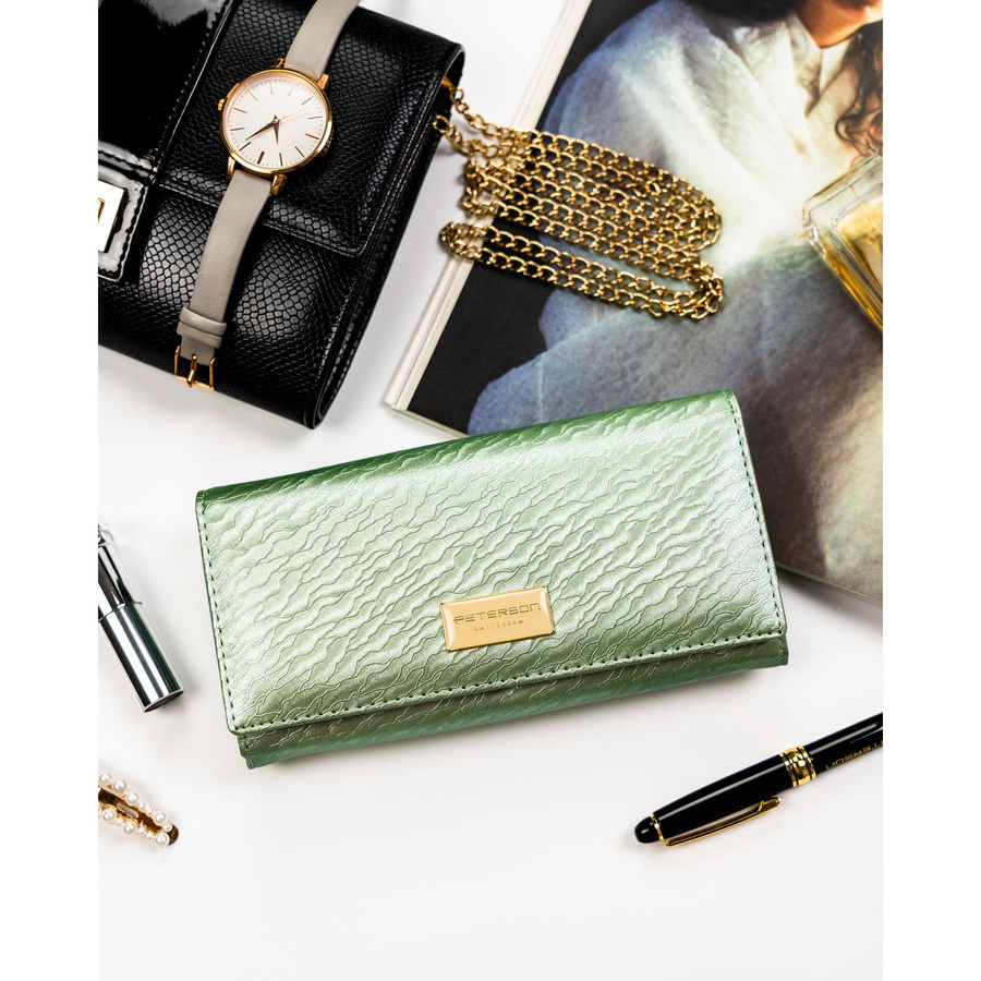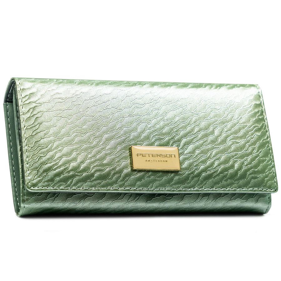 Duży, jasnozielony portfel damski zamykany na zatrzask, pokryty subtelnym wzorem na klapce - Peterson