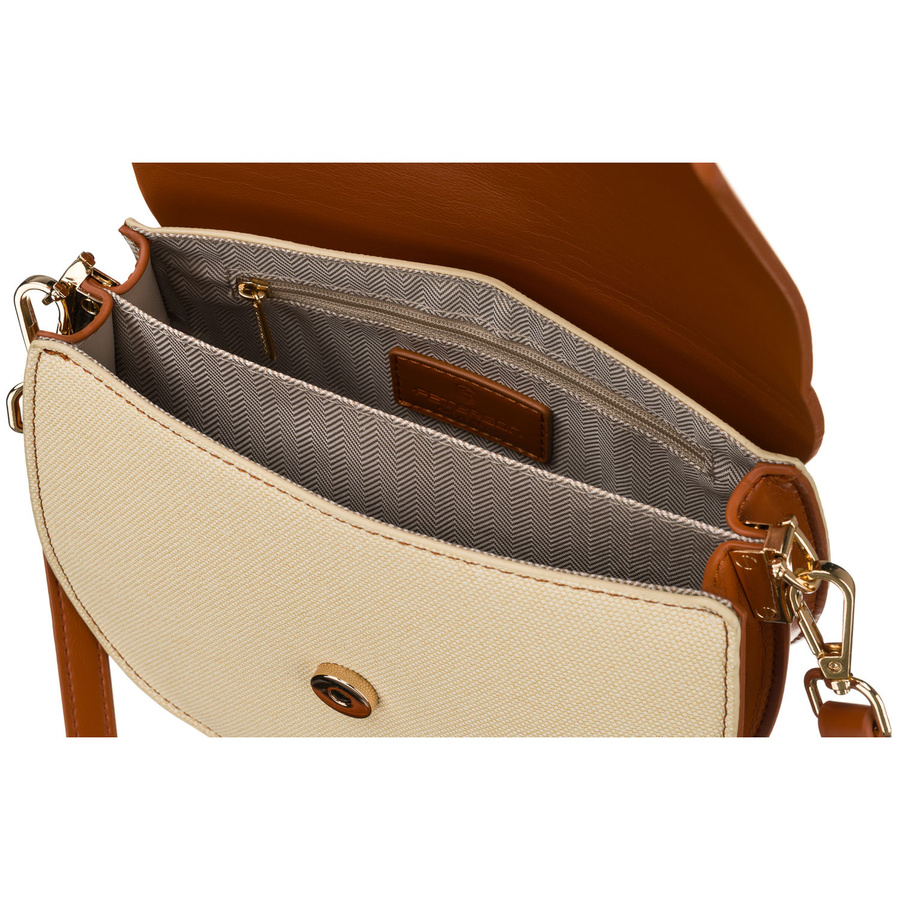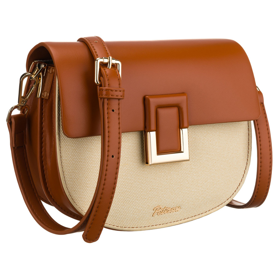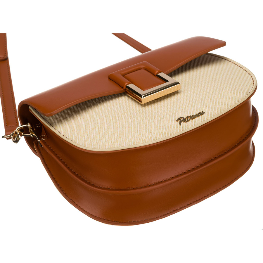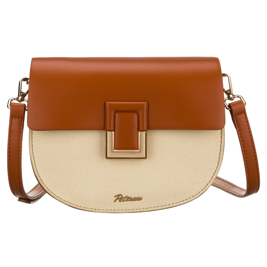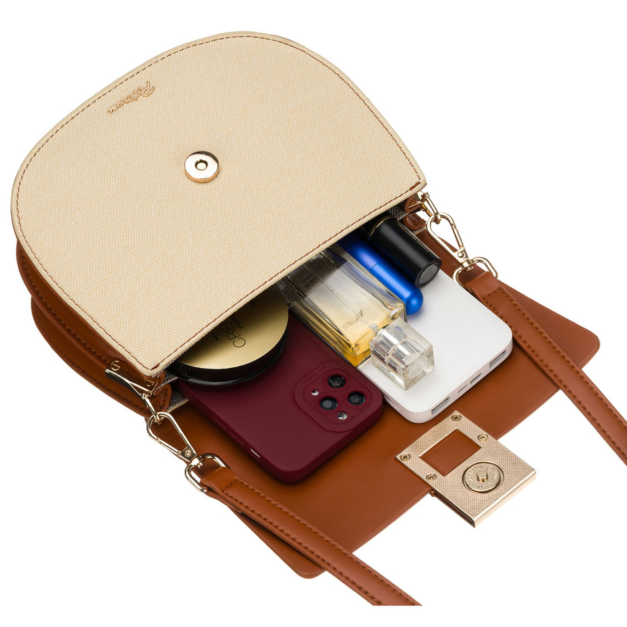 Geantă mică de damă în formă de potcoavă, în culorile ecru și maro, cu închidere magnetică cu clip - Peterson