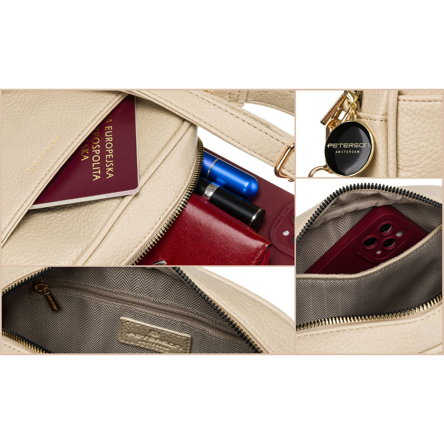 Ambele curele sunt reglabile, permițându-ți să porți geanta pe umăr sau crossbody. În plus, poți atașa un breloc elegant cu logo-ul Peterson®️, inclus, la cureaua lată – un mic detaliu care face o mare diferență!