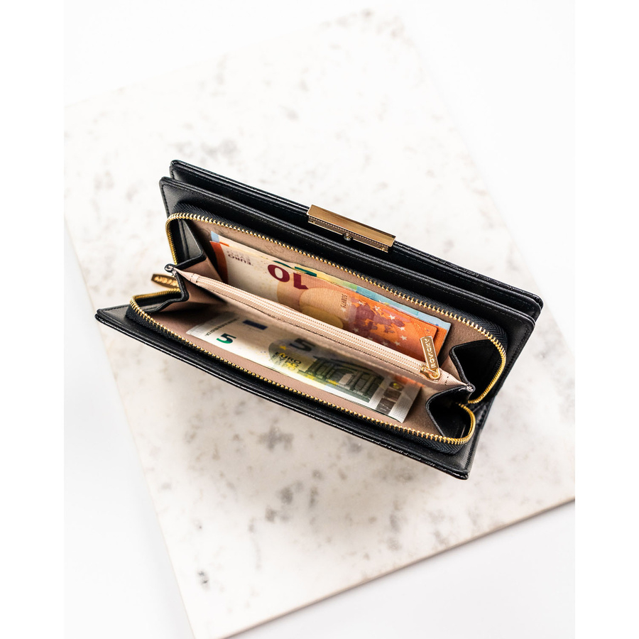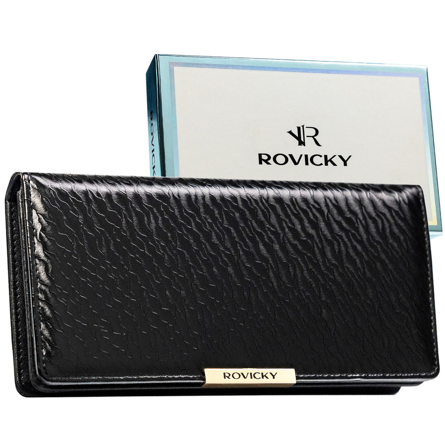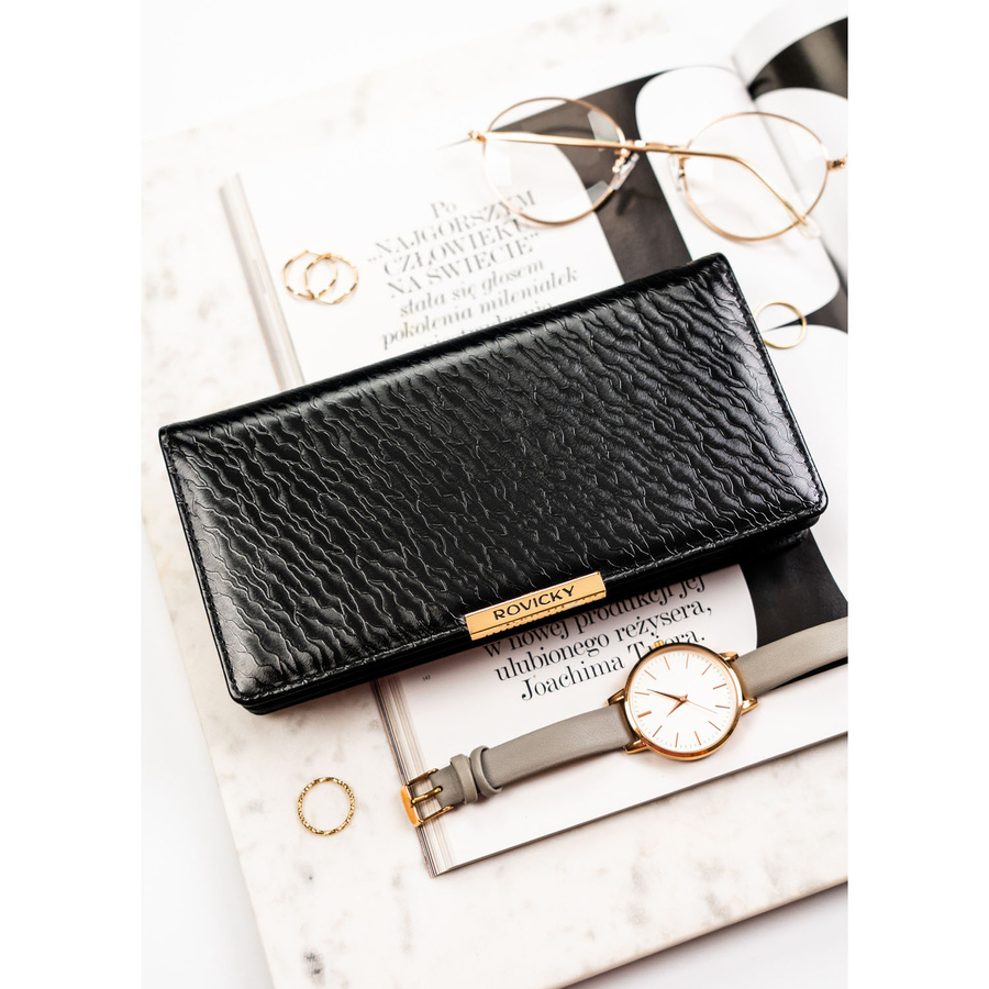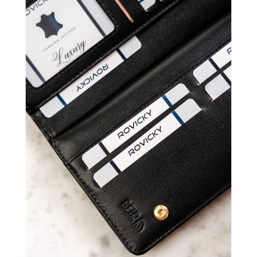 Duży portfel damski ze skóry ekologicznej w czarnym kolorze zamykany na zatrzask - Rovicky