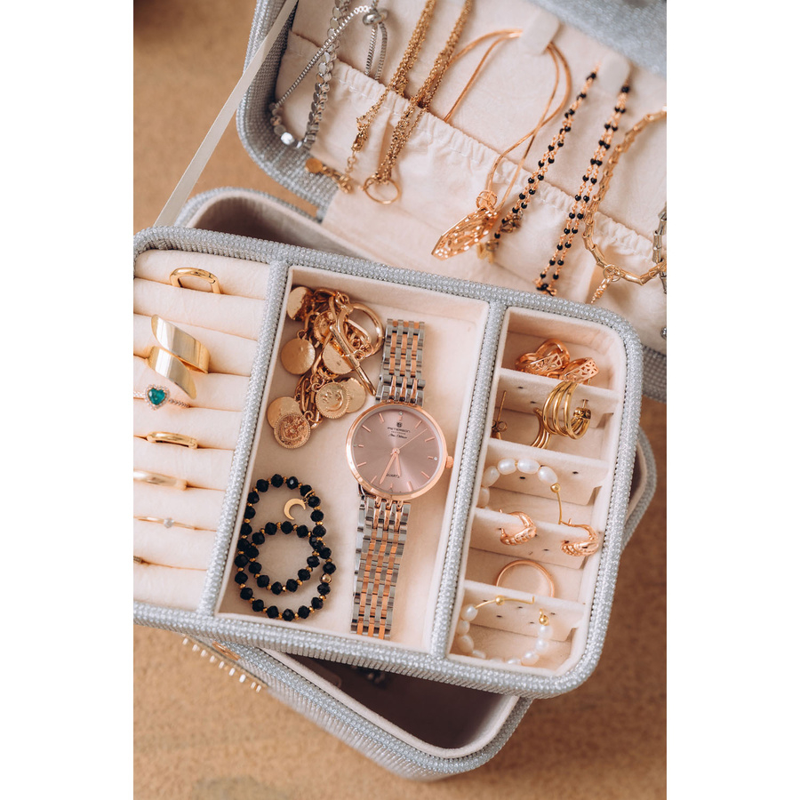 - Sub ele există un buzunar elastic care protejează bijuteriile de deplasare în timpul transportului.