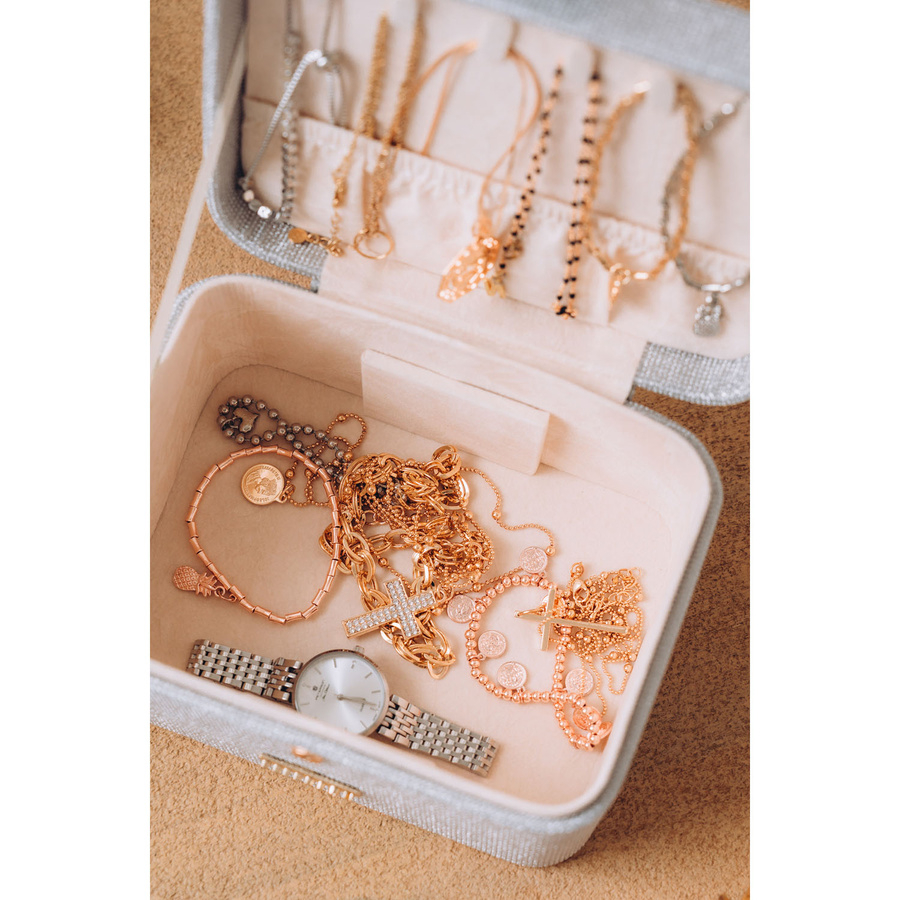 - Sub tavă există un compartiment principal, spațios, unde puteți așeza bijuterii mai mari - coliere, ceasuri, brățări sau lanțuri.