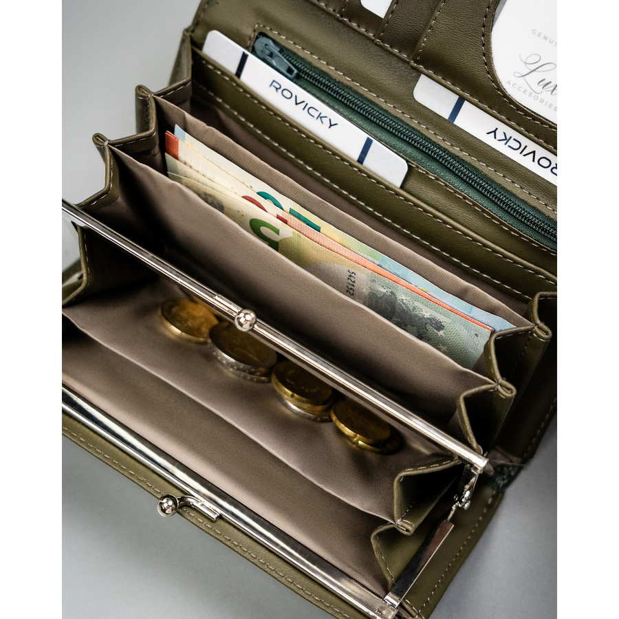 Z tyłu portfela znajduje się praktyczny schowek, który świetnie sprawdzi się na najczęściej używane przedmioty. Możesz w nim bezpiecznie przechowywać kartę, bilet, paragon lub drobną notatkę, mając je zawsze pod ręką. To wygodne rozwiązanie, które oszczędza czas i ułatwia organizację na co dzień.