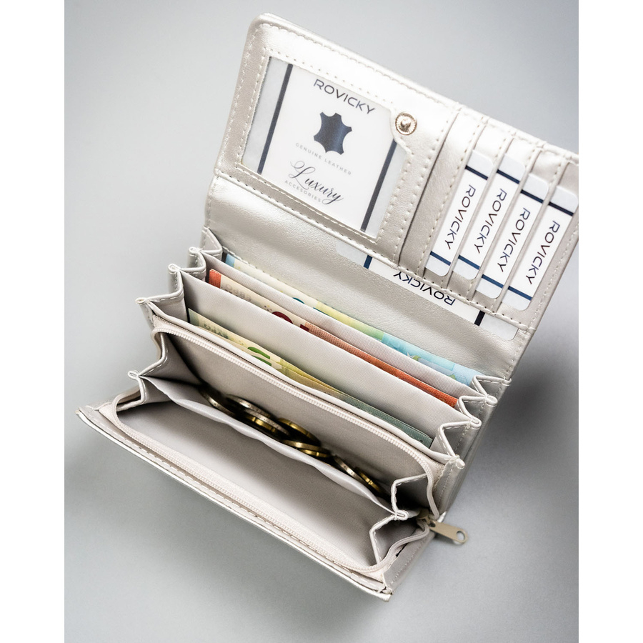 Wnętrze portfela zaprojektowano tak, aby najważniejsze informacje zawsze były pod ręką. Do dyspozycji jest 5 przegródek na karty, dzięki którym szybko znajdziesz potrzebną. Dodatkowe 4 schowki na dokumenty zapewniają wygodny dostęp.