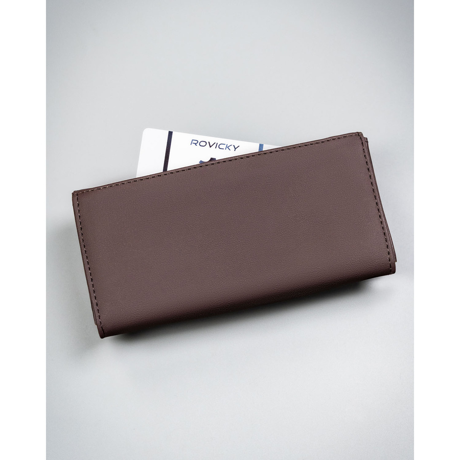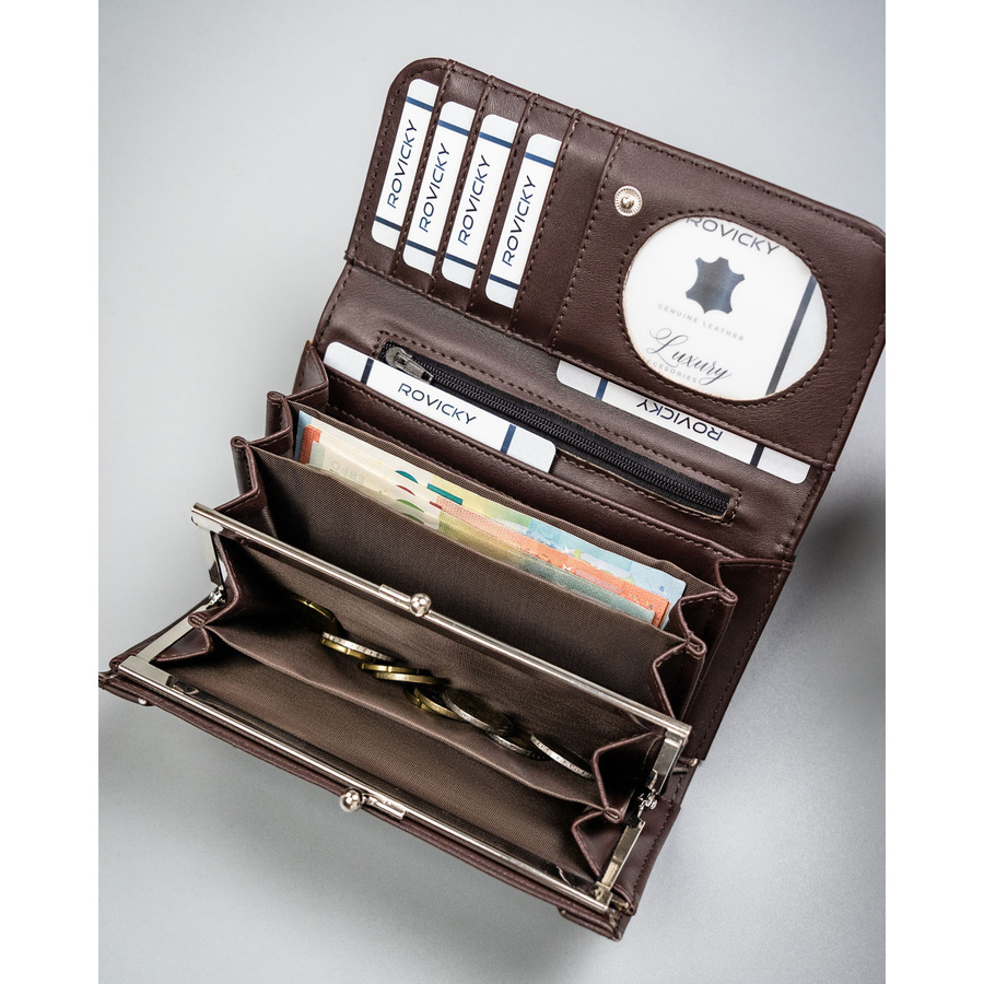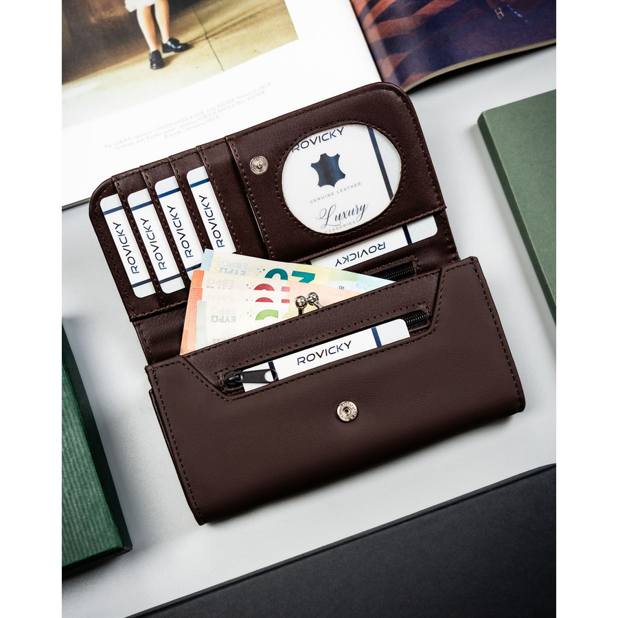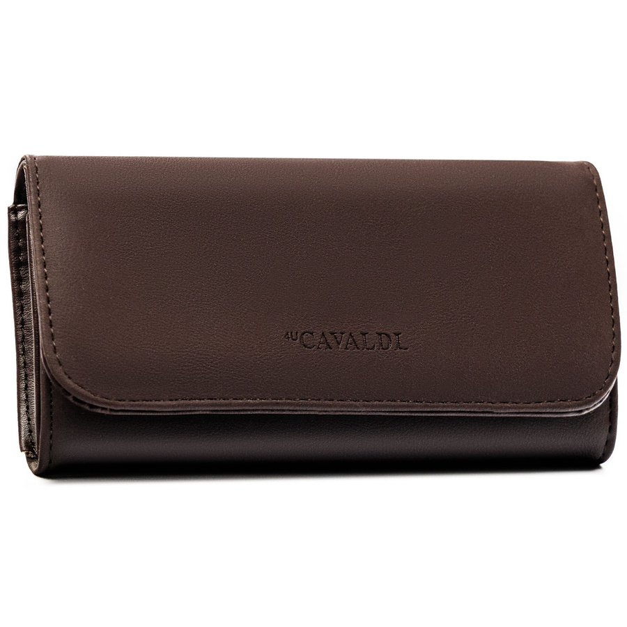 Brązowy, duży portfel damski ze skóry ekologicznej z kieszonką zewnętrzną, zamykany na zatrzask - 4U Cavaldi