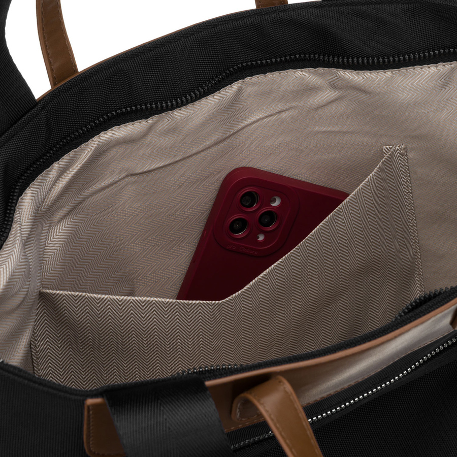 Torba oferuje jedną komorę główną zapinaną na suwak, a wewnętrzne kieszenie pozwalają łatwo pogrupować mniejsze przedmioty - telefon, klucze, portfel czy notatki.