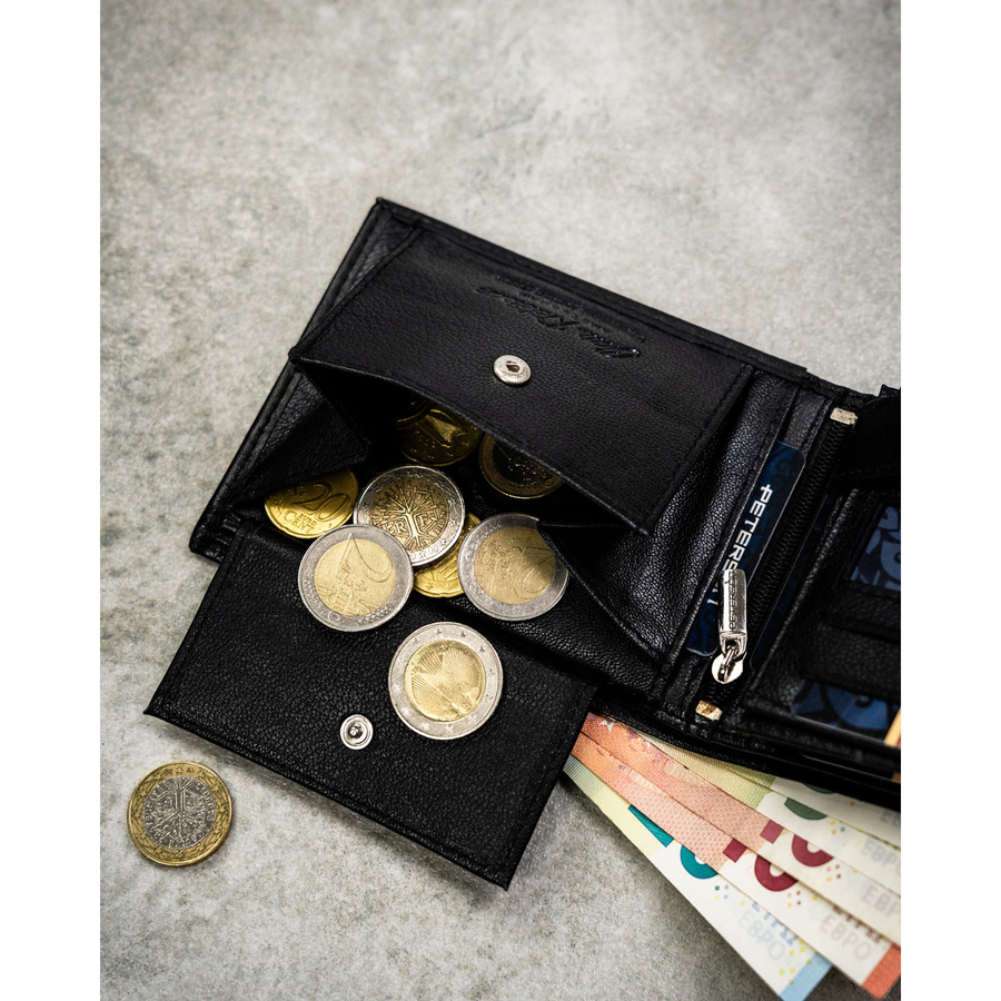 • Pojemną kieszeń na bilon – zapinaną na zatrzask, co zapobiega wysypywaniu się monet.