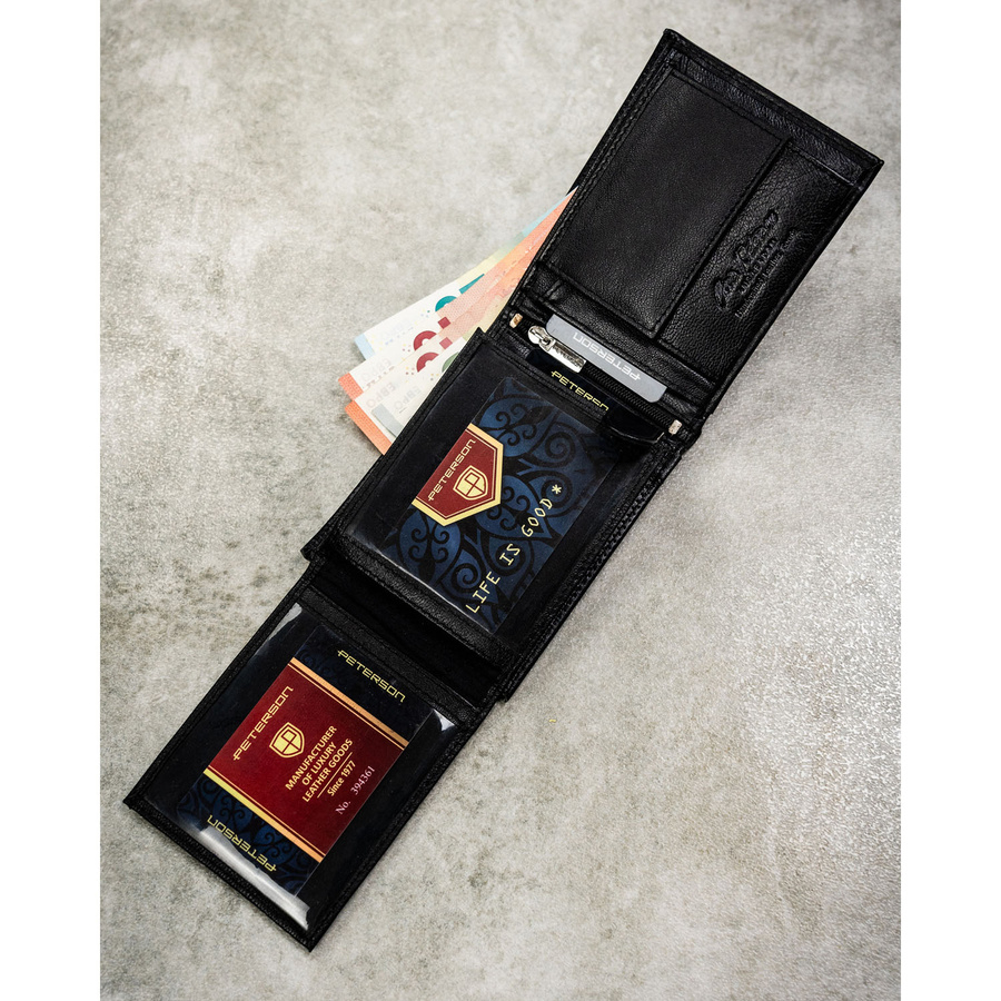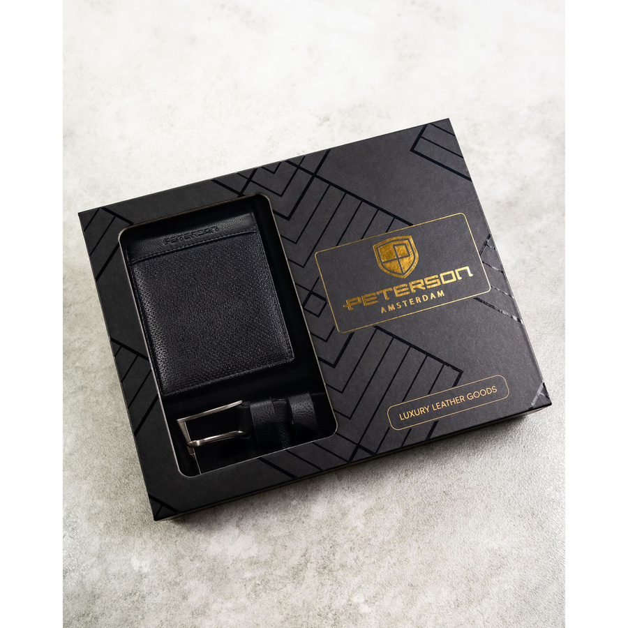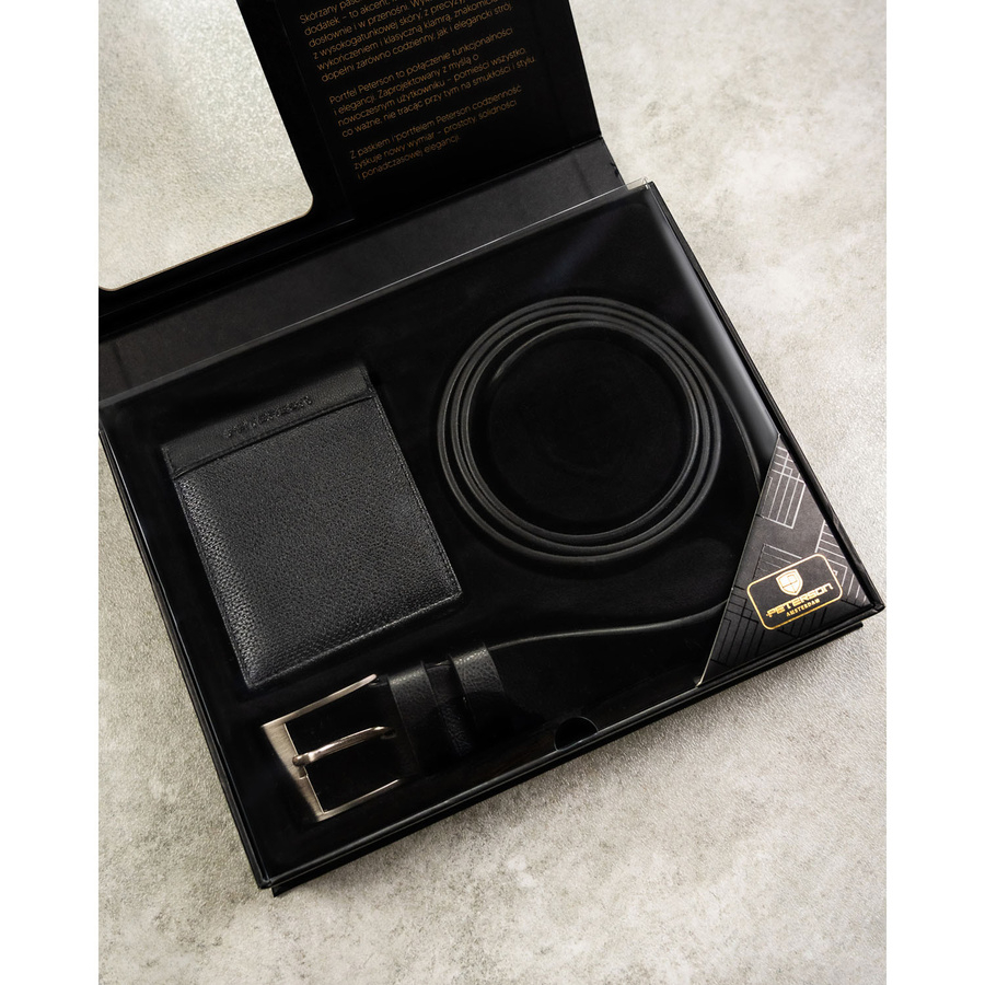 Zestaw prezentowy: skórzany portfel męski w czarnym kolorze bez zapięcia i czarny pasek ze skóry ekologicznej - Peterson