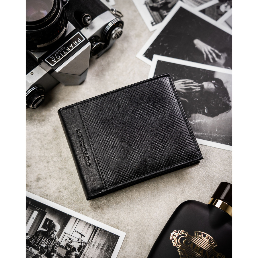 Portfel wykonano ze skóry naturalnej, dzięki czemu jest trwały, przyjemny w dotyku i prezentuje się wyjątkowo elegancko.