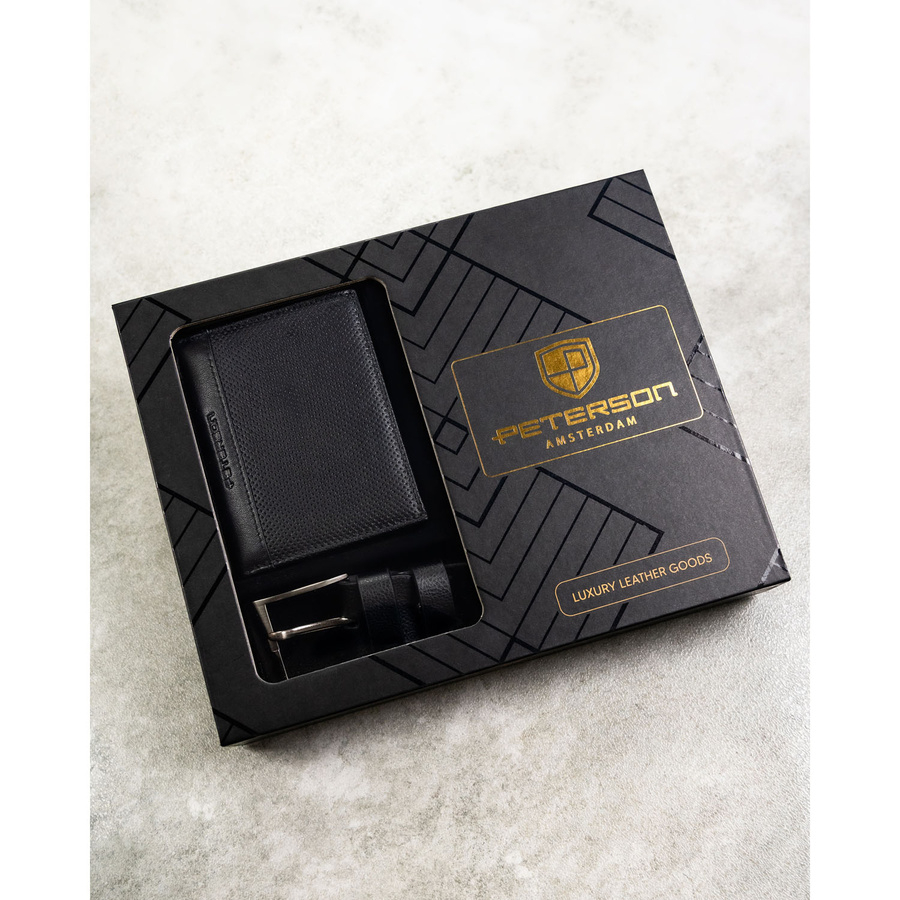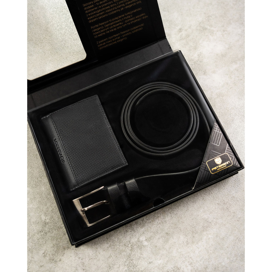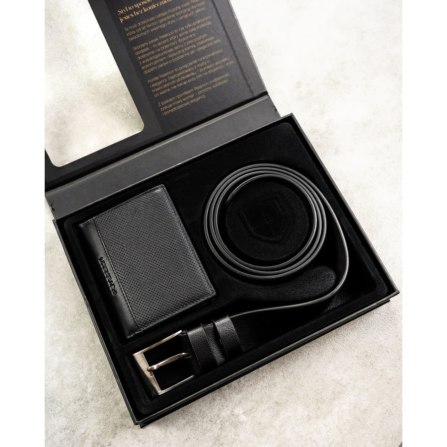 Zestaw prezentowy: skórzany, pionowy portfel męski w czarnym kolorze bez zapięcia i czarny pasek ze skóry ekologicznej - Peterson