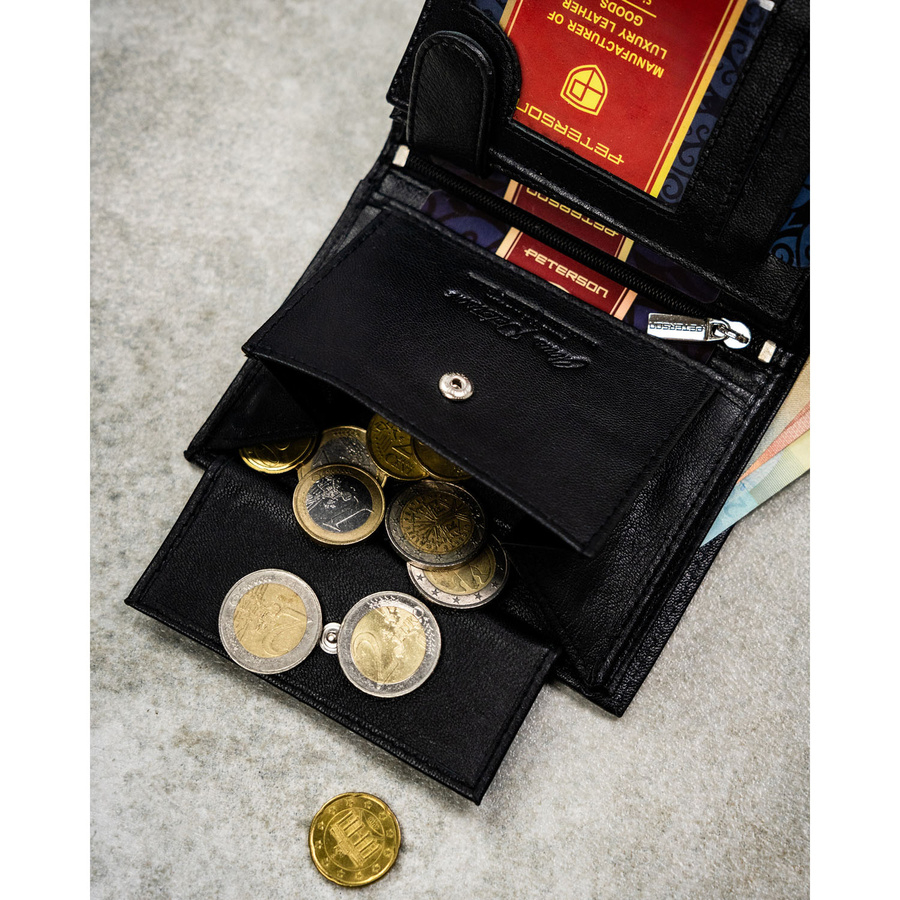 • Pojemną kieszeń na bilon – zapinaną na zatrzask, co zapobiega wysypywaniu się monet.