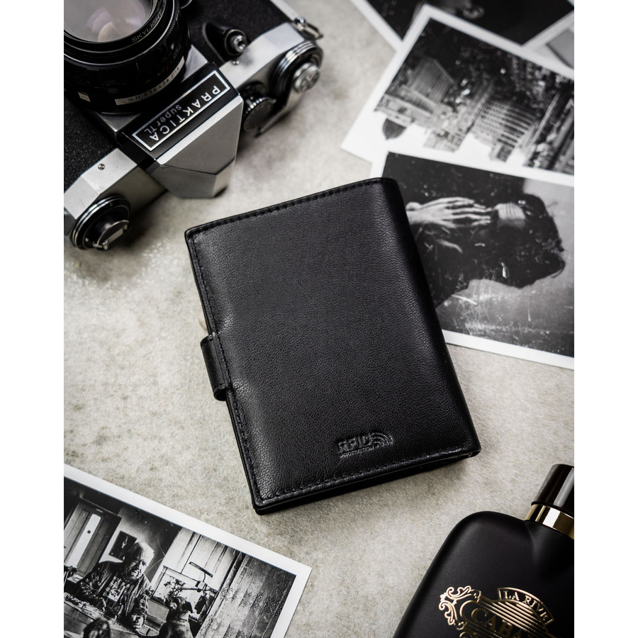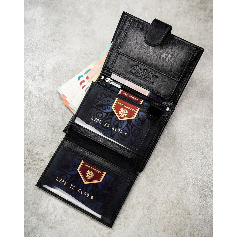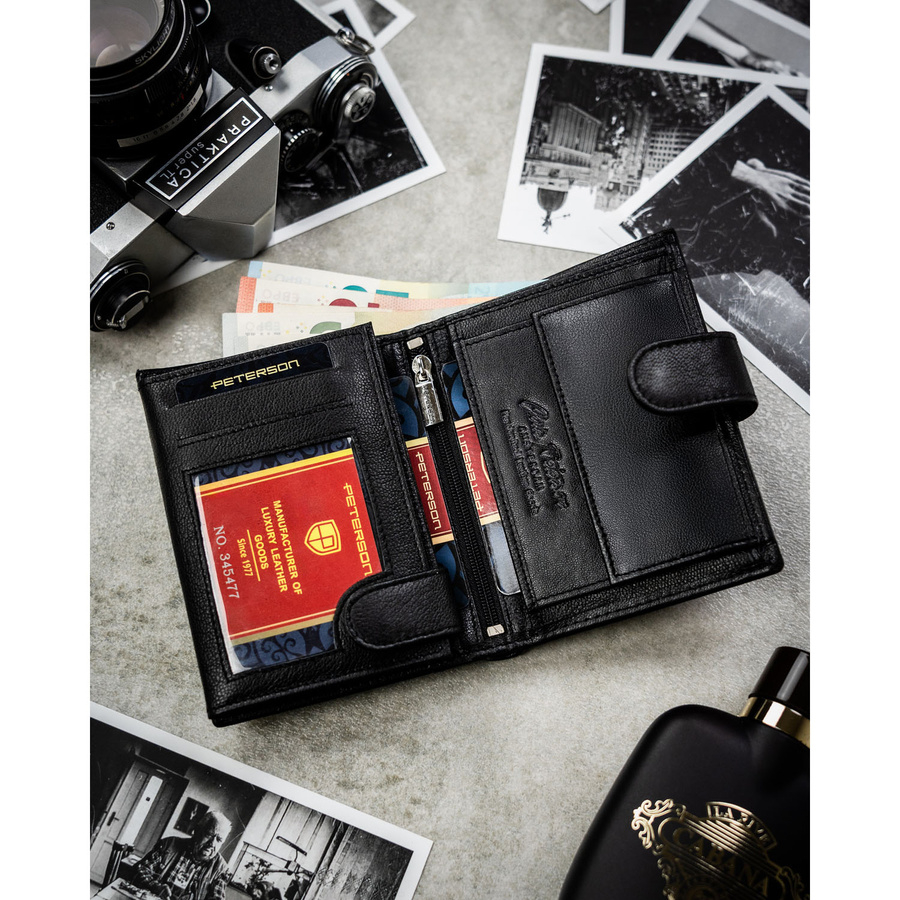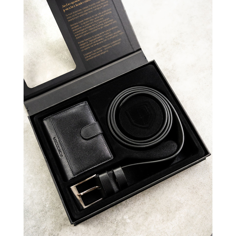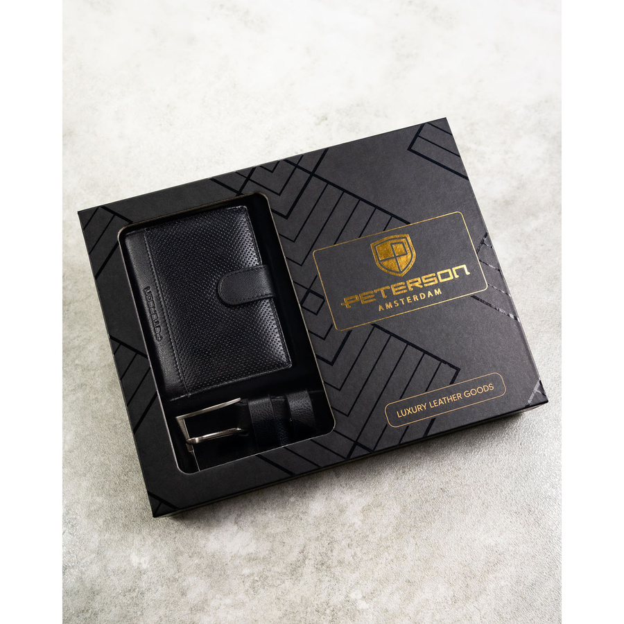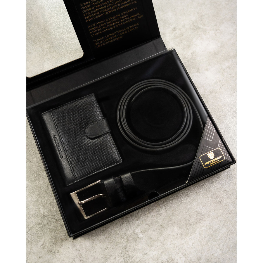 Zestaw prezentowy: skórzany, pionowy portfel męski w czarnym kolorze i czarny pasek ze skóry ekologicznej - Peterson