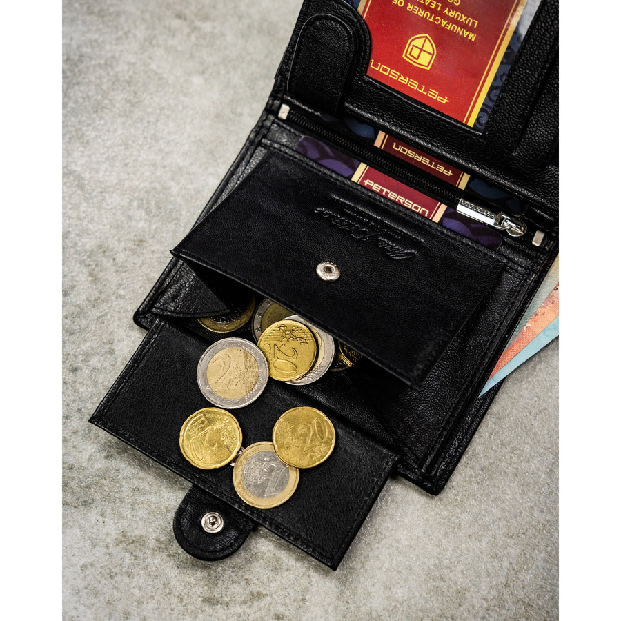 • Pojemną kieszeń na bilon – zapinaną na zatrzask, co zapobiega wysypywaniu się monet.