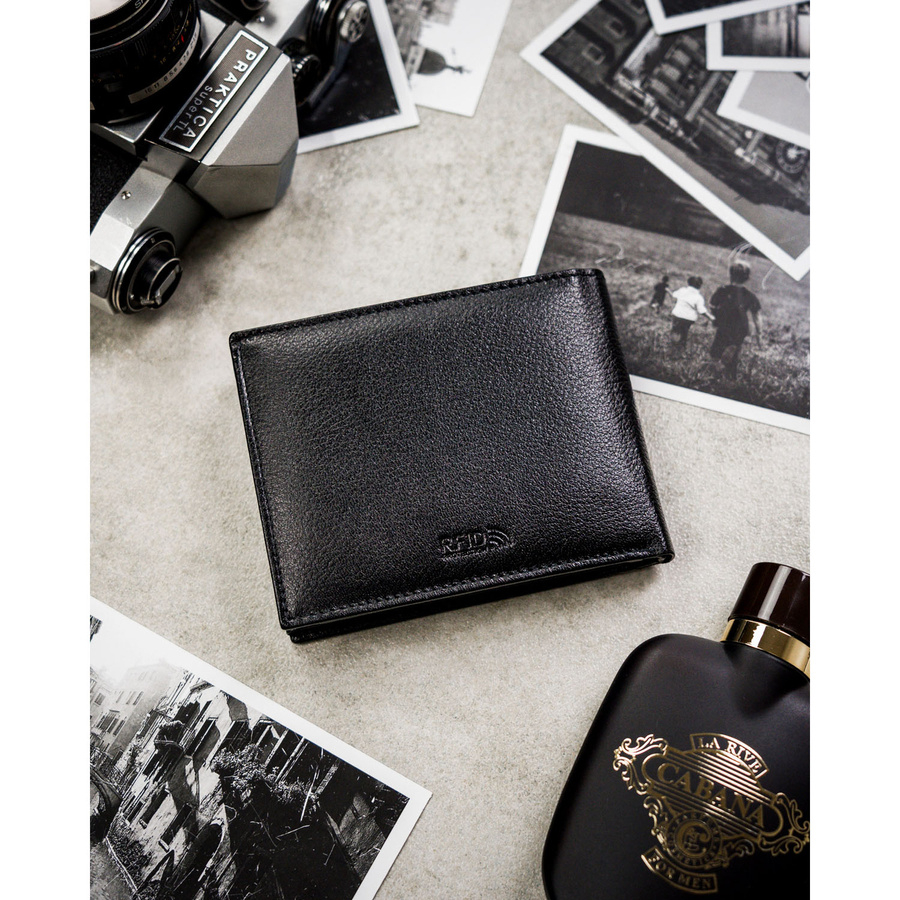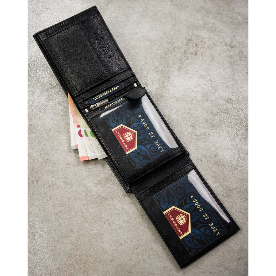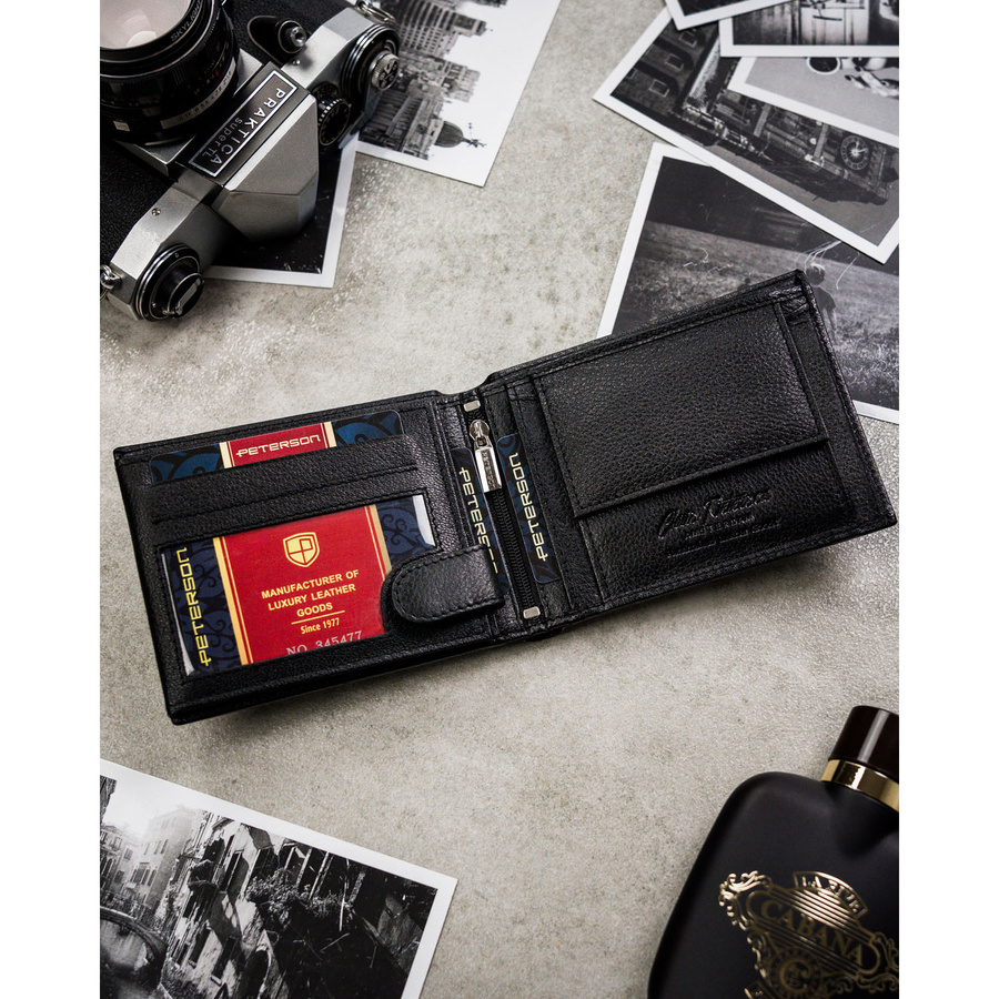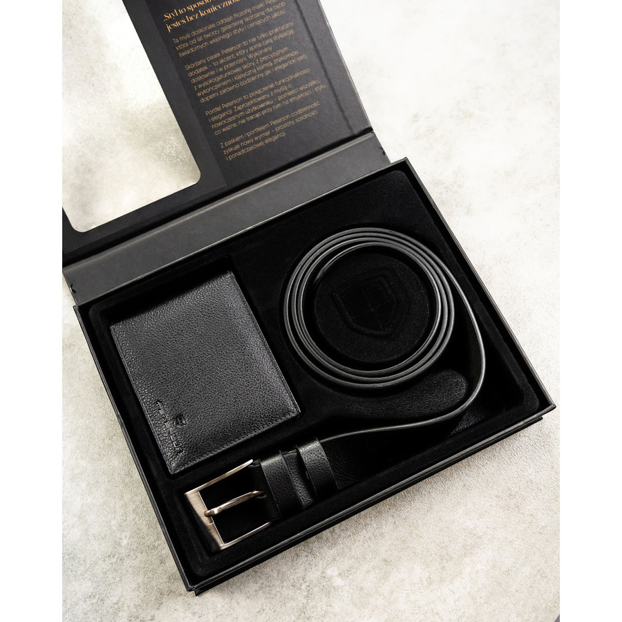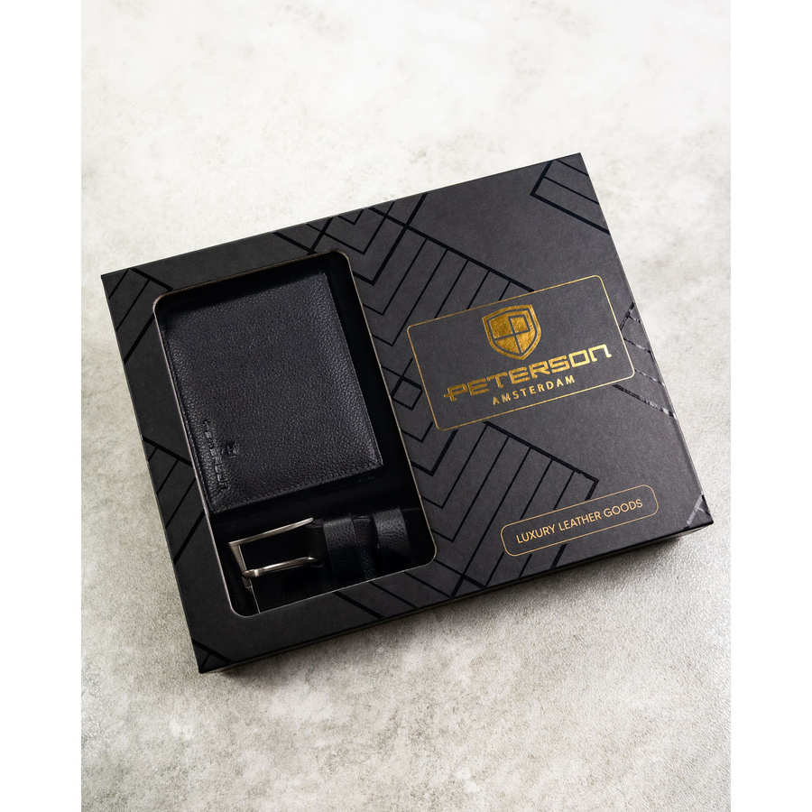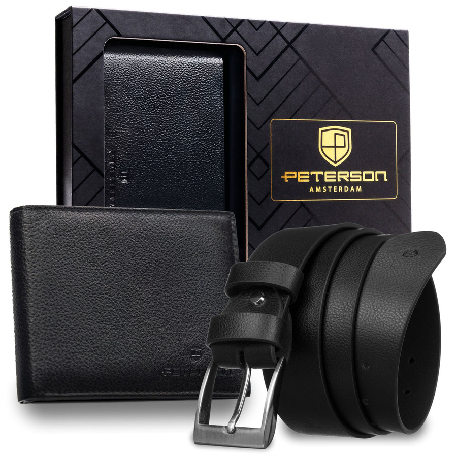 Zestaw prezentowy: skórzany, poziomy portfel męski w czarnym kolorze z systemem RFID i pasek ze skóry ekologicznej - Peterson