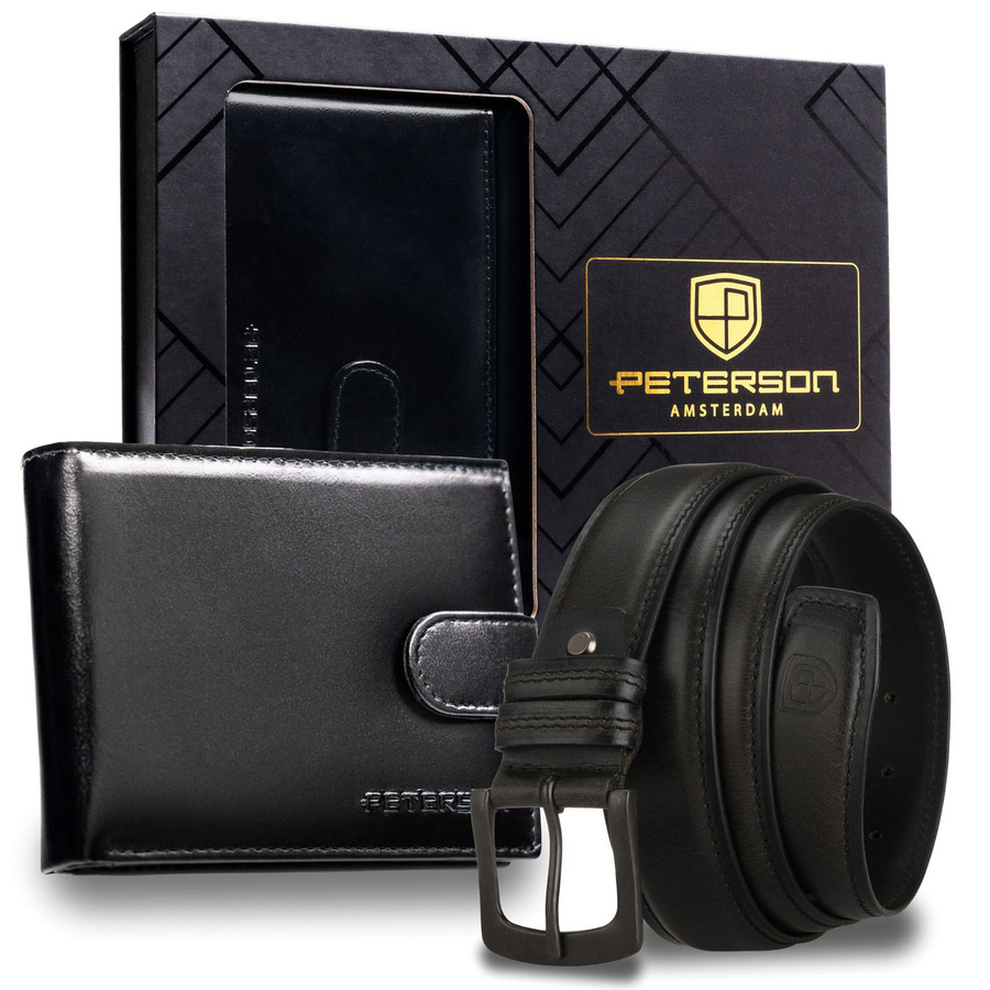 Zestaw prezentowy: skórzany portfel męski w czarnym kolorze i czarny pasek ze skóry naturalnej - Peterson