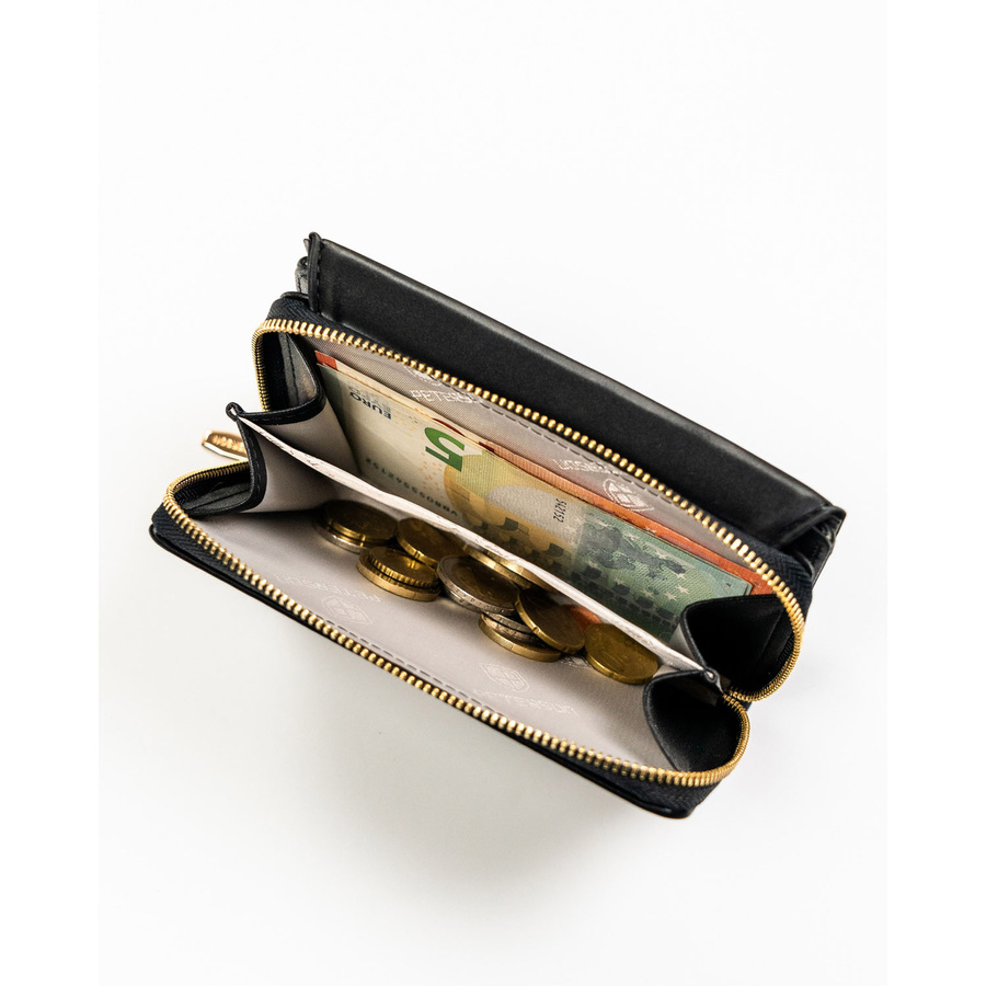 • Podwójna kieszeń na bilon zamykana na suwak.