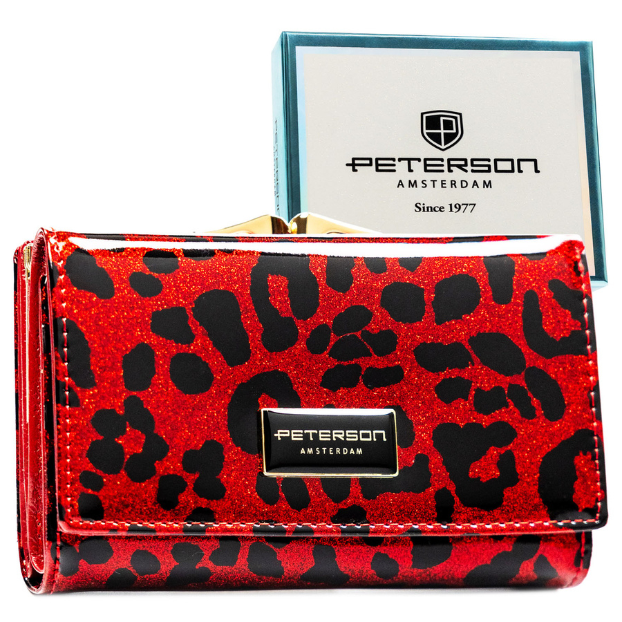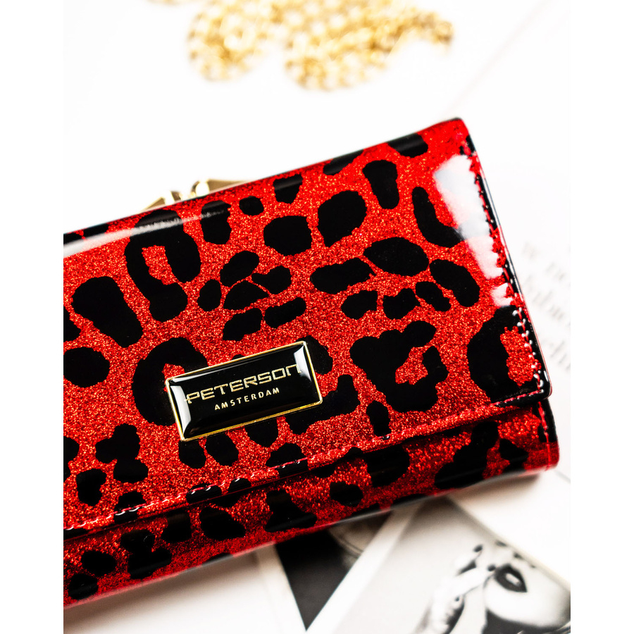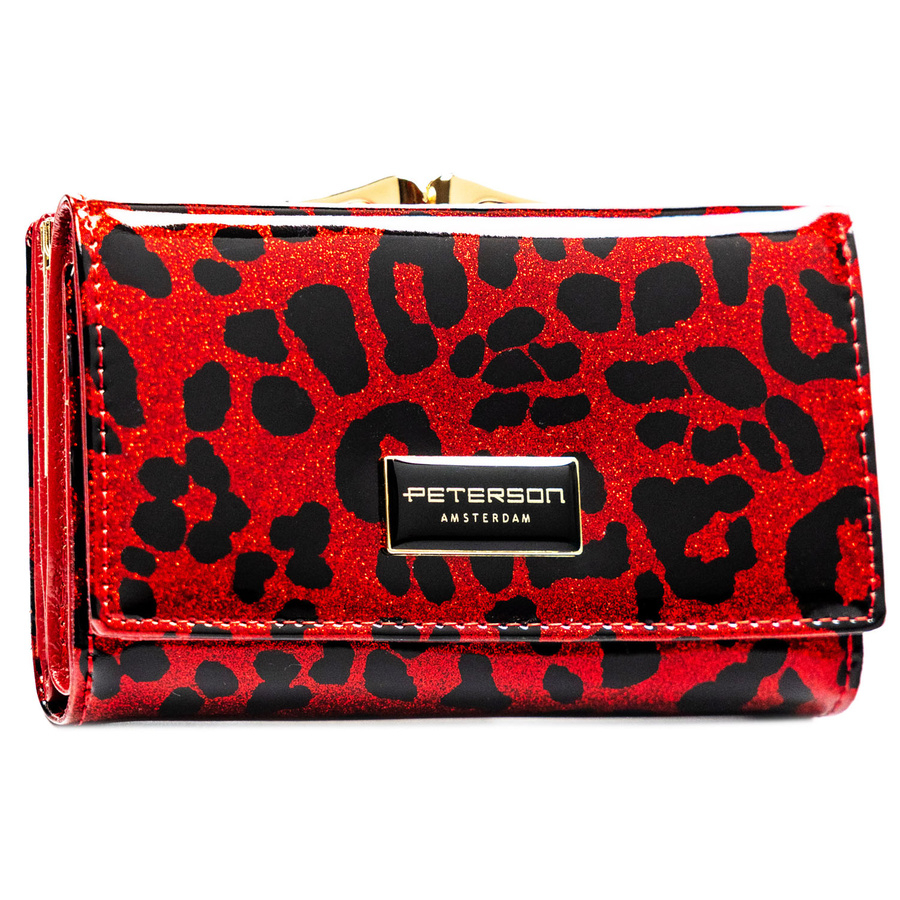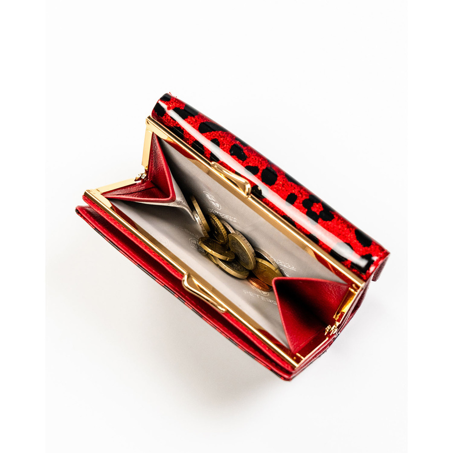 Czerwony portfel damski ze skóry ekologicznej i naturalnej w cętki, zamykany biglem i zatrzaskiem - Peterson
