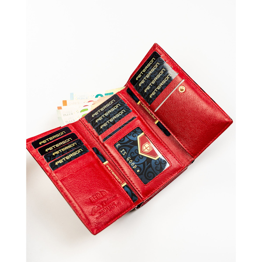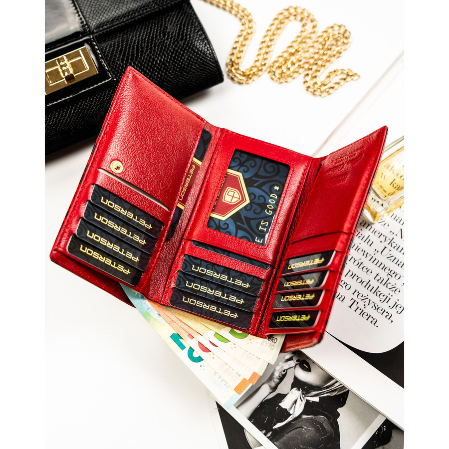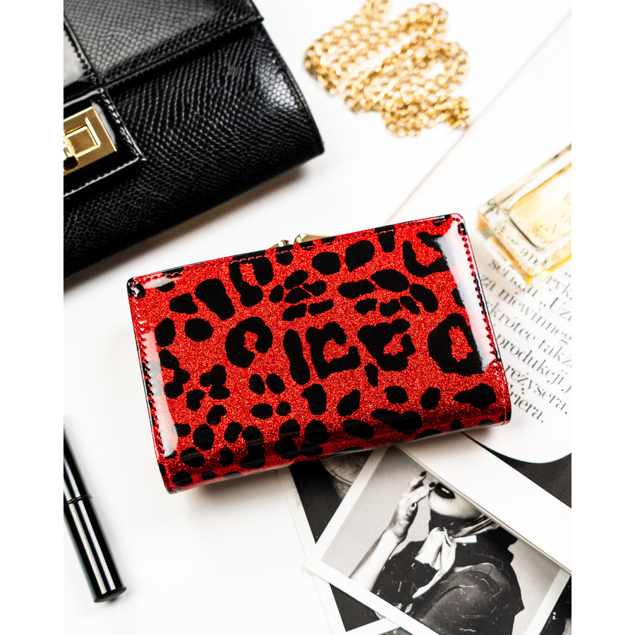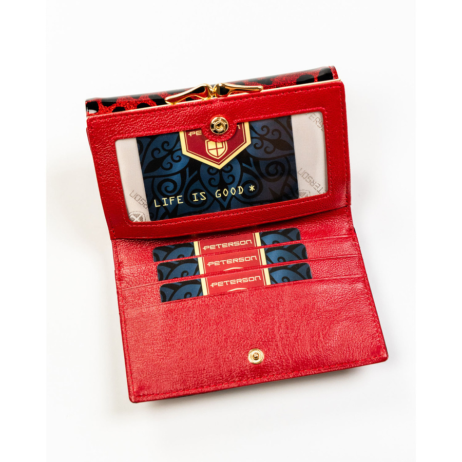 Czerwony portfel damski ze skóry ekologicznej i naturalnej w cętki, zamykany biglem i zatrzaskiem - Peterson