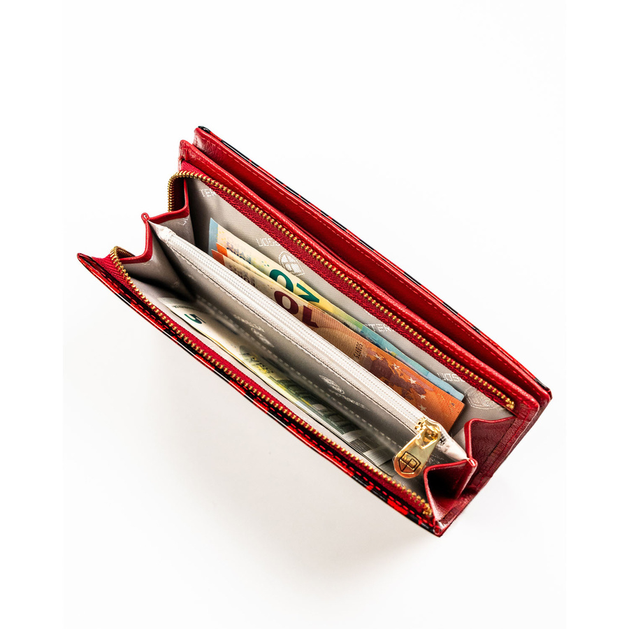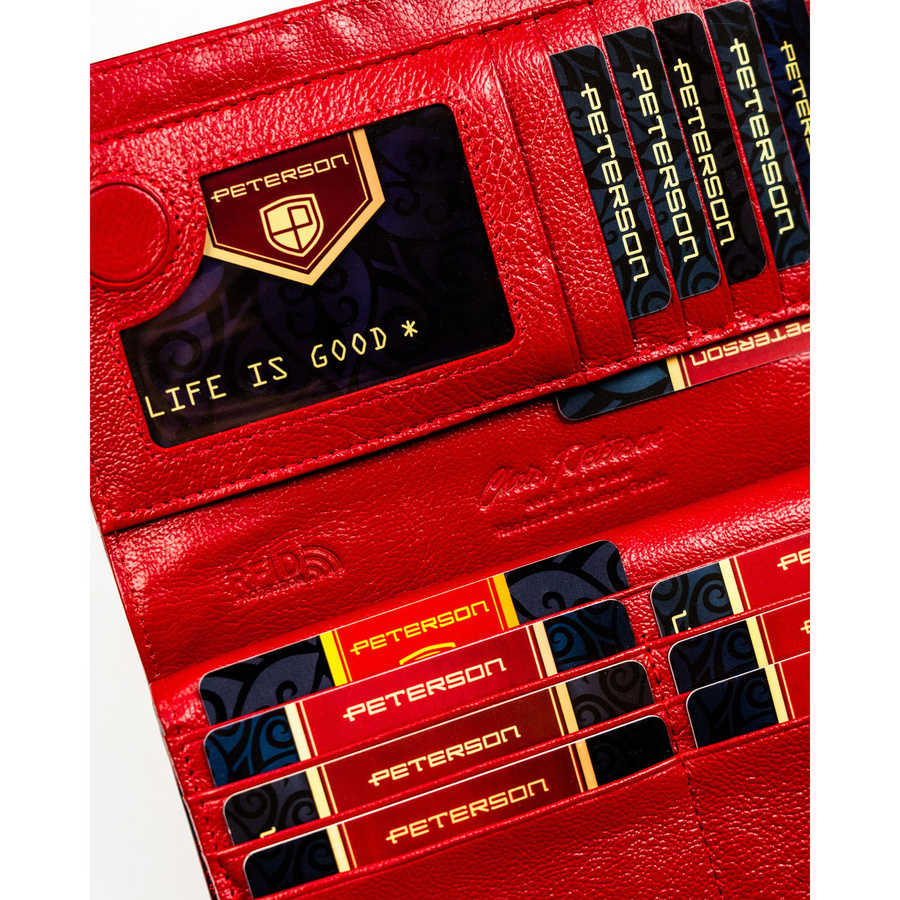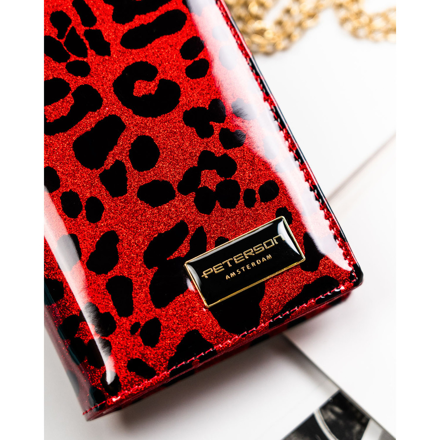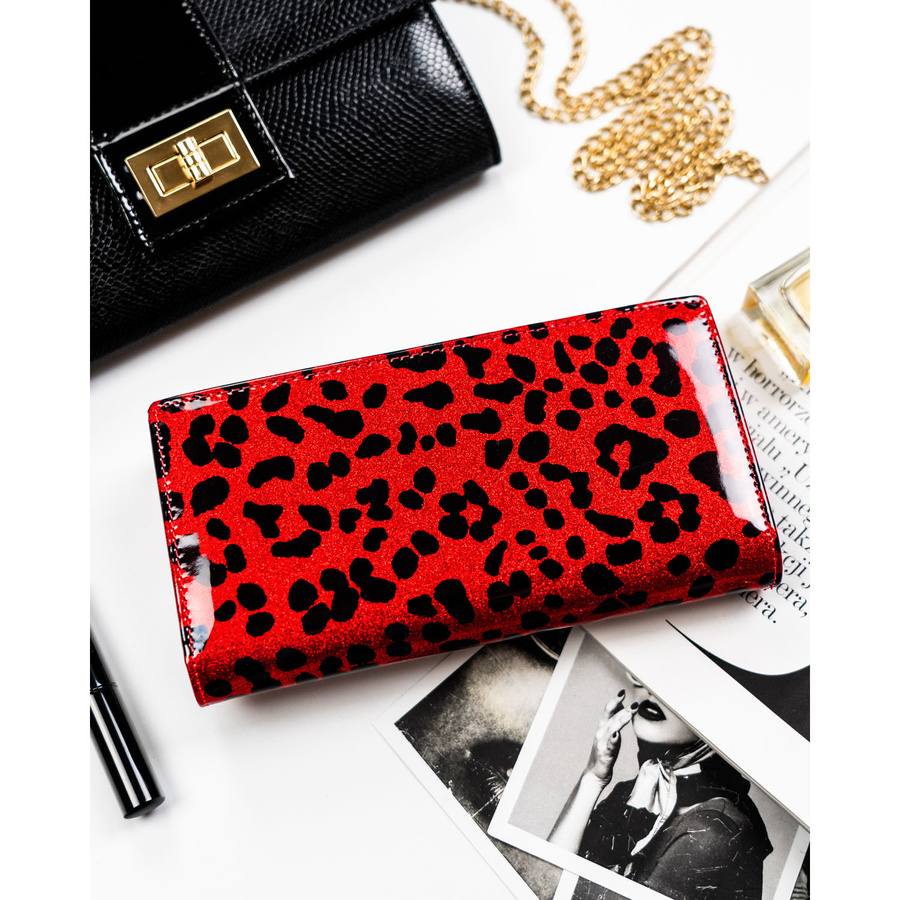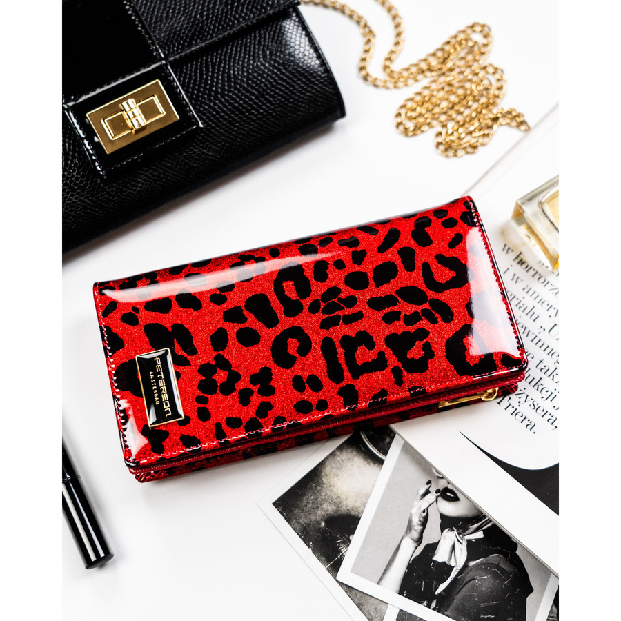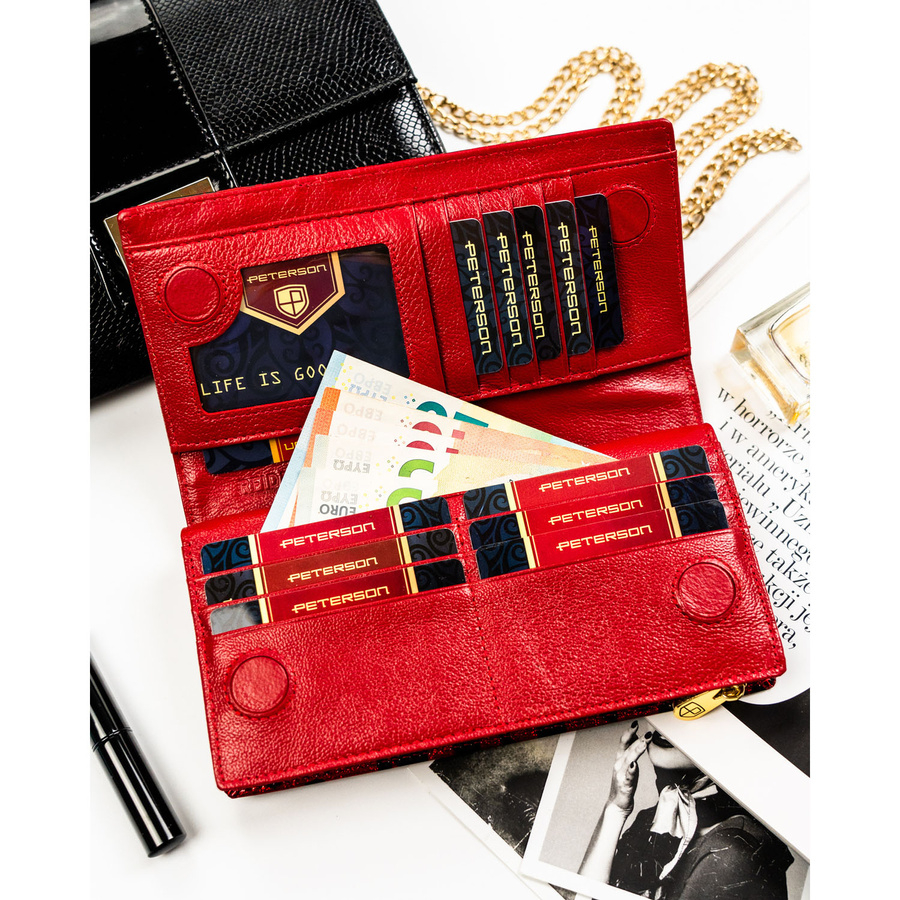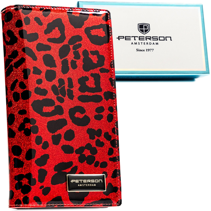 Duży, czerwony, pionowy portfel damski ze skóry ekologicznej i naturalnej w cętki zamykany magnesem - Peterson