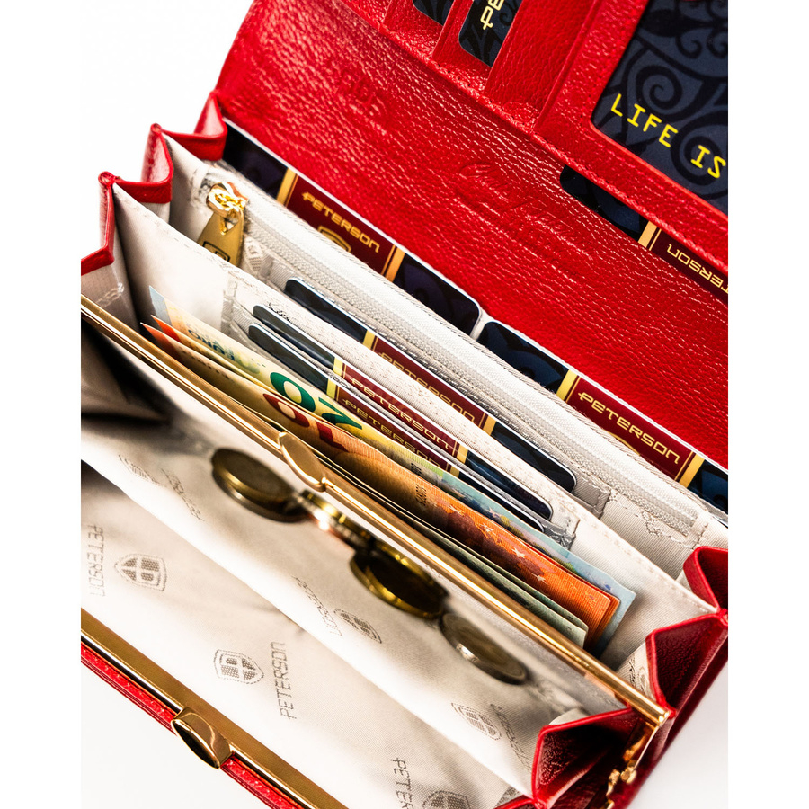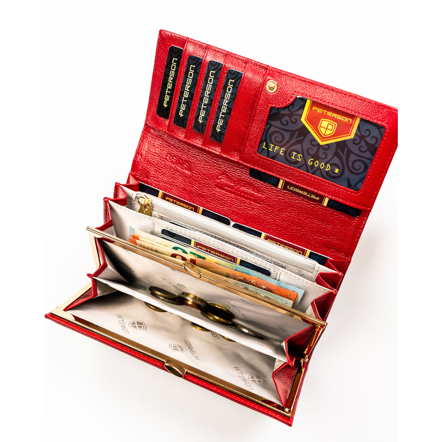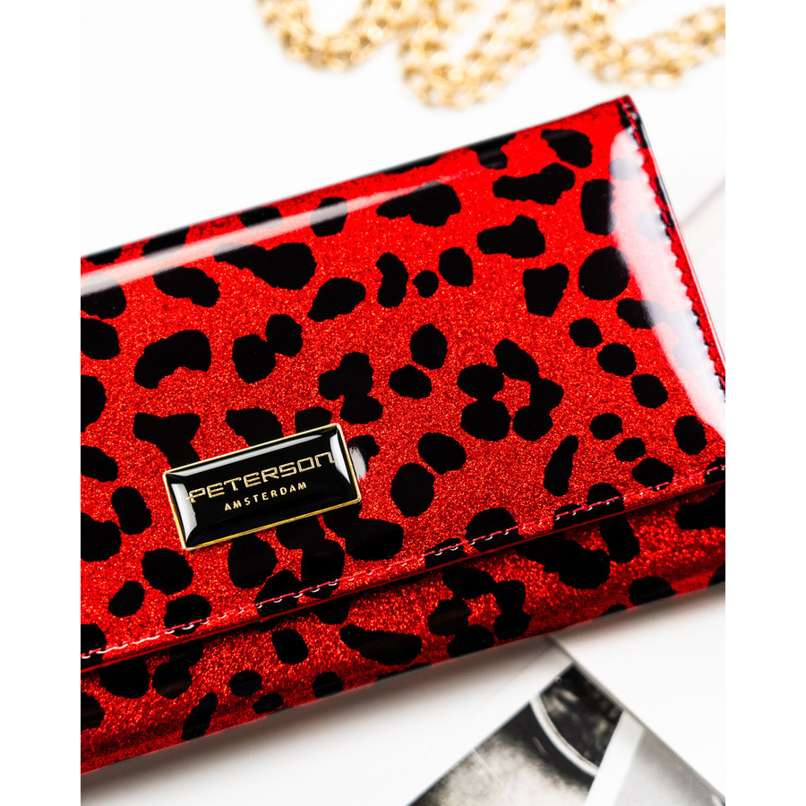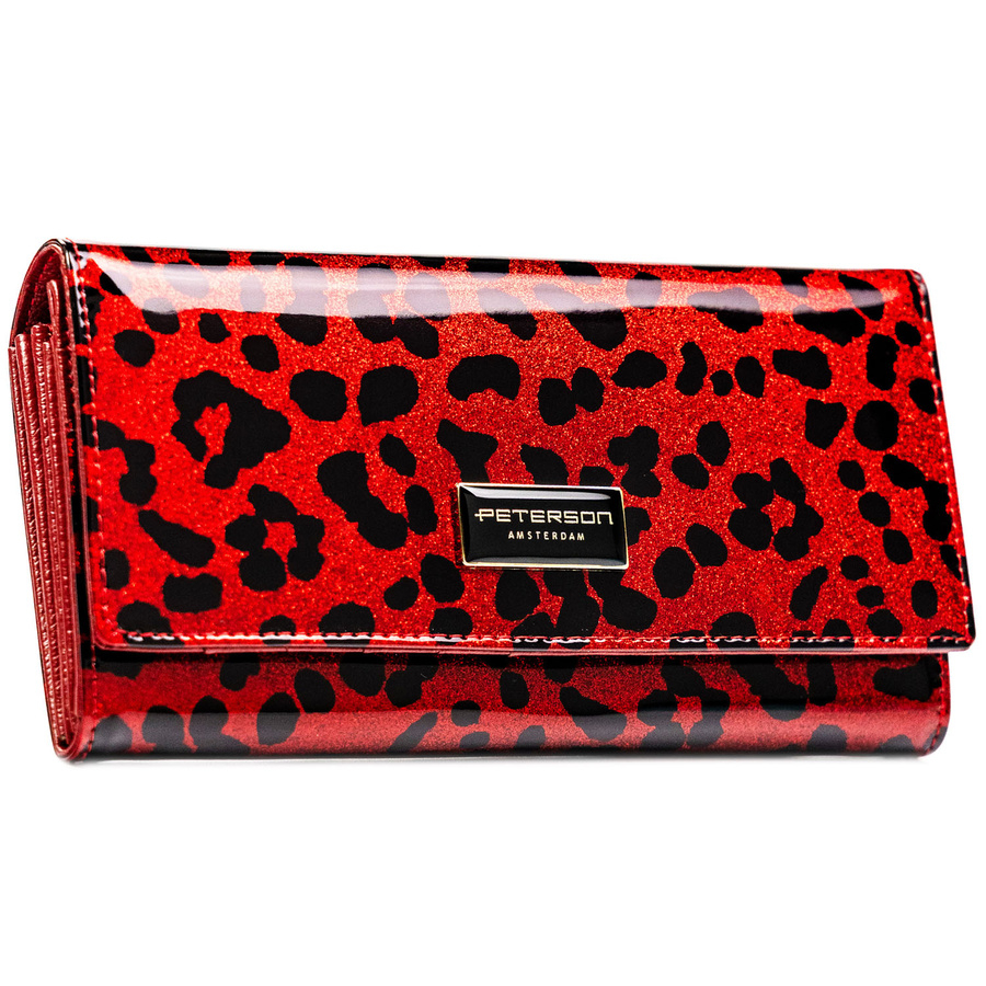 Czerwony, duży portfel damski ze skóry ekologicznej i naturalnej w cętki, zamykany zatrzaskiem - Peterson