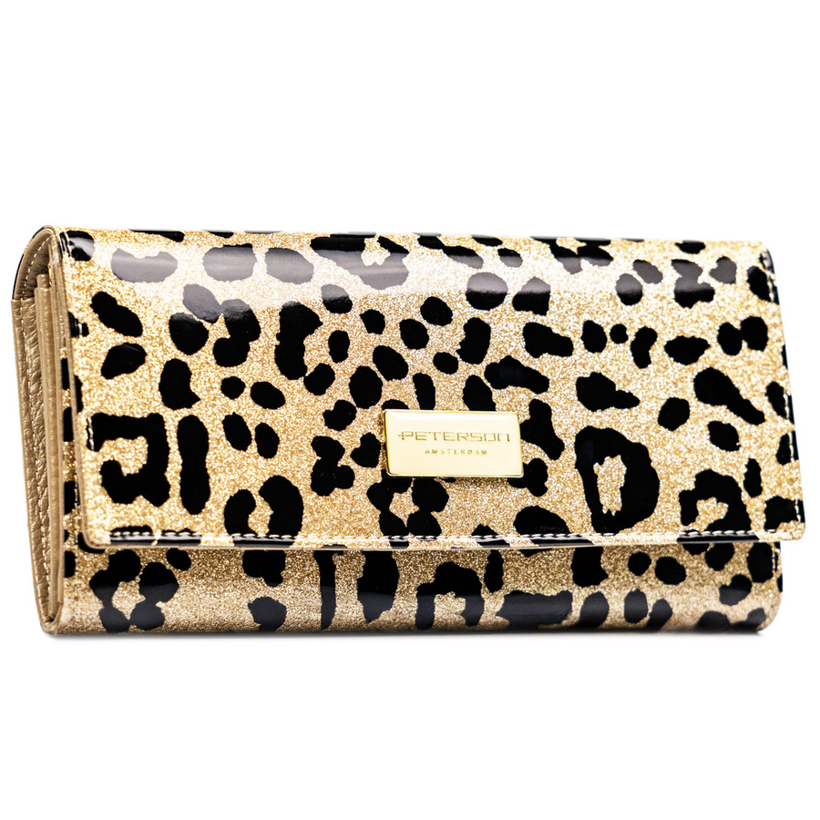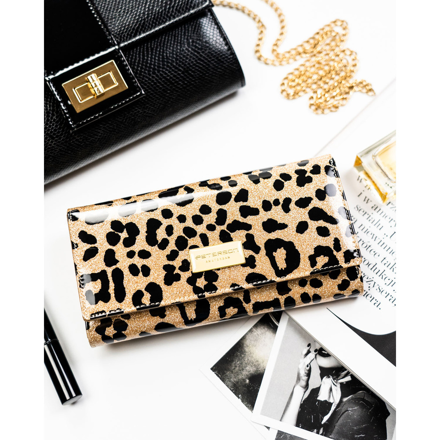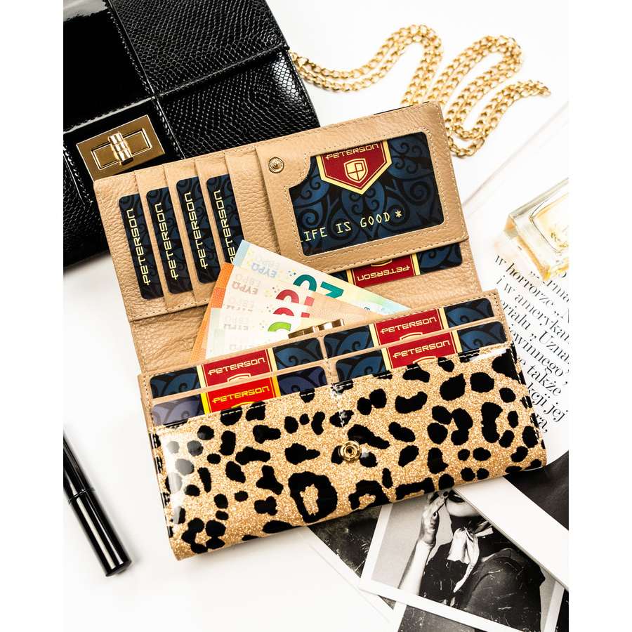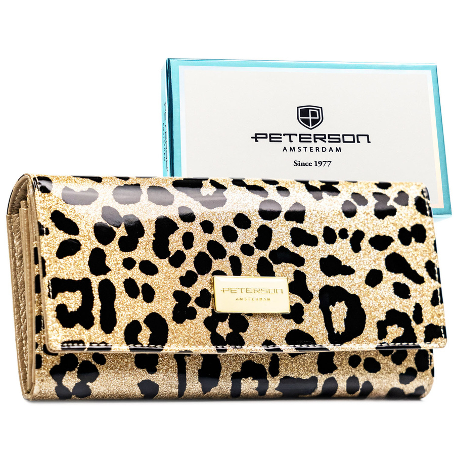 Złoty, duży portfel damski ze skóry ekologicznej i naturalnej w cętki, zamykany zatrzaskiem - Peterson