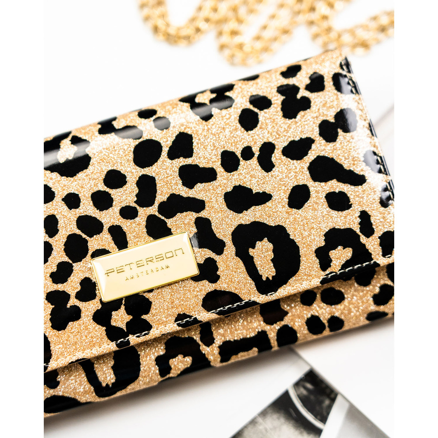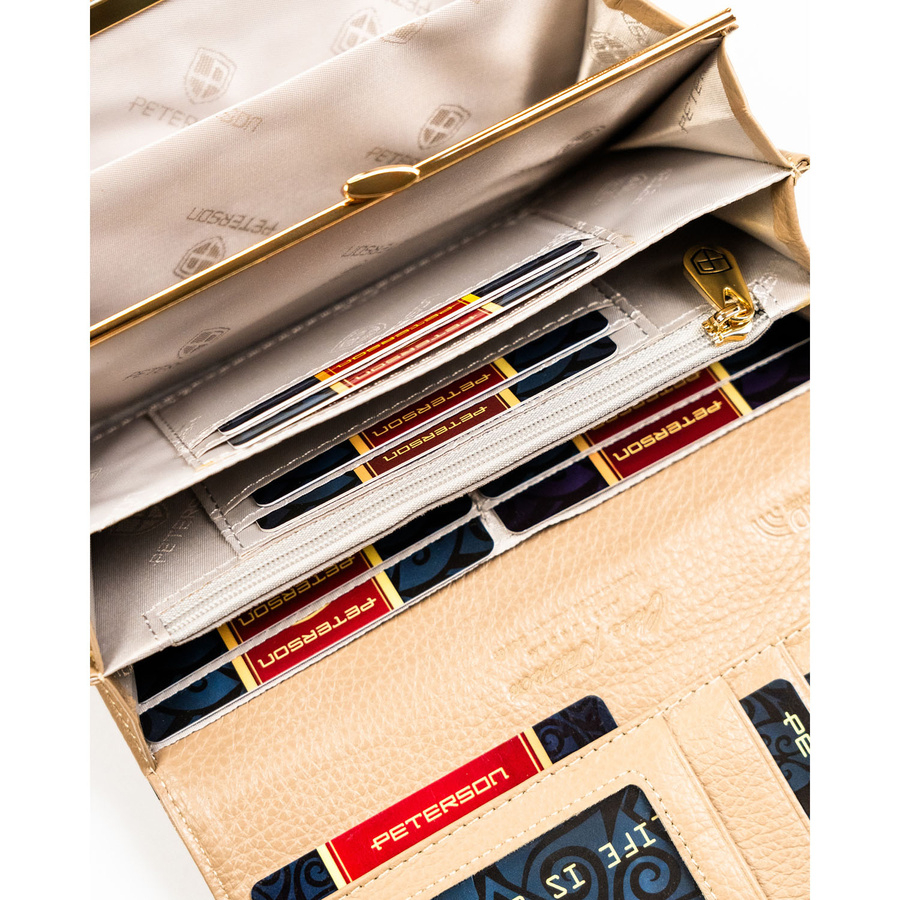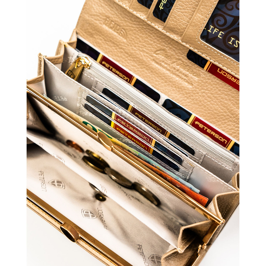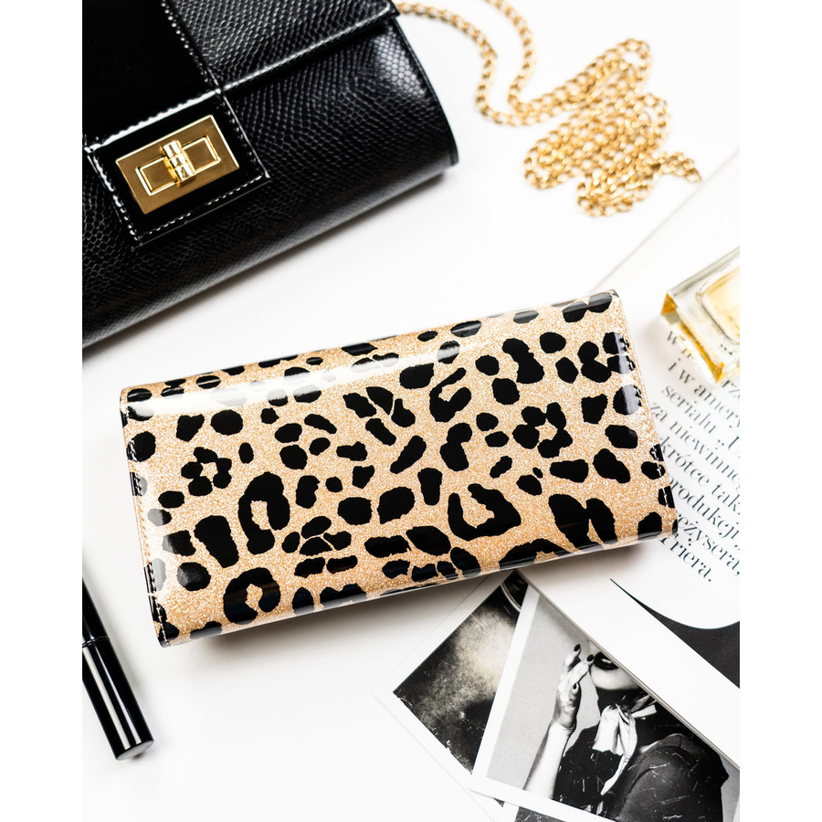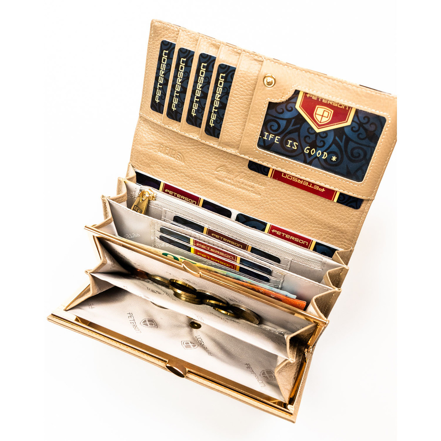 Złoty, duży portfel damski ze skóry ekologicznej i naturalnej w cętki, zamykany zatrzaskiem - Peterson