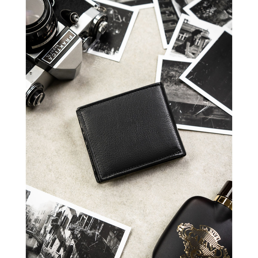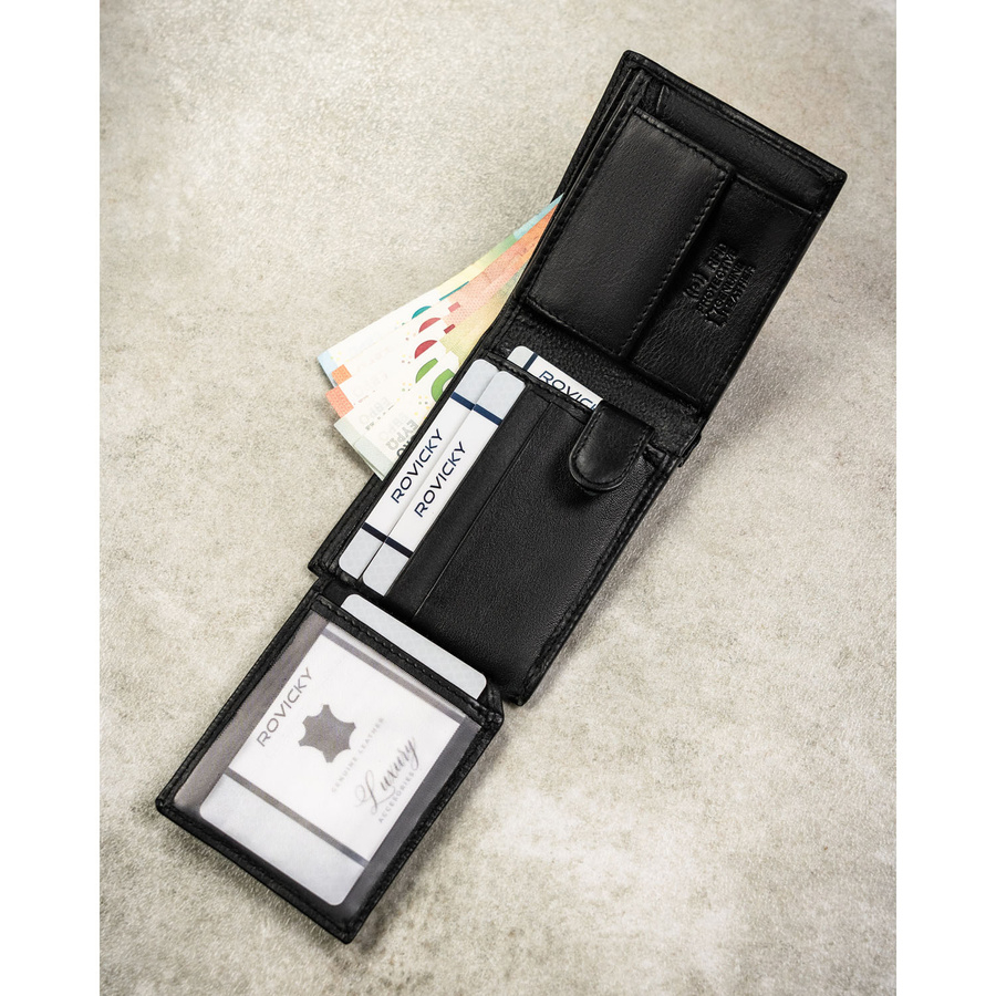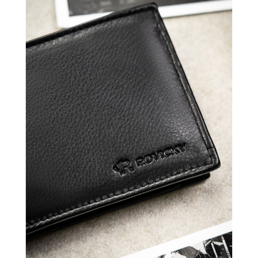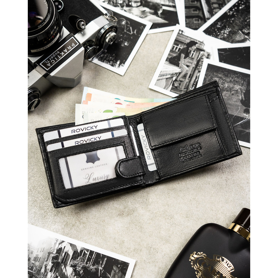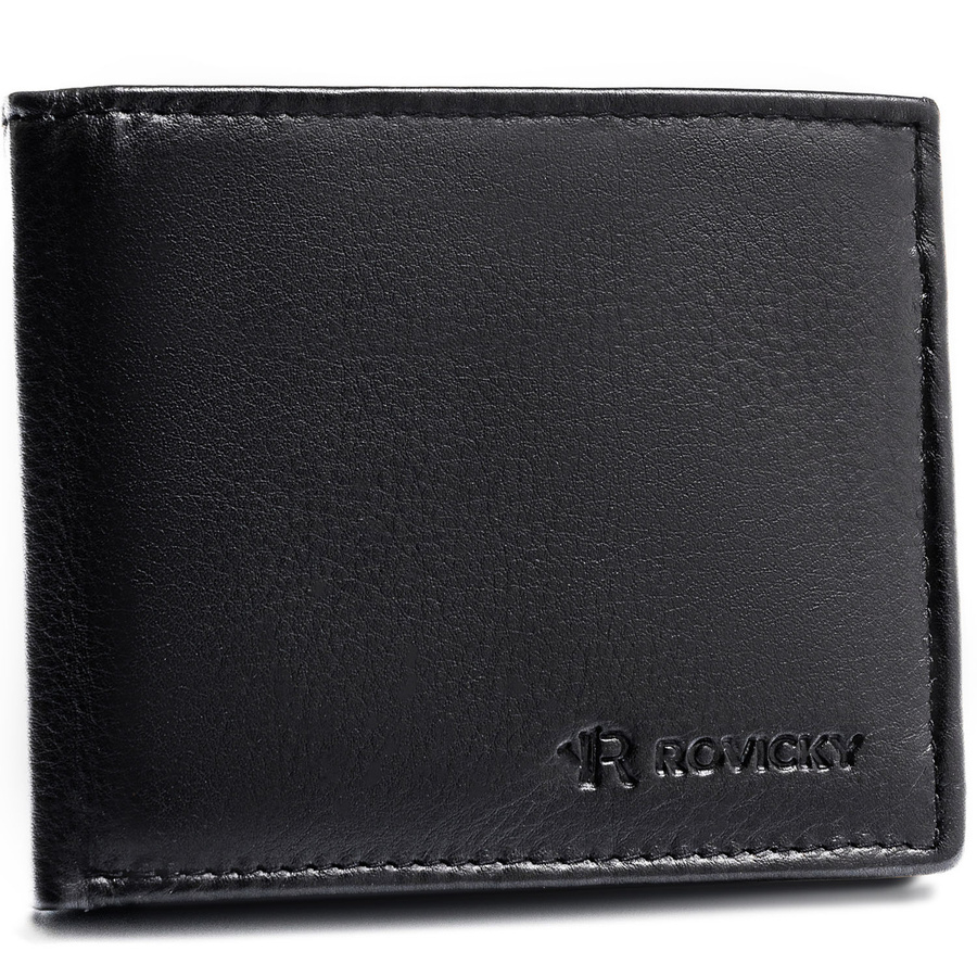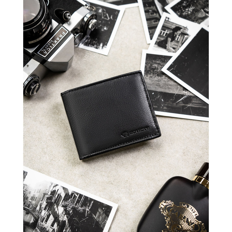 Mały, czarny portfel męski ze skóry naturalnej wyposażony w system RFID - Rovicky
