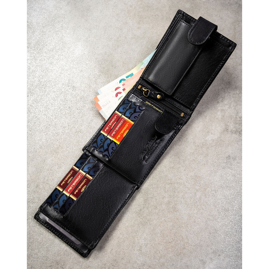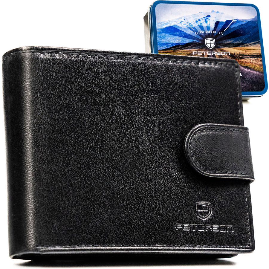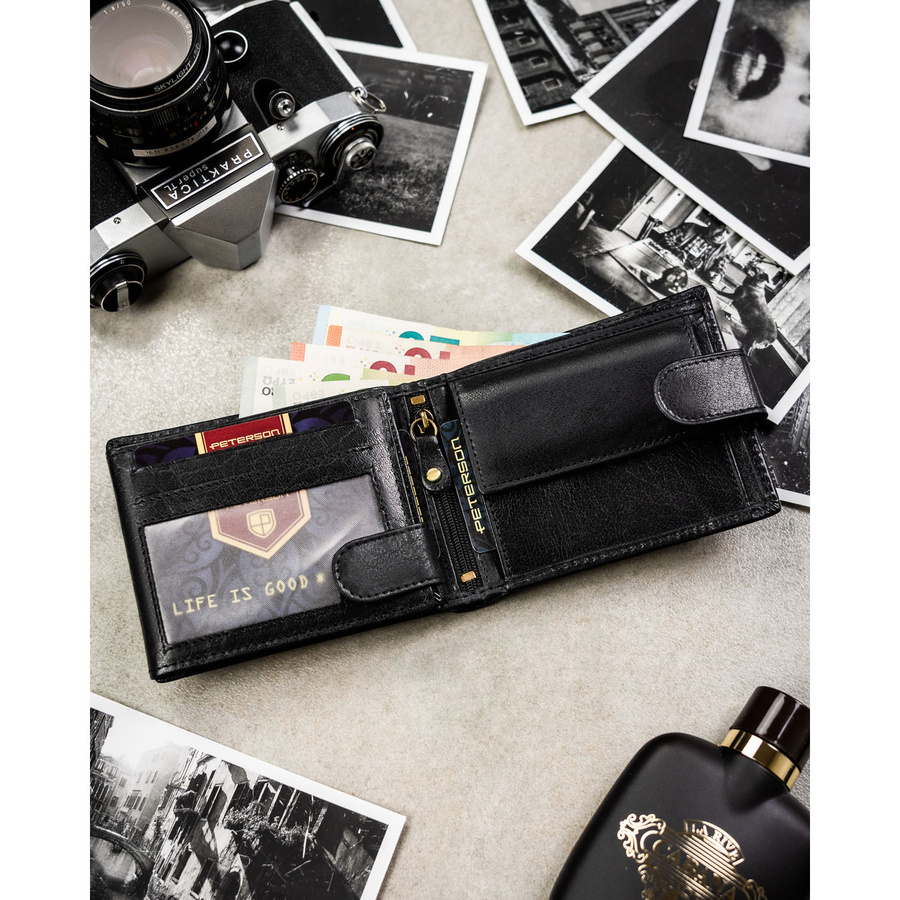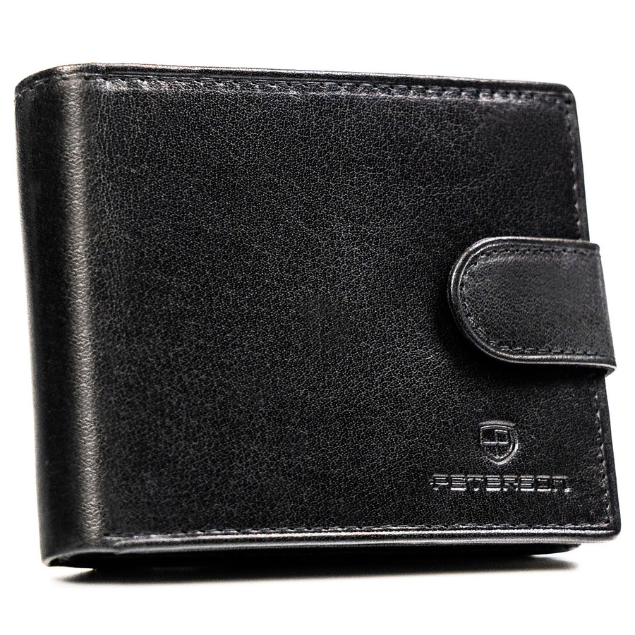 Poziomy portfel męski ze skóry naturalnej w czarnym kolorze wyposażony w system RFID - Peterson