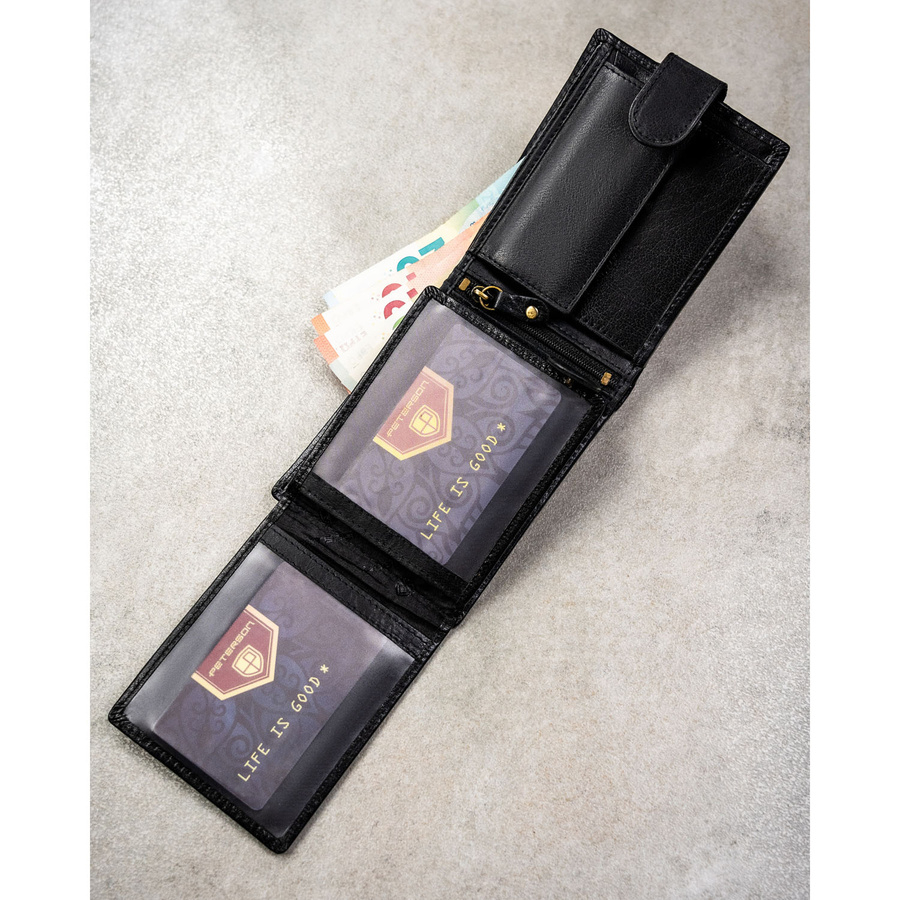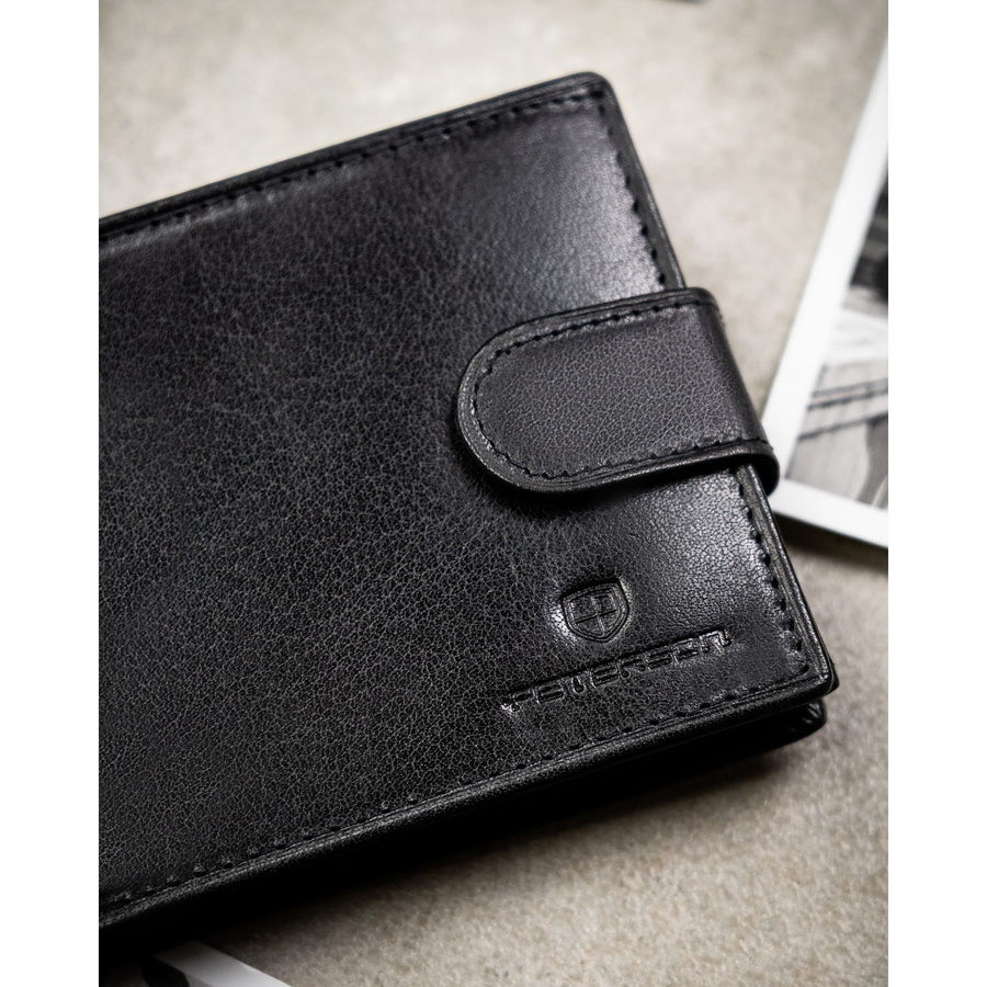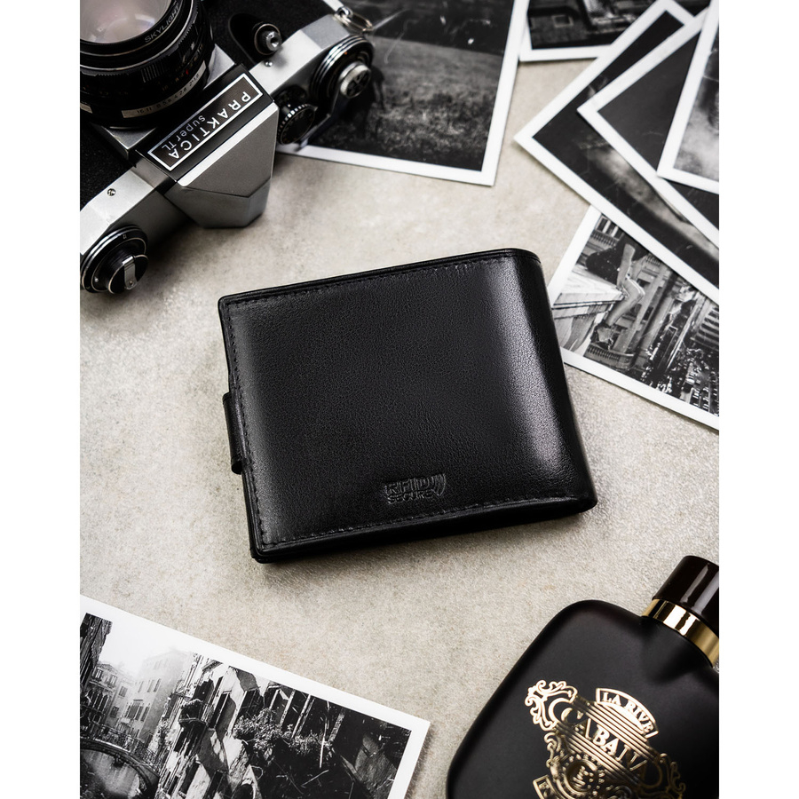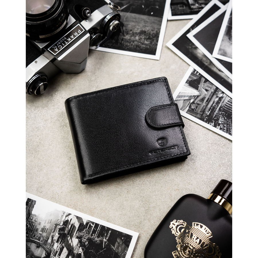 Poziomy portfel męski ze skóry naturalnej w czarnym kolorze wyposażony w system RFID - Peterson