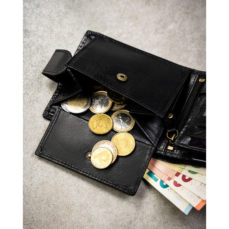 - Kieszonka na bilon z zatrzaskiem, która dobrze trzyma monety na miejscu.