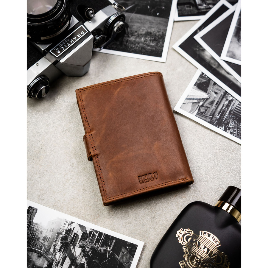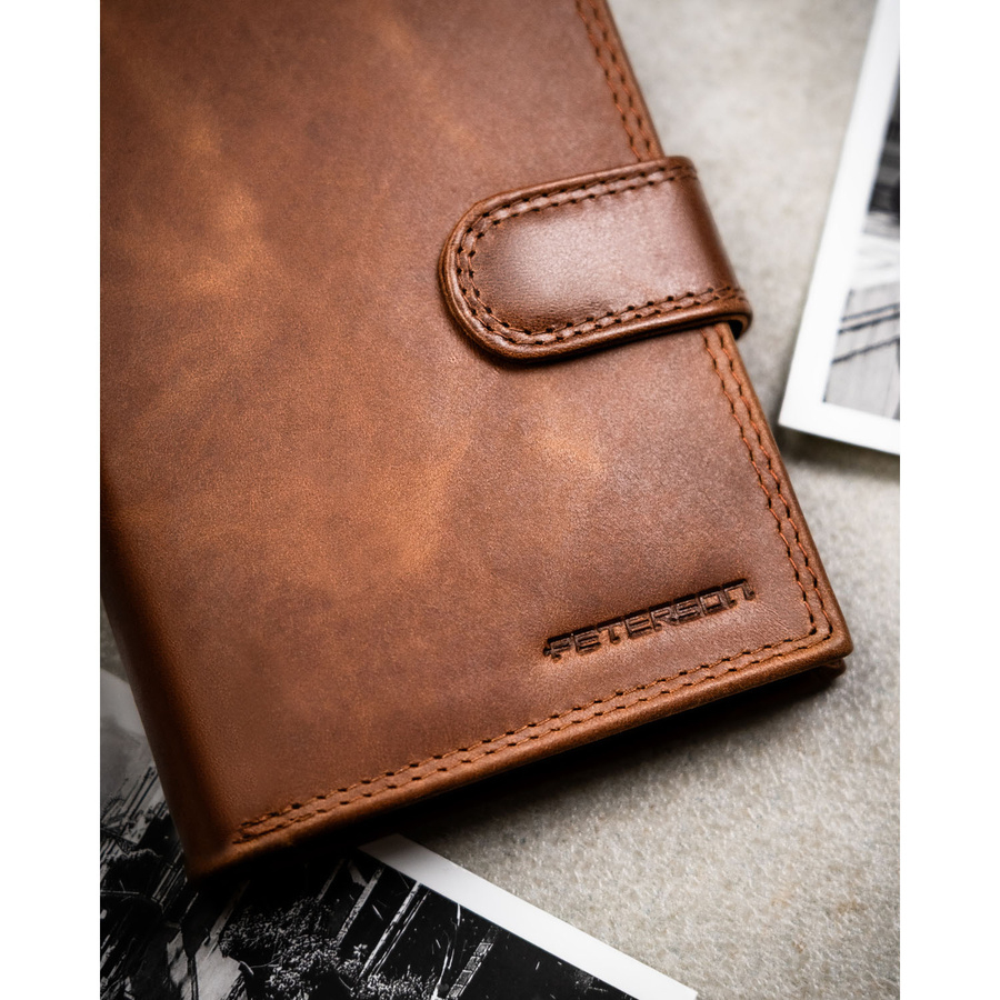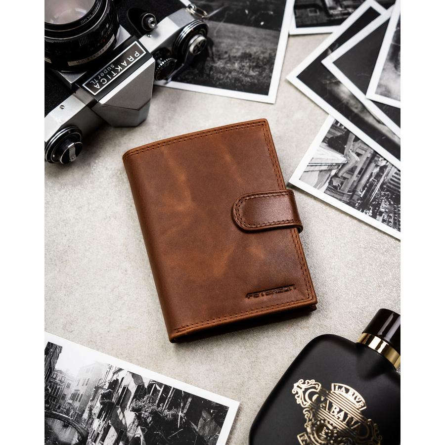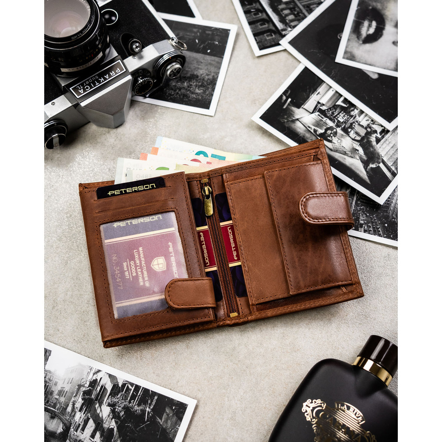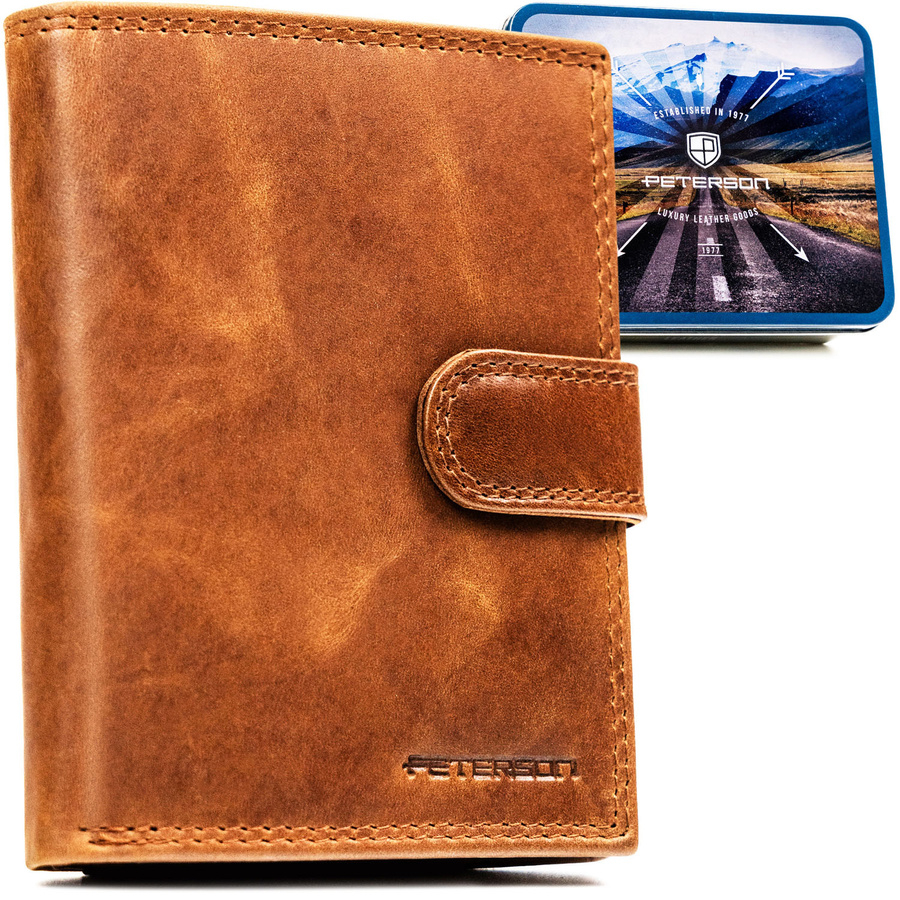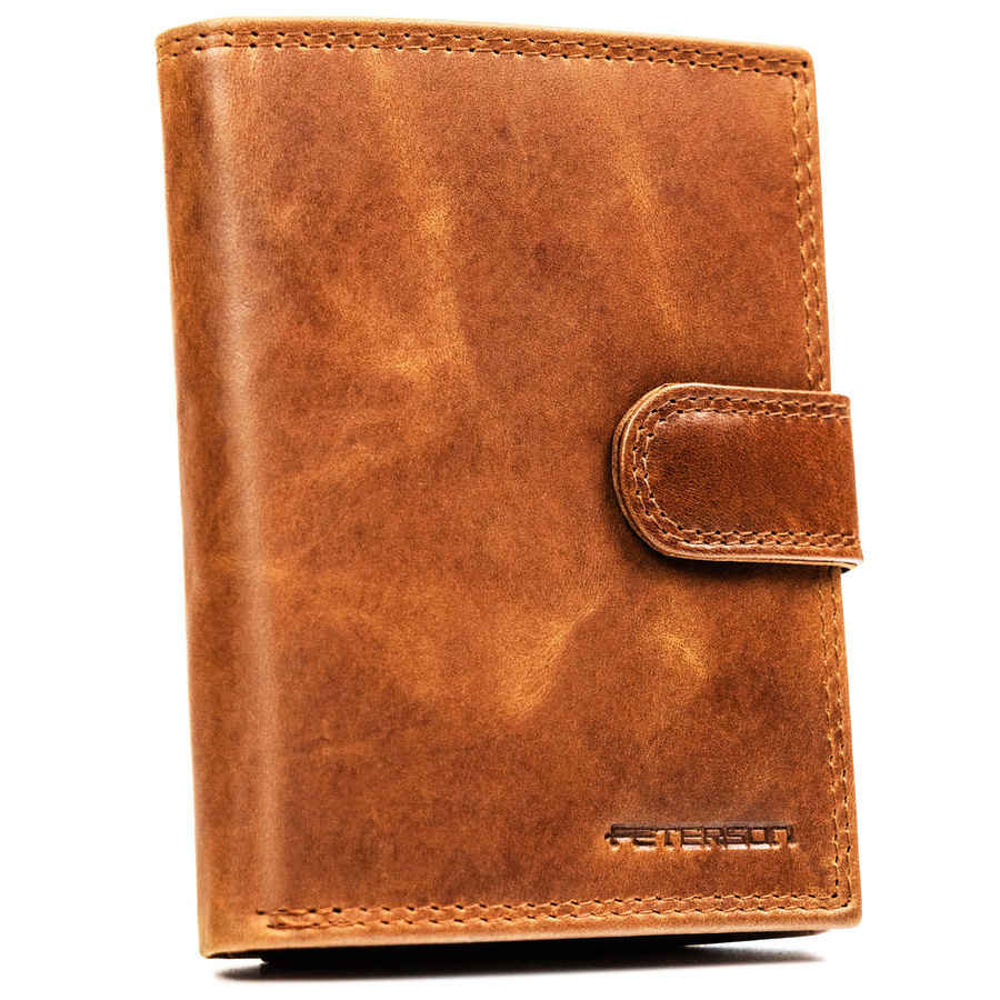 Pionowy portfel męski ze skóry naturalnej w brązowym kolorze zamykany na zatrzask - Peterson