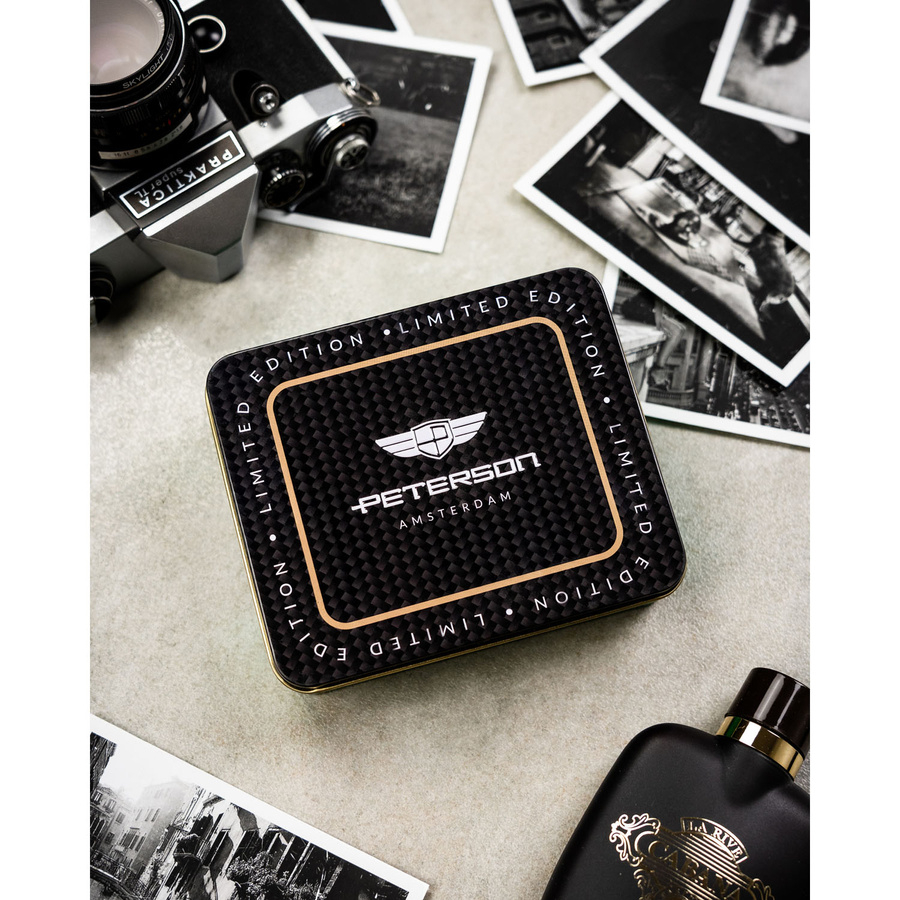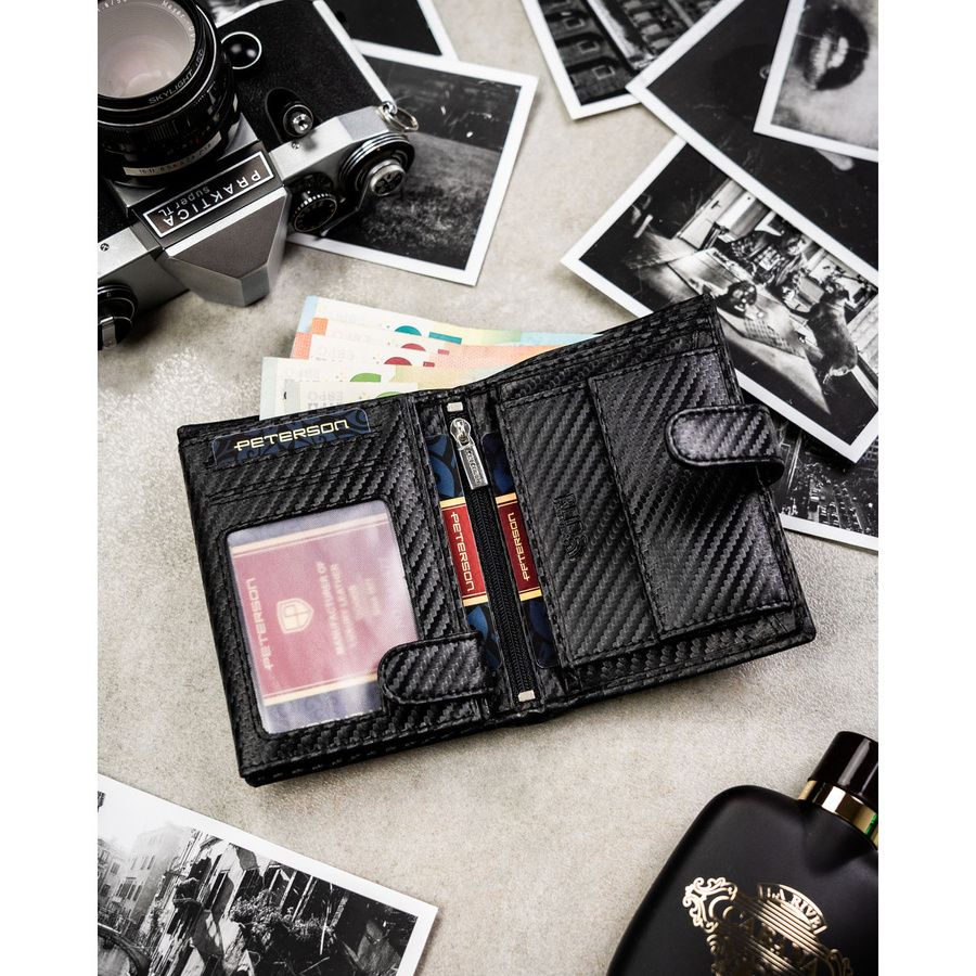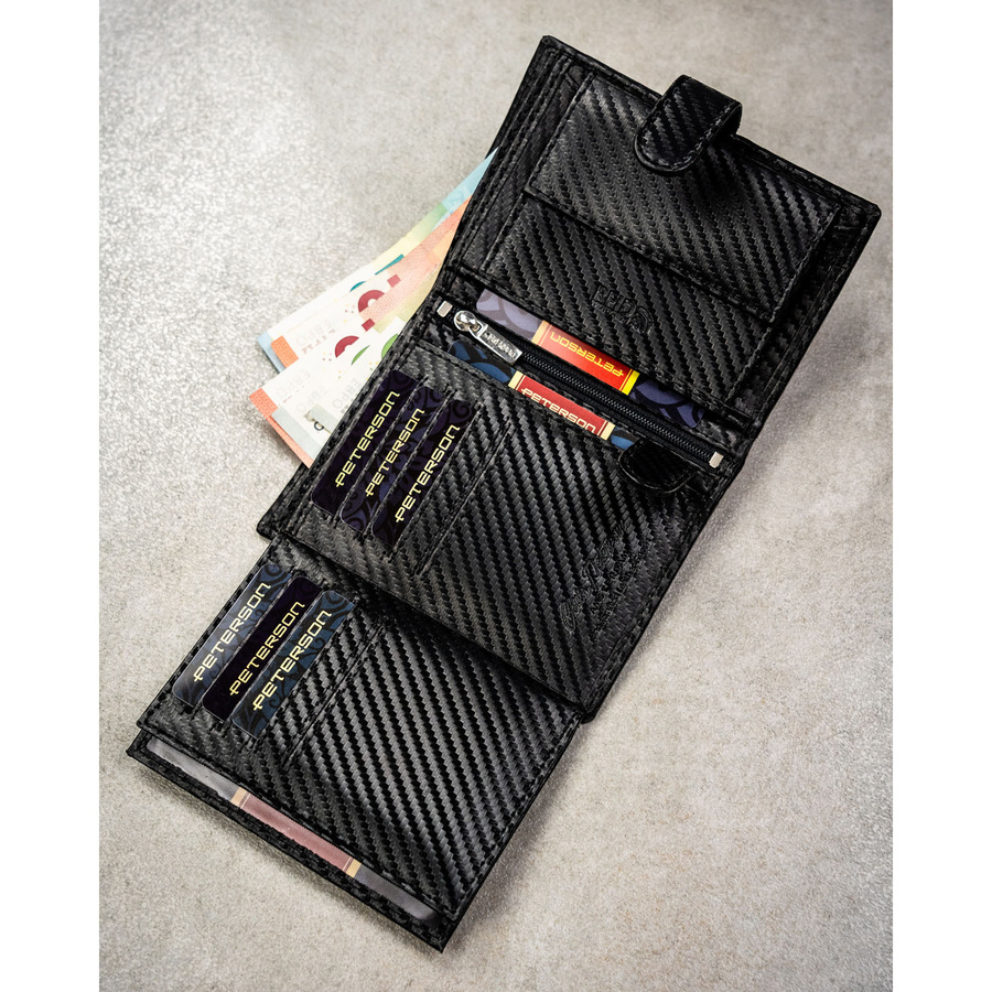 Pionowy portfel męski ze skóry naturalnej w czarnym kolorze wyposażony w system RFID, w zestawie z brelokiem - Peterson