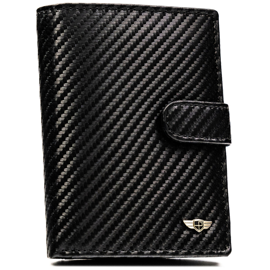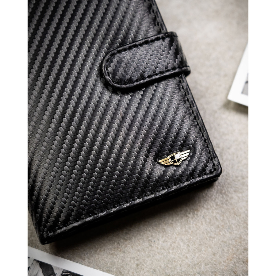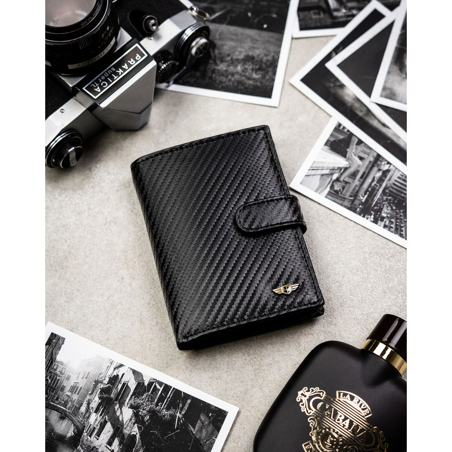 Stylowy, solidnie wykonany portfel męski z naturalnej skóry o carbonowej strukturze to doskonały wybór dla osób, które lubią połączenie klasyki z nowoczesnym akcentem. Zestaw uzupełnia dopasowany brelok, dzięki któremu Twoje klucze również zyskają elegancki charakter.