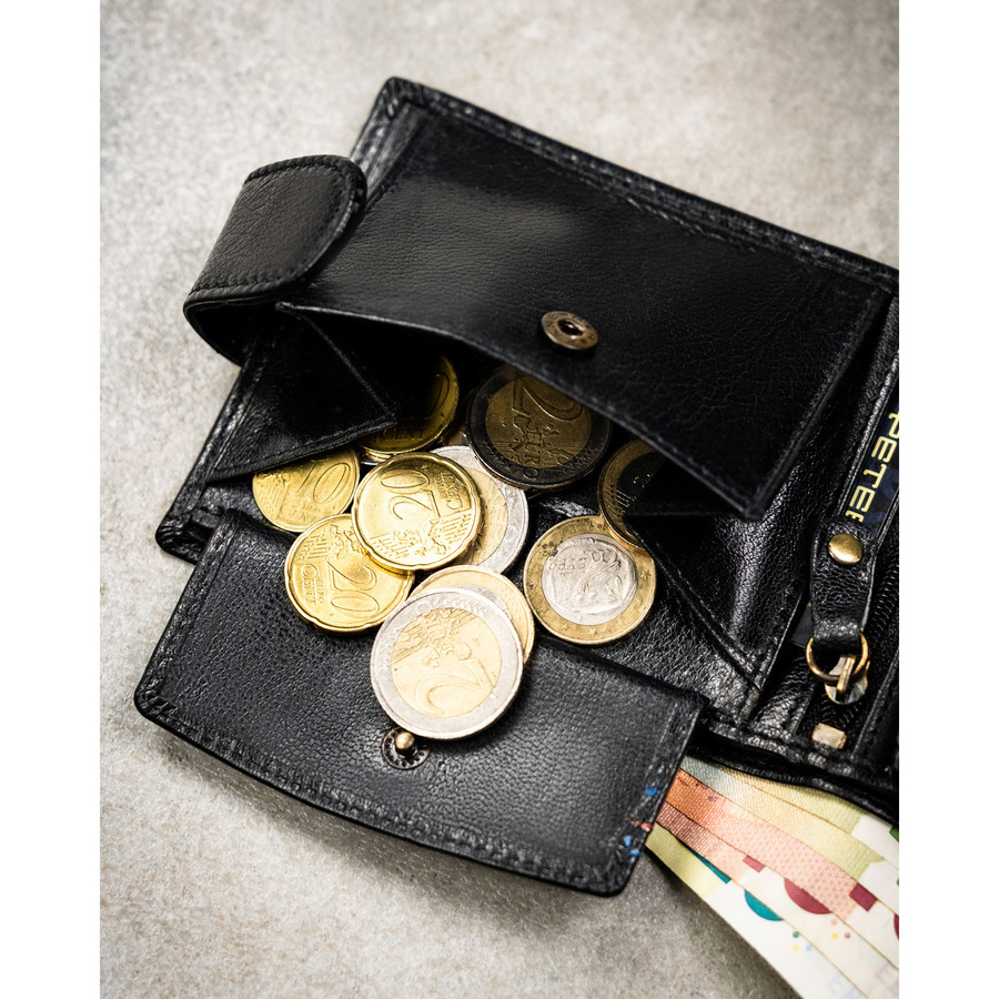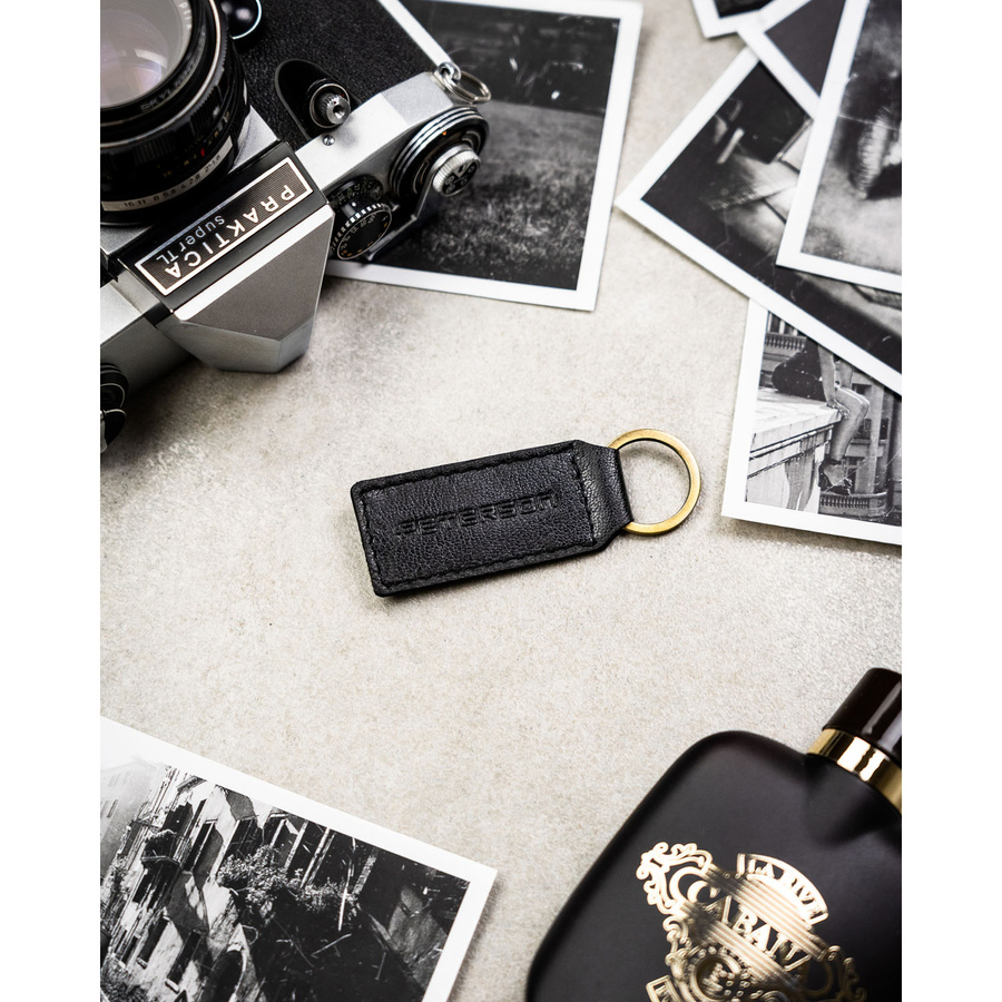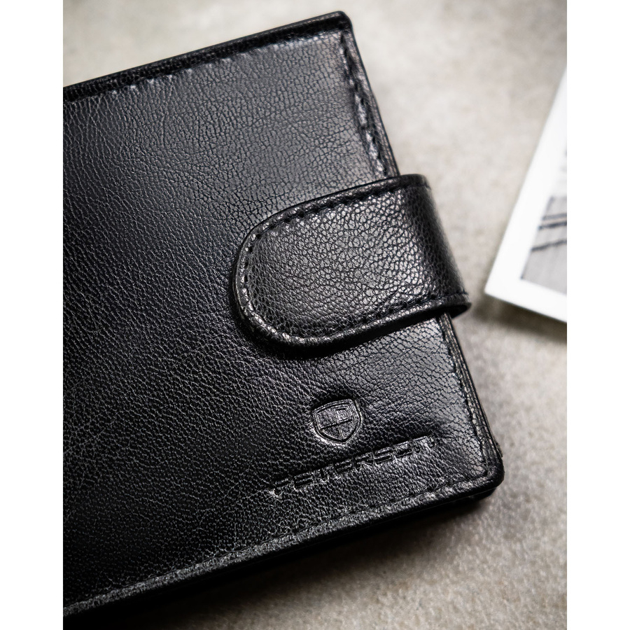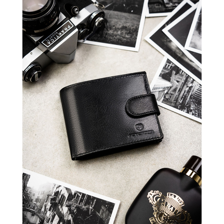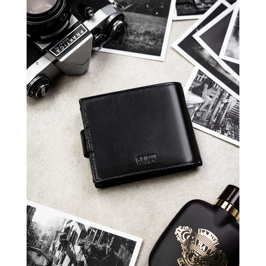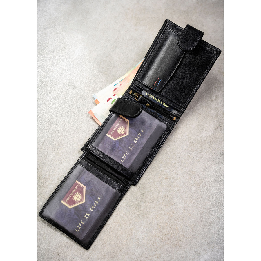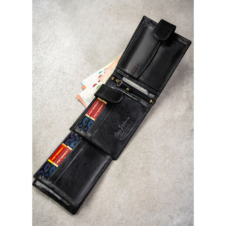 Poziomy portfel męski ze skóry naturalnej w czarnym kolorze w zestawie z brelokiem - Peterson