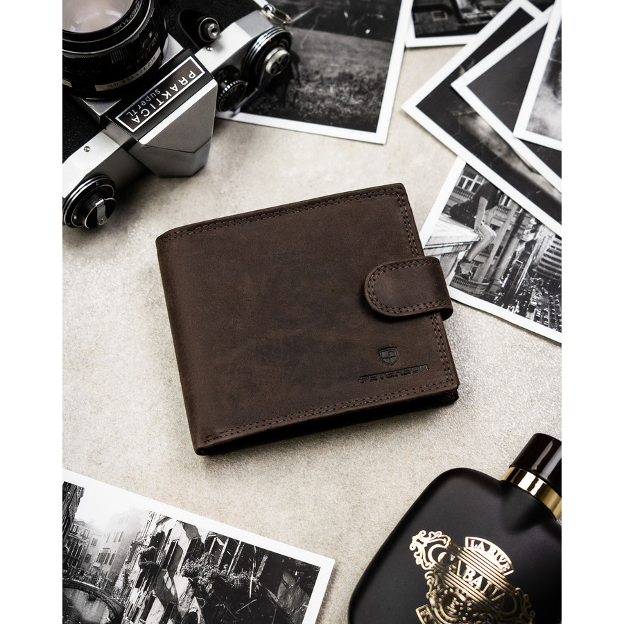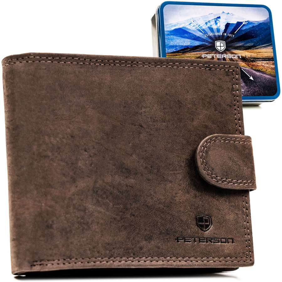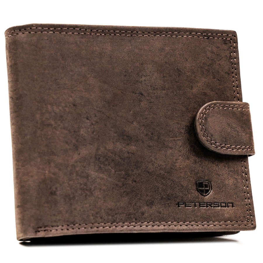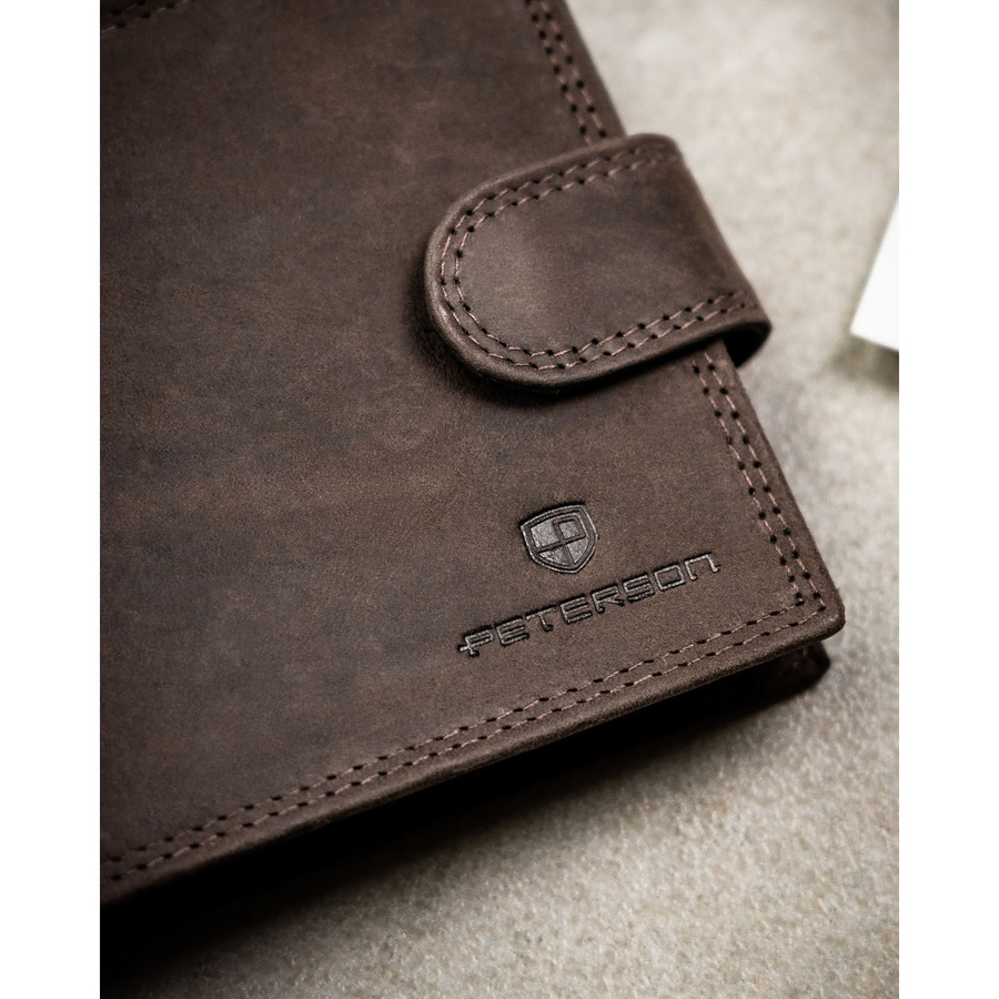 Poziomy portfel męski ze skóry naturalnej w brązowym kolorze zamykany na zatrzask, w zestawie z brelokiem - Peterson