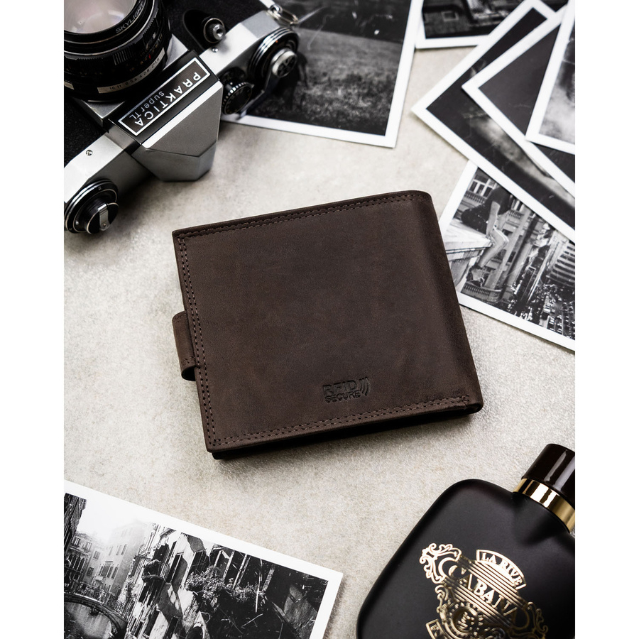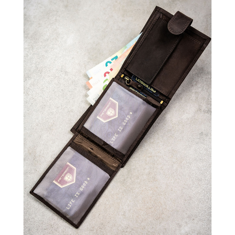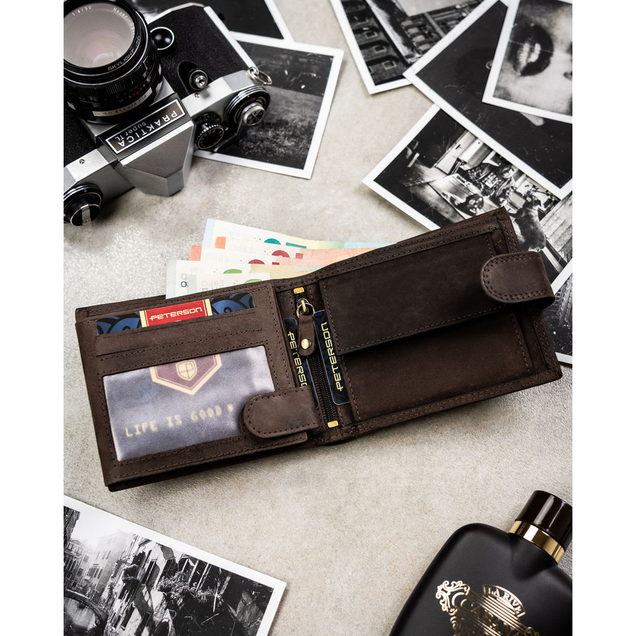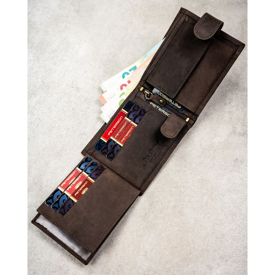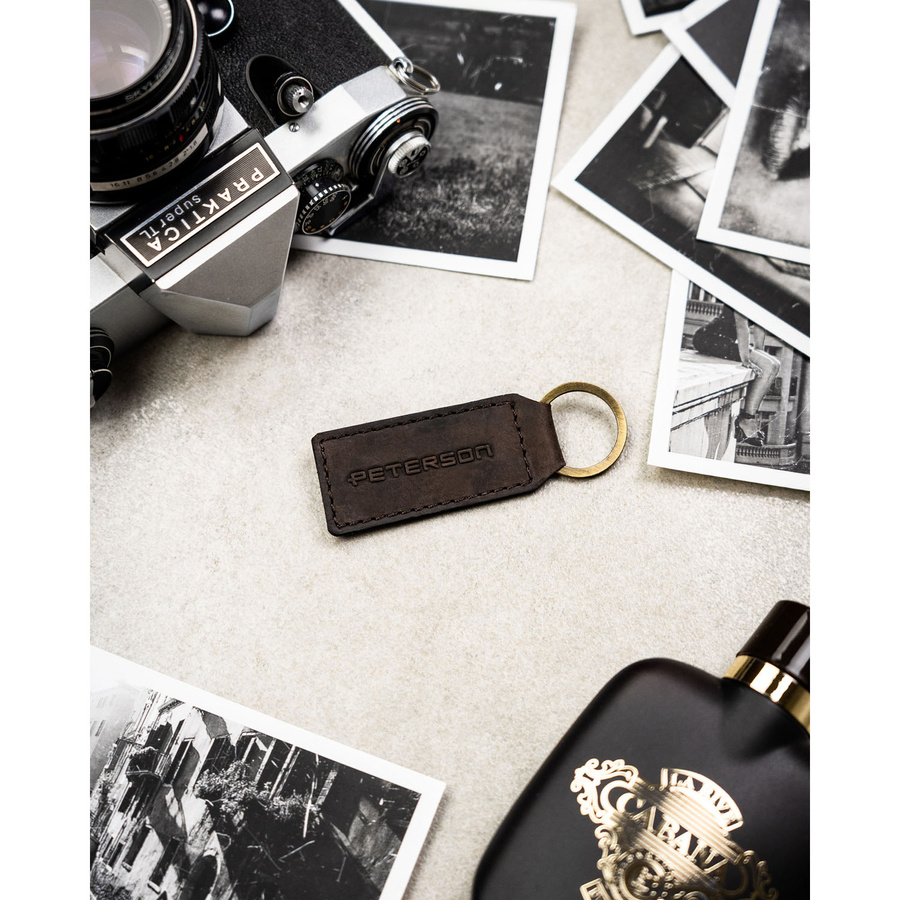Poziomy portfel męski ze skóry naturalnej w brązowym kolorze zamykany na zatrzask, w zestawie z brelokiem - Peterson