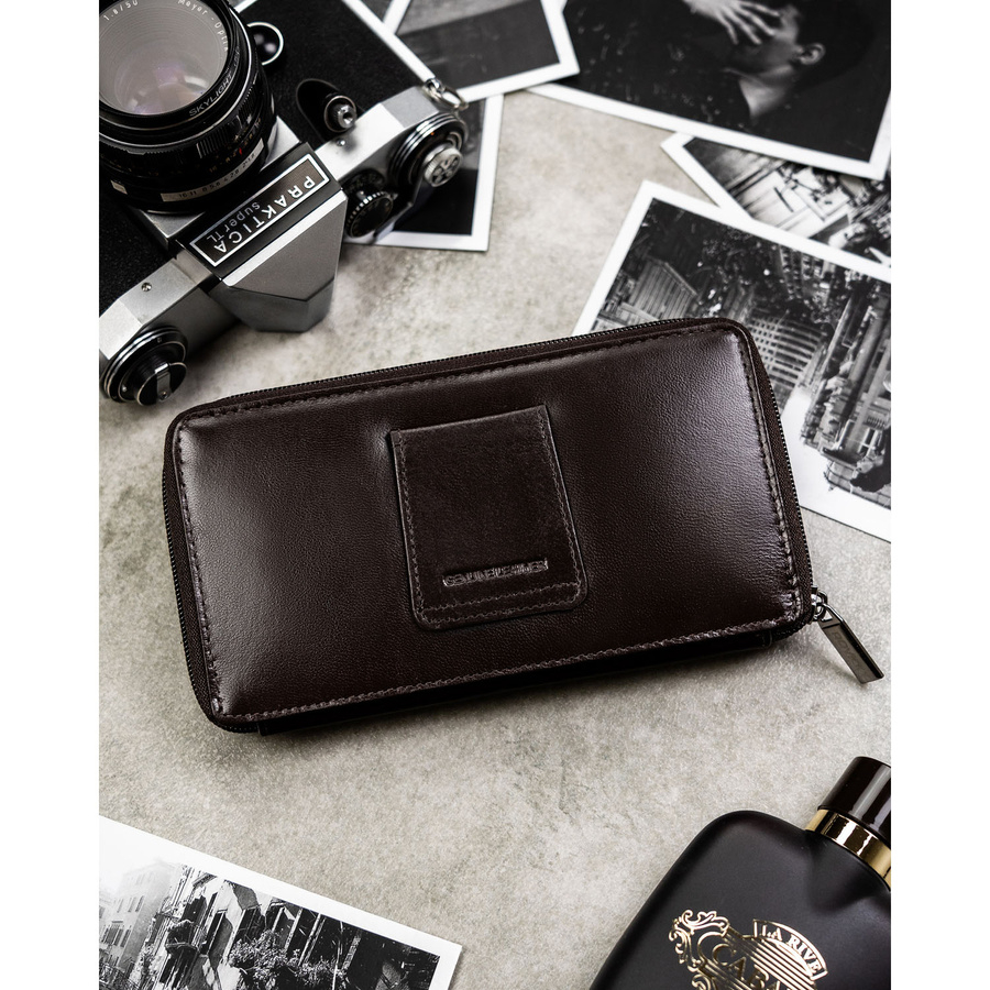 • Sekcja pierwsza – pojemna część zamykana solidnym zamkiem błyskawicznym. Znajdziesz w niej liczne przegródki przeznaczone na karty, dokumenty oraz gotówkę.