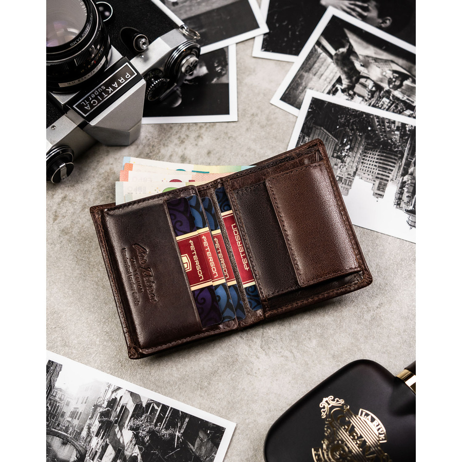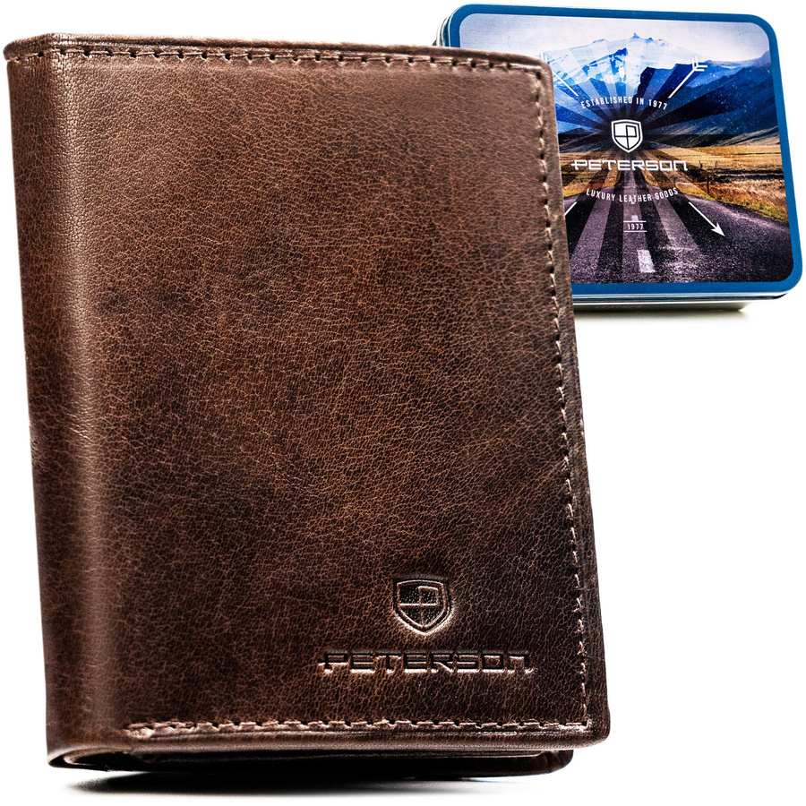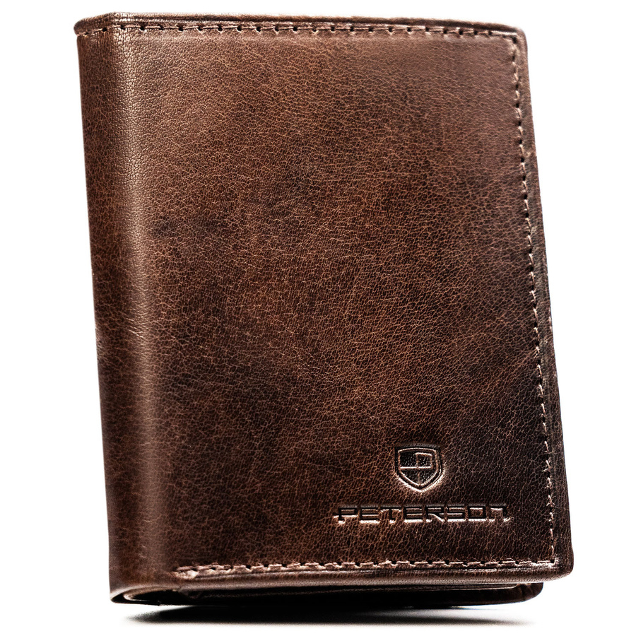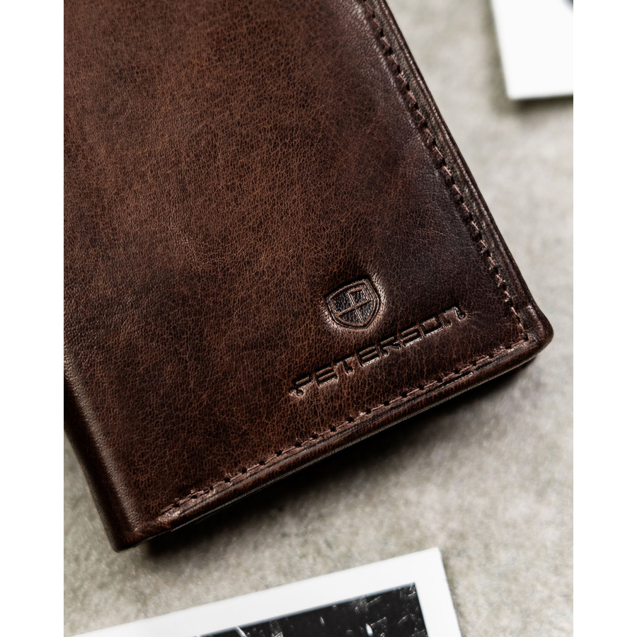 Pionowy portfel męski ze skóry naturalnej w brązowym kolorze, model bez zapięcia zewnętrznego - Peterson