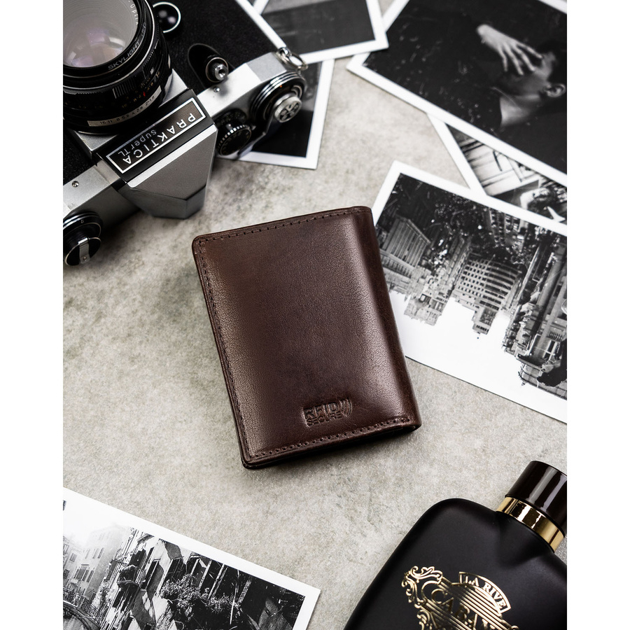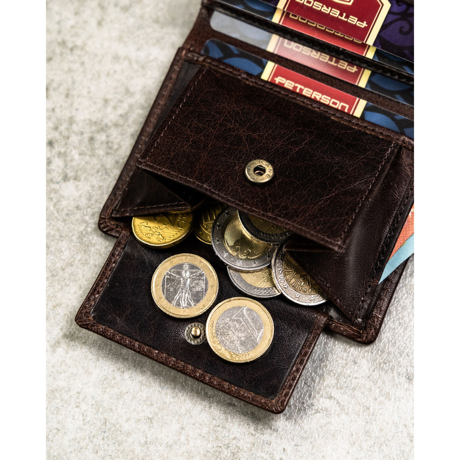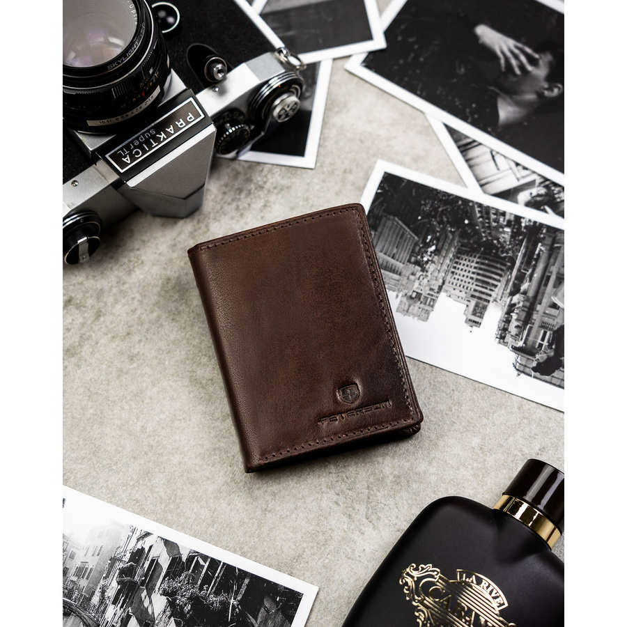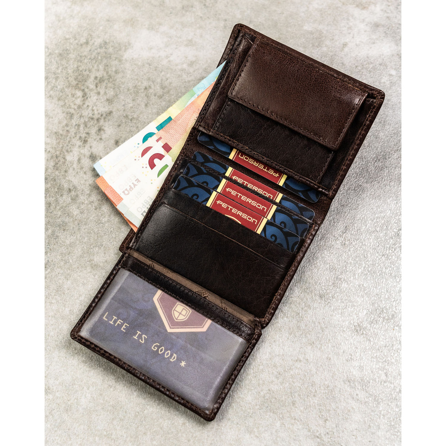 Pionowy portfel męski ze skóry naturalnej w brązowym kolorze, model bez zapięcia zewnętrznego - Peterson