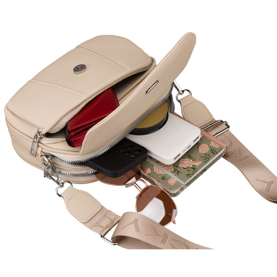 Mała torebka o sporej pojemności. Zamykana na solidne zamki błyskawiczne. Wyposażona w 2 komory i szereg dodatkowych kieszeni, w których zmieścisz wszystkie najpotrzebniejsze drobiazgi.