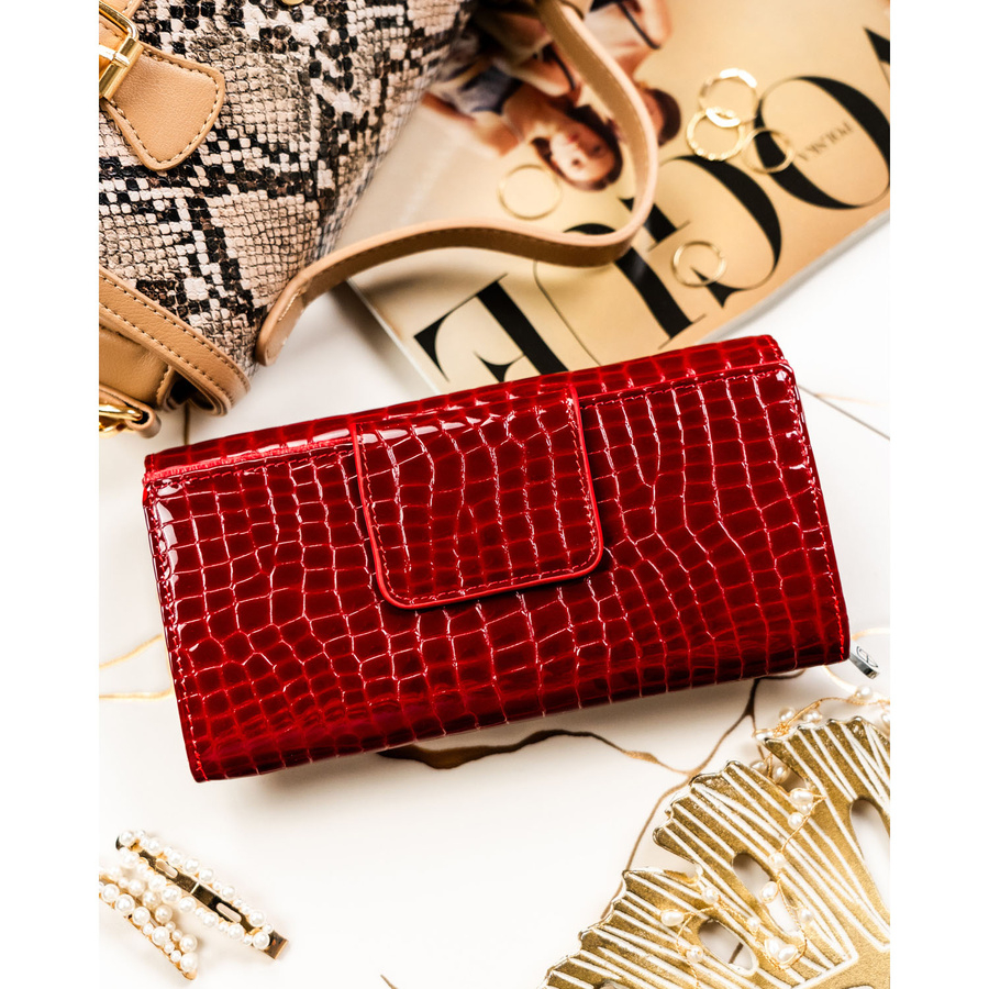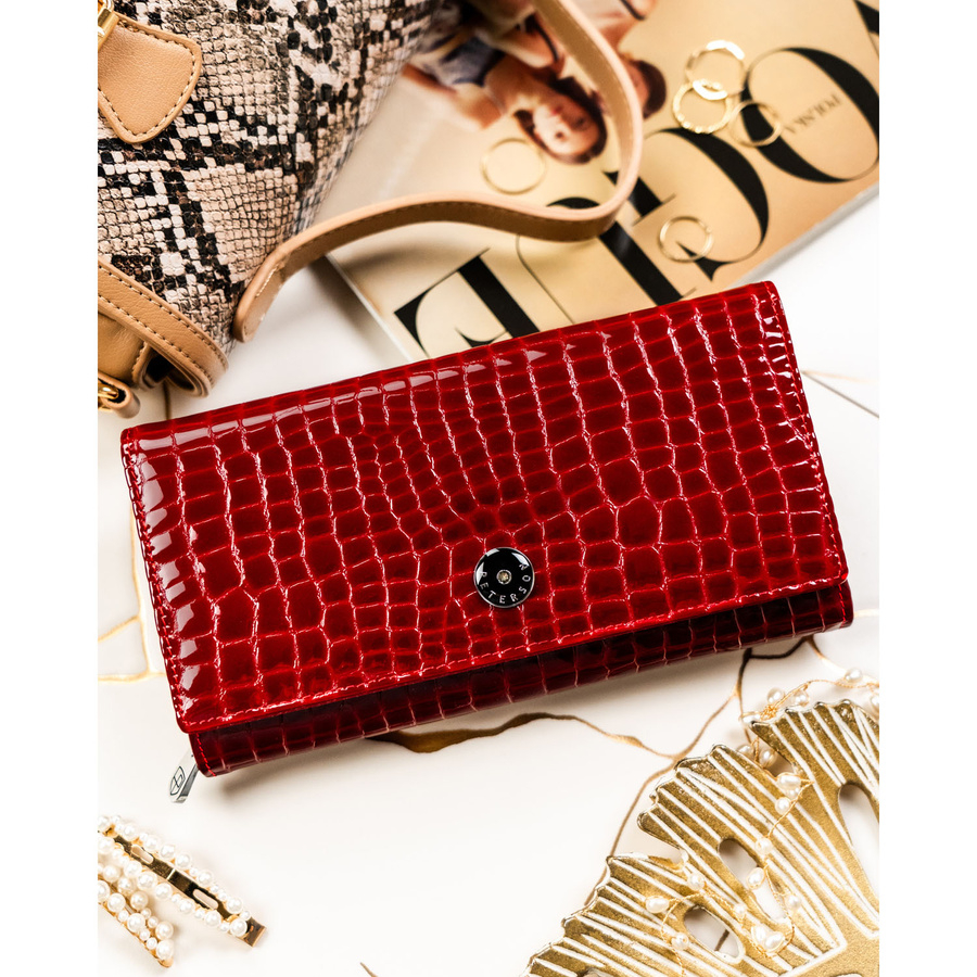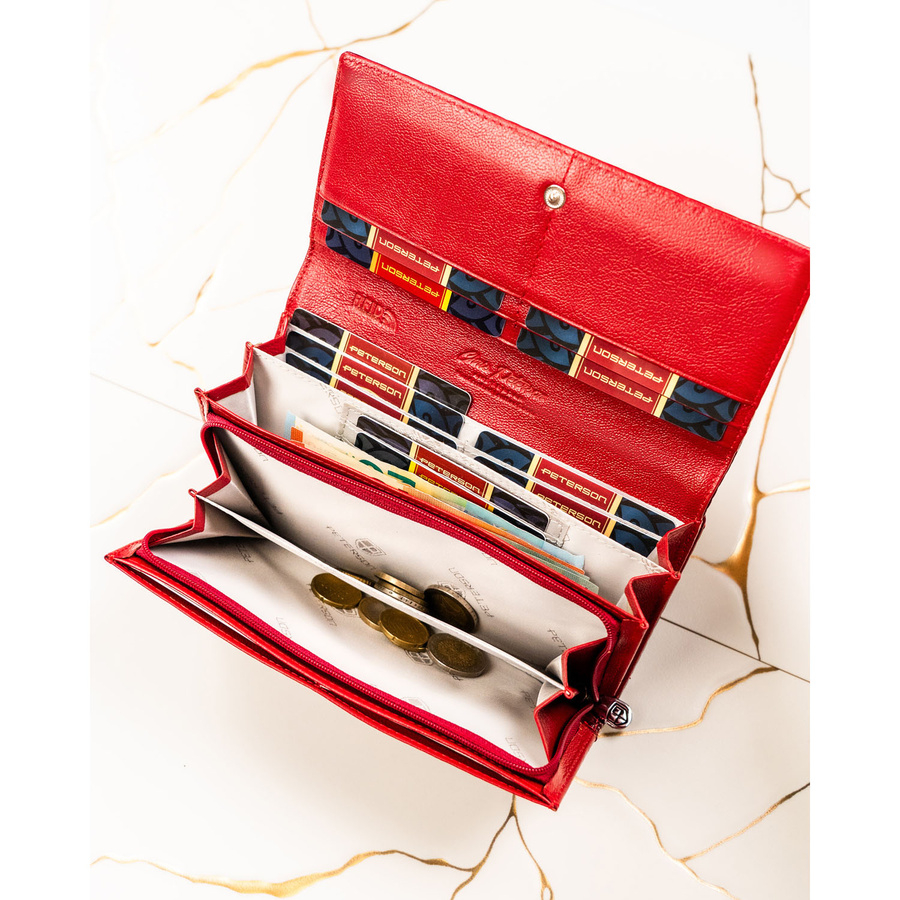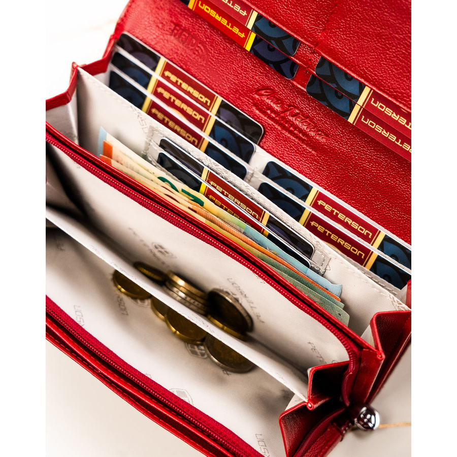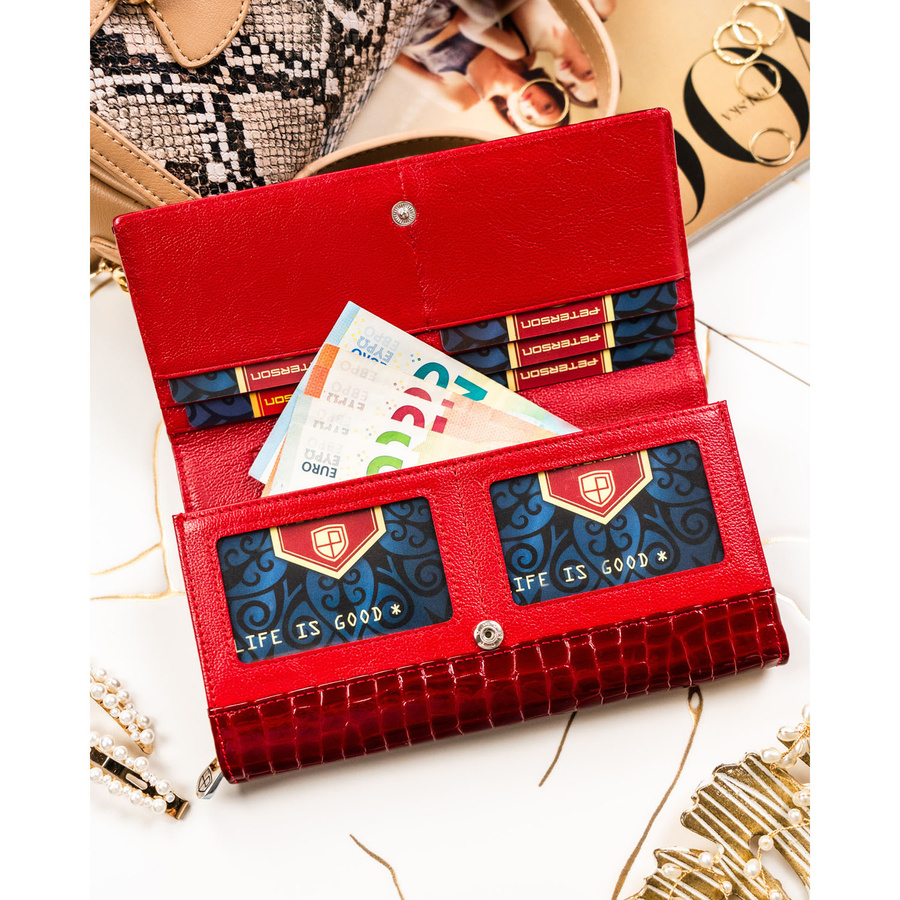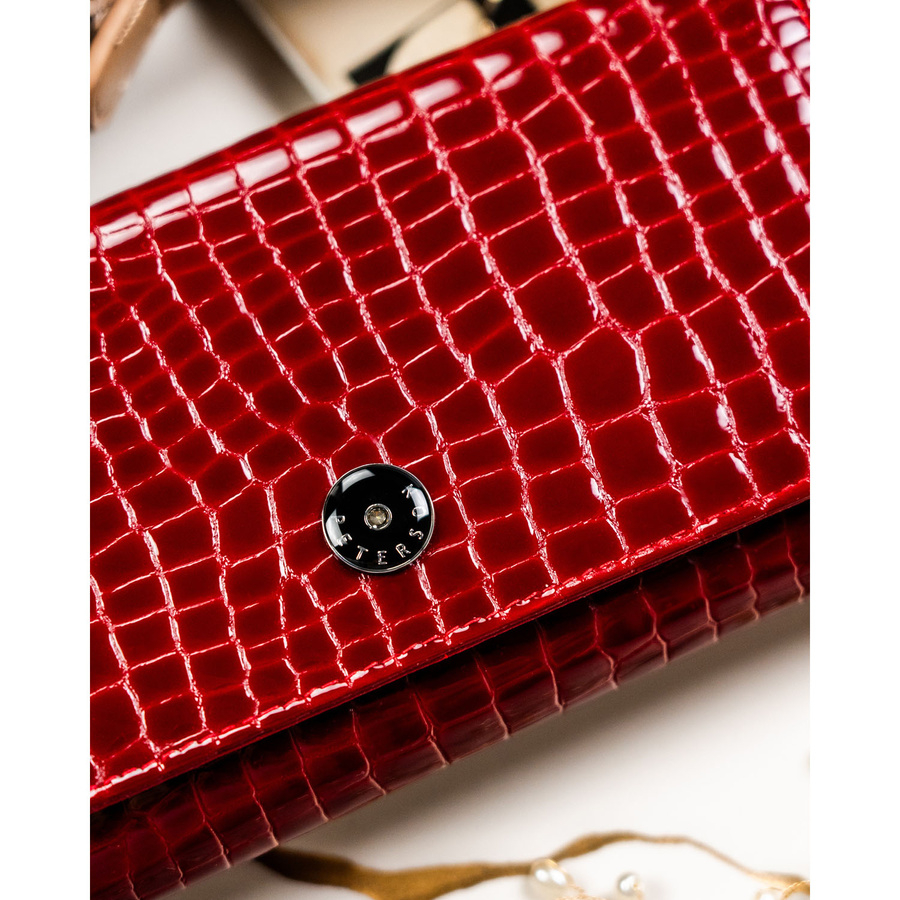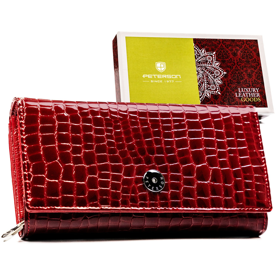 Portfel został zaprojektowany z myślą o kobietach, które cenią sobie zarówno estetykę, jak i praktyczność. Lakierowana skóra nadaje mu elegancki charakter, a tłoczenia inspirowane wzorem krokodyla dodają mu nowoczesnego, luksusowego wyglądu. Starannie dobrane detale, takie jak srebrny logowany suwak i logo PETERSON na froncie, podkreślają jego prestiż.