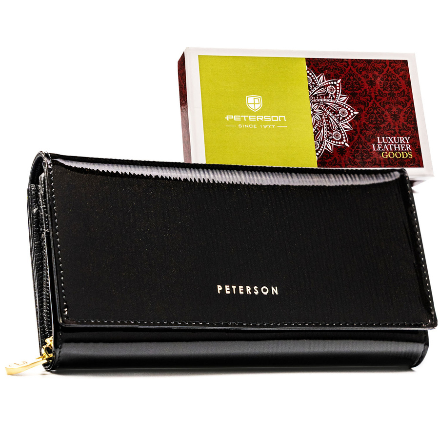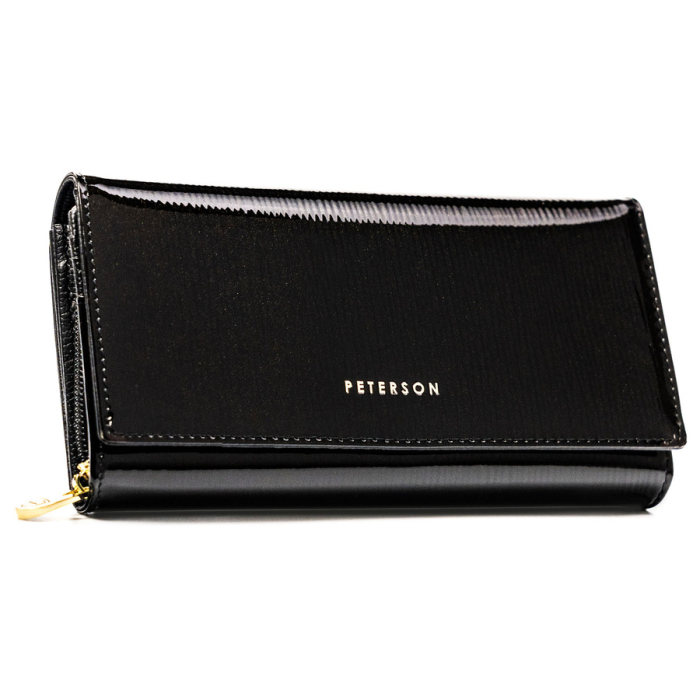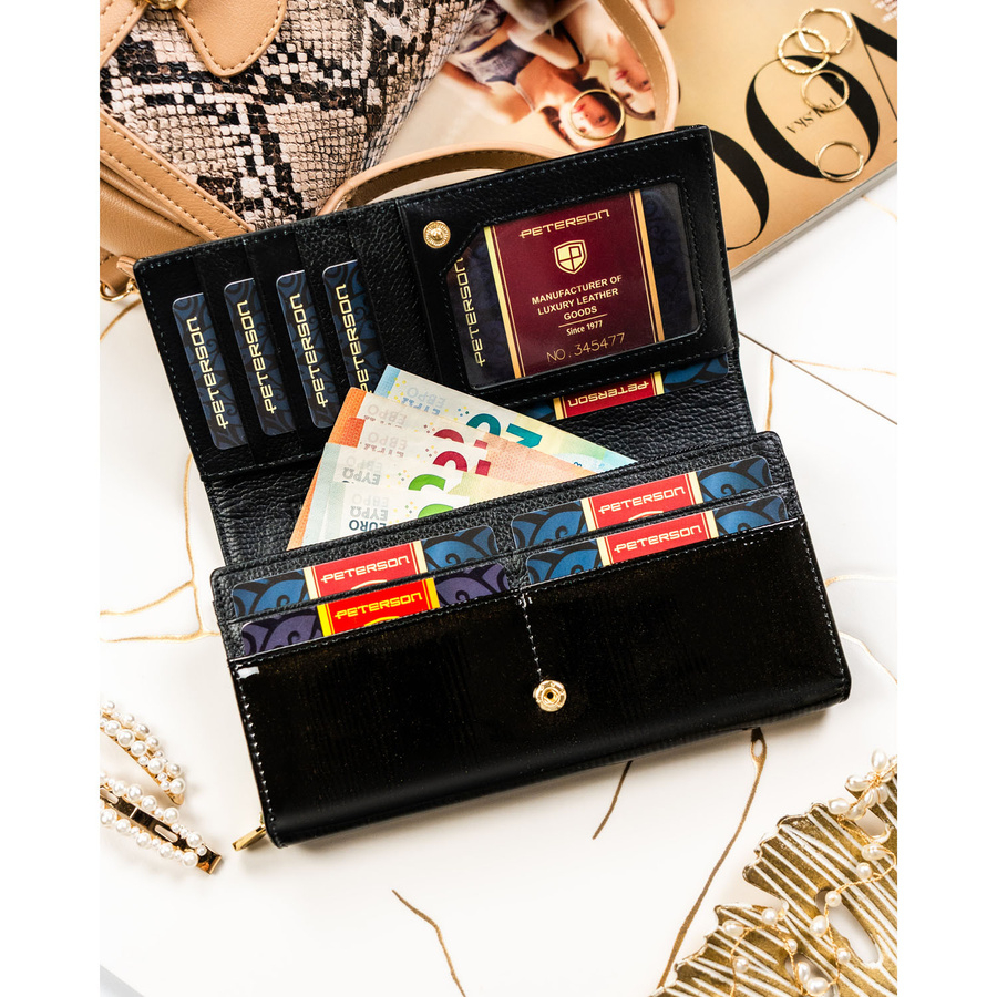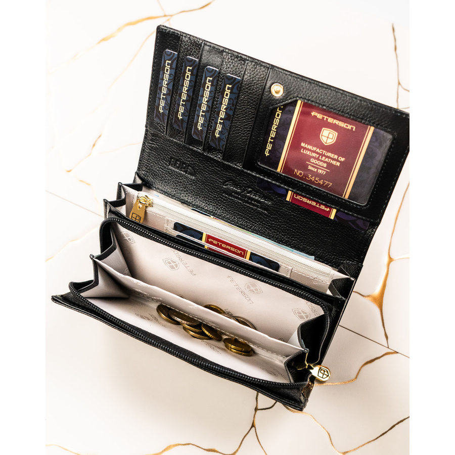Portfel damski ze skóry naturalnej w czarnym kolorze, wyposażony w system RFID - Peterson