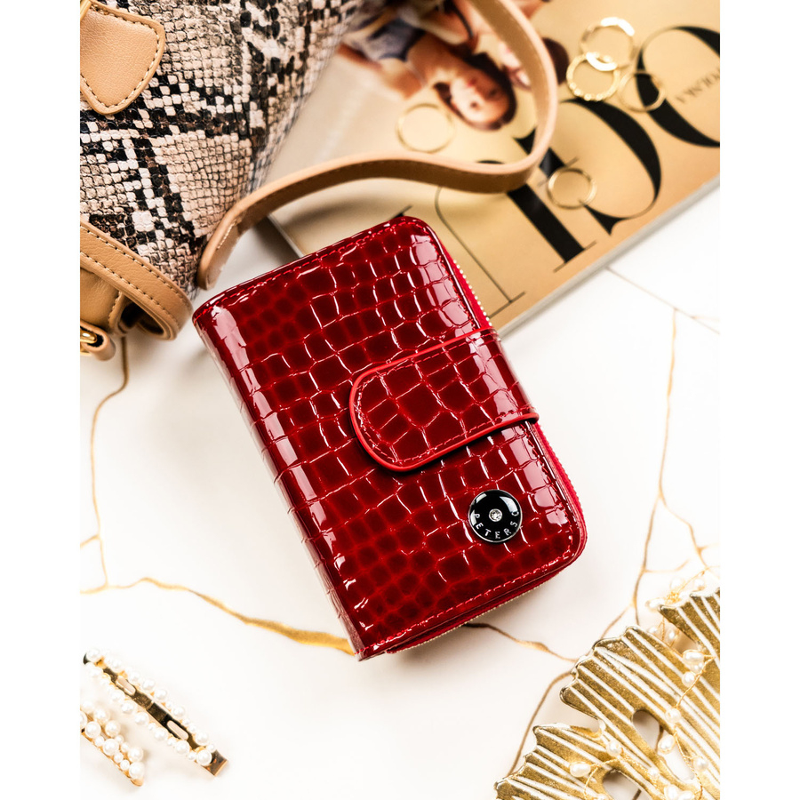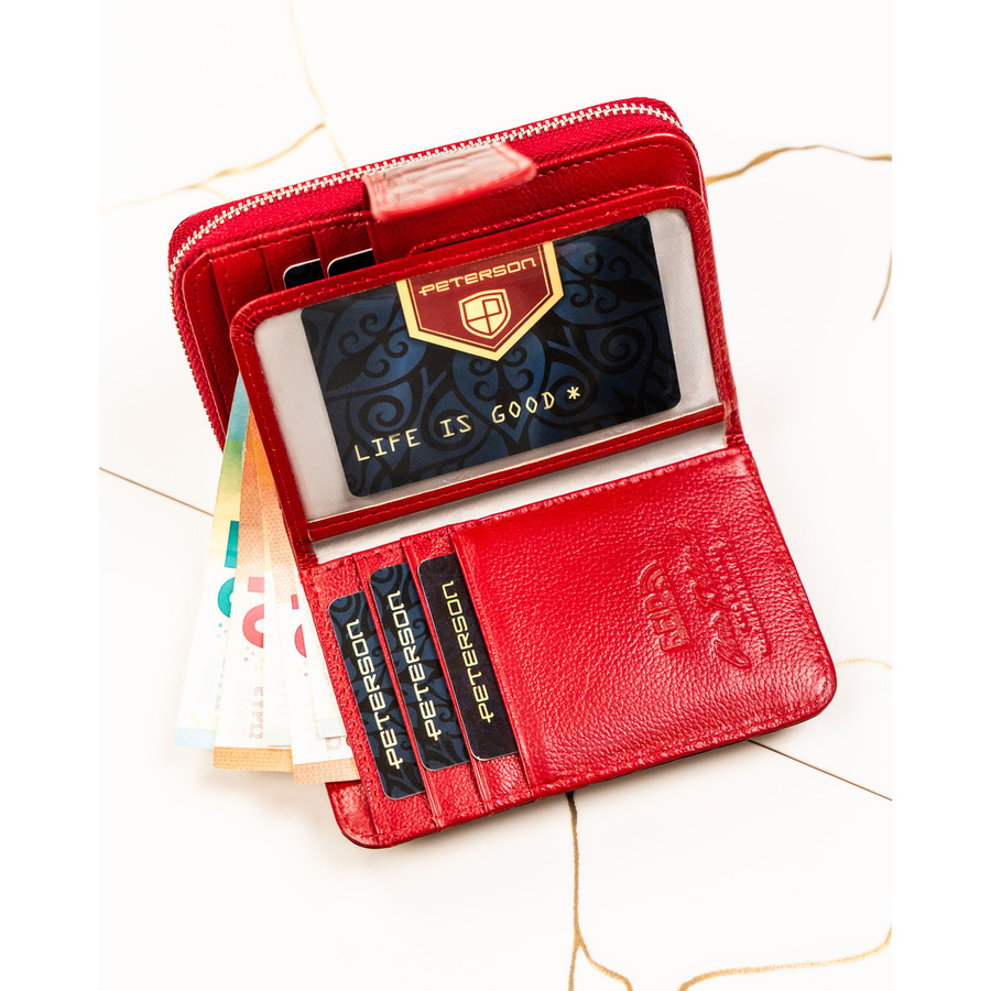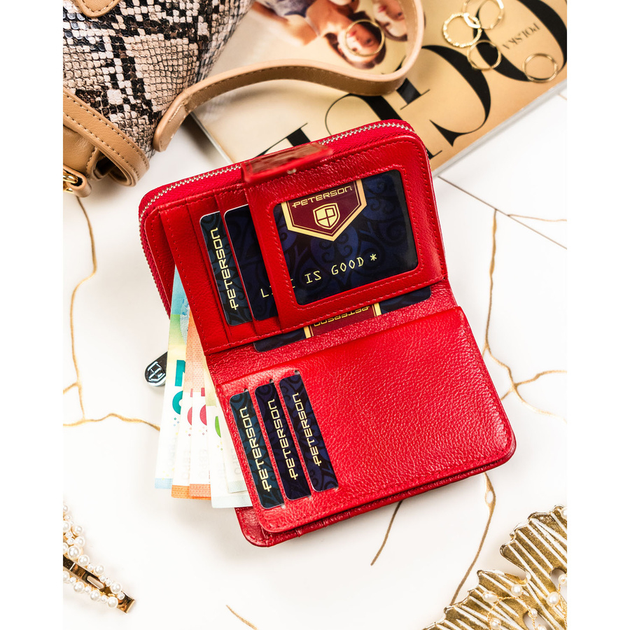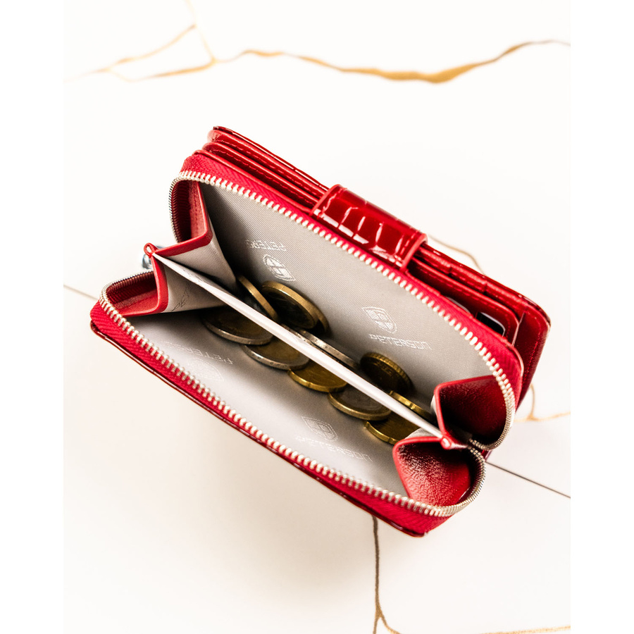 Pionowy, czerwony portfel damski ze skóry naturalnej zamykany na suwak i zatrzask - Peterson