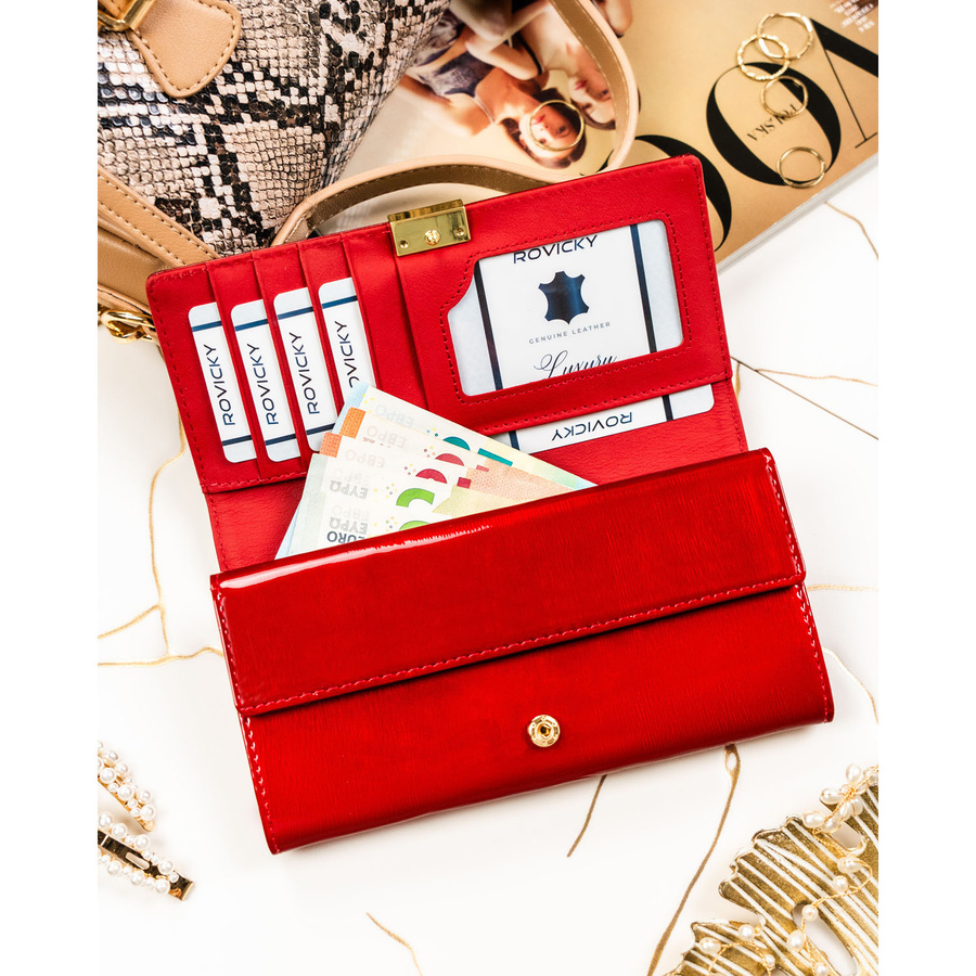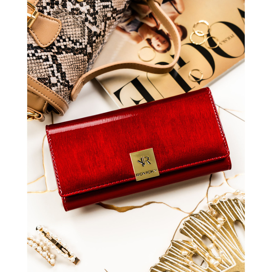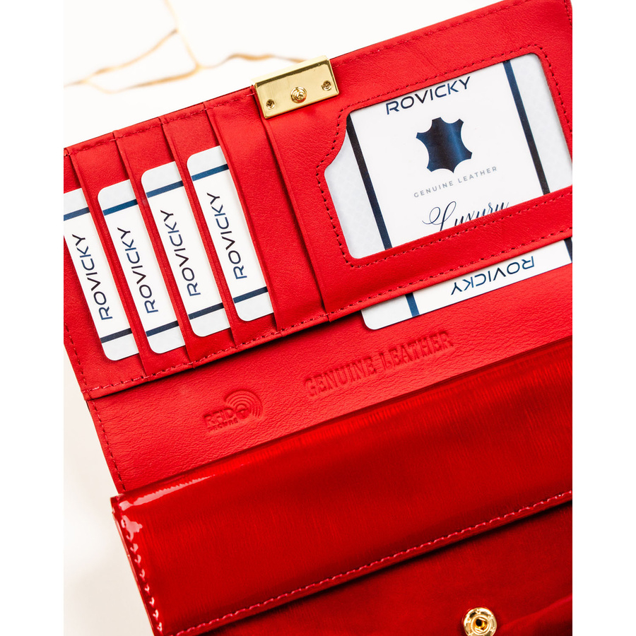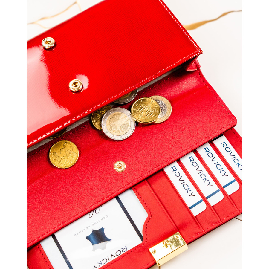 Duży portfel damski z lakierowanej skóry naturalnej w czerwonym kolorze zamykany na zatrzask - Rovicky