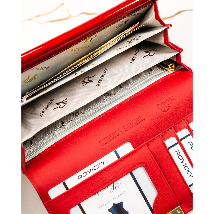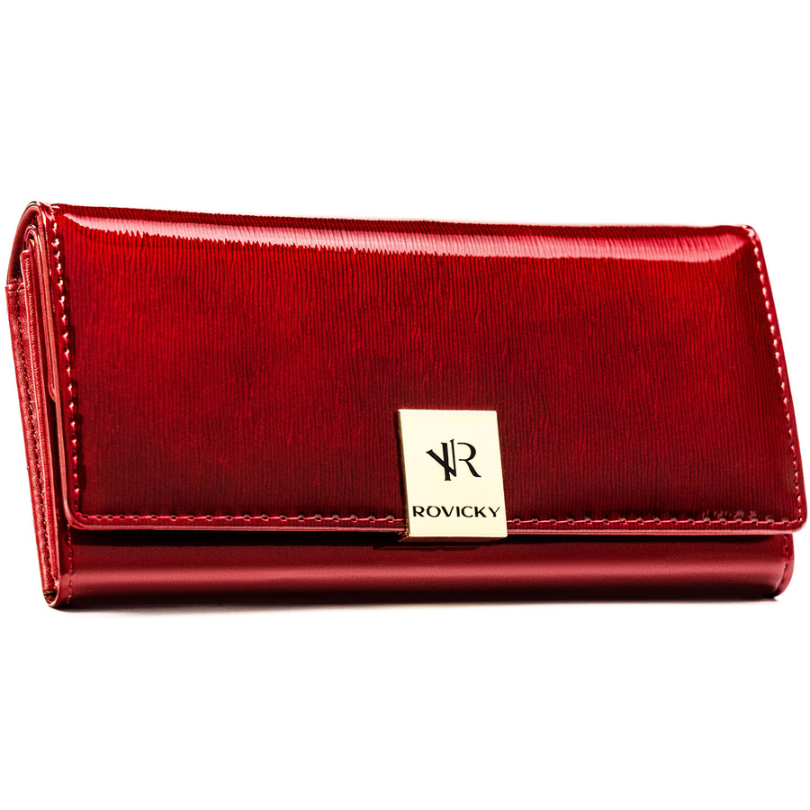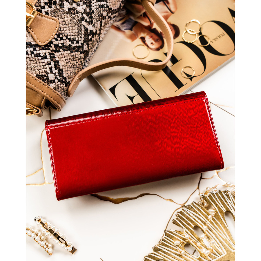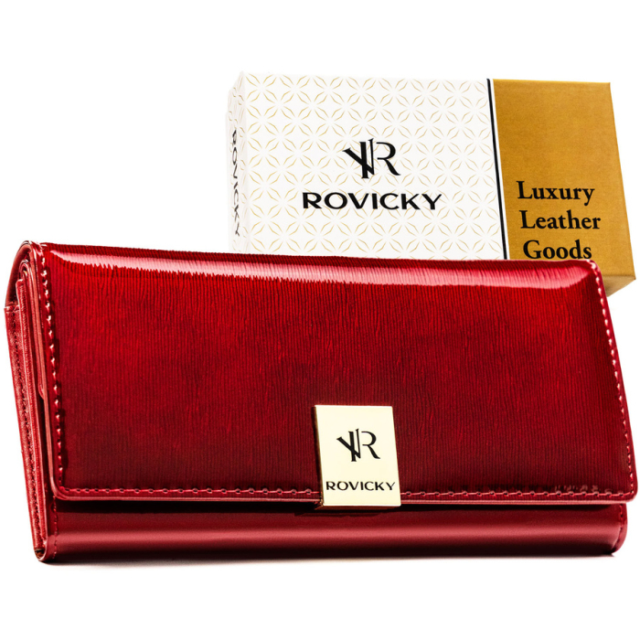 Duży portfel damski z lakierowanej skóry naturalnej w czerwonym kolorze zamykany na zatrzask - Rovicky