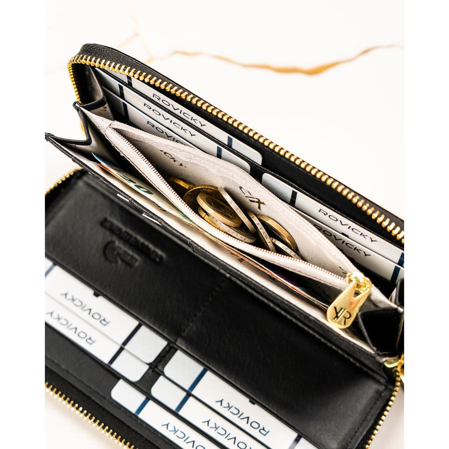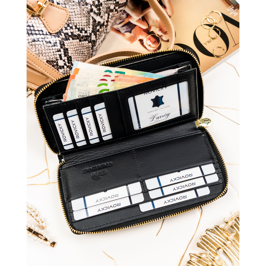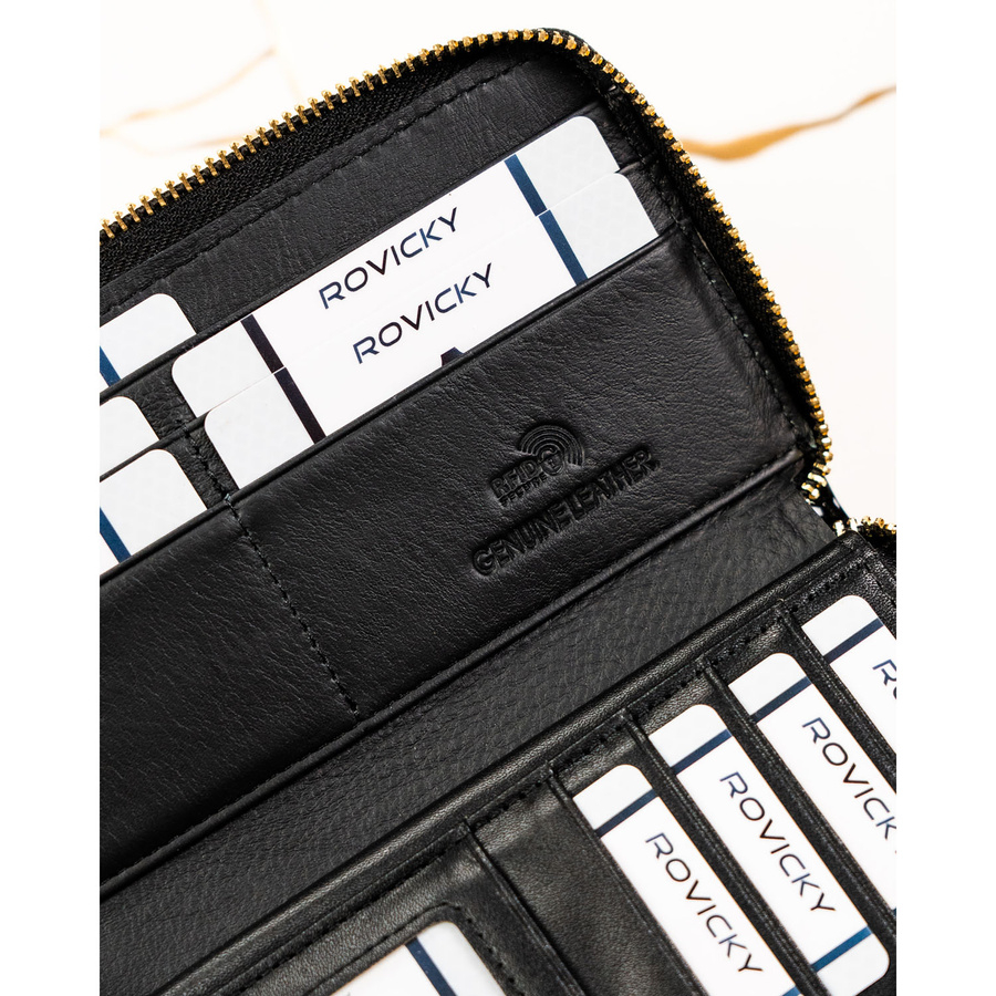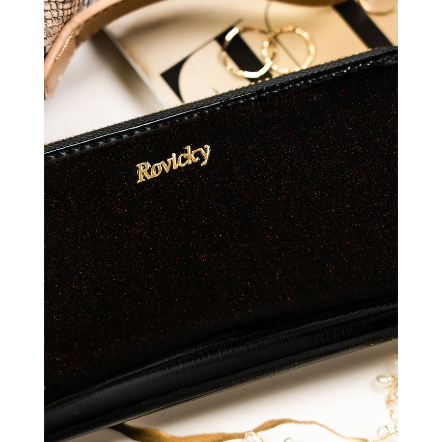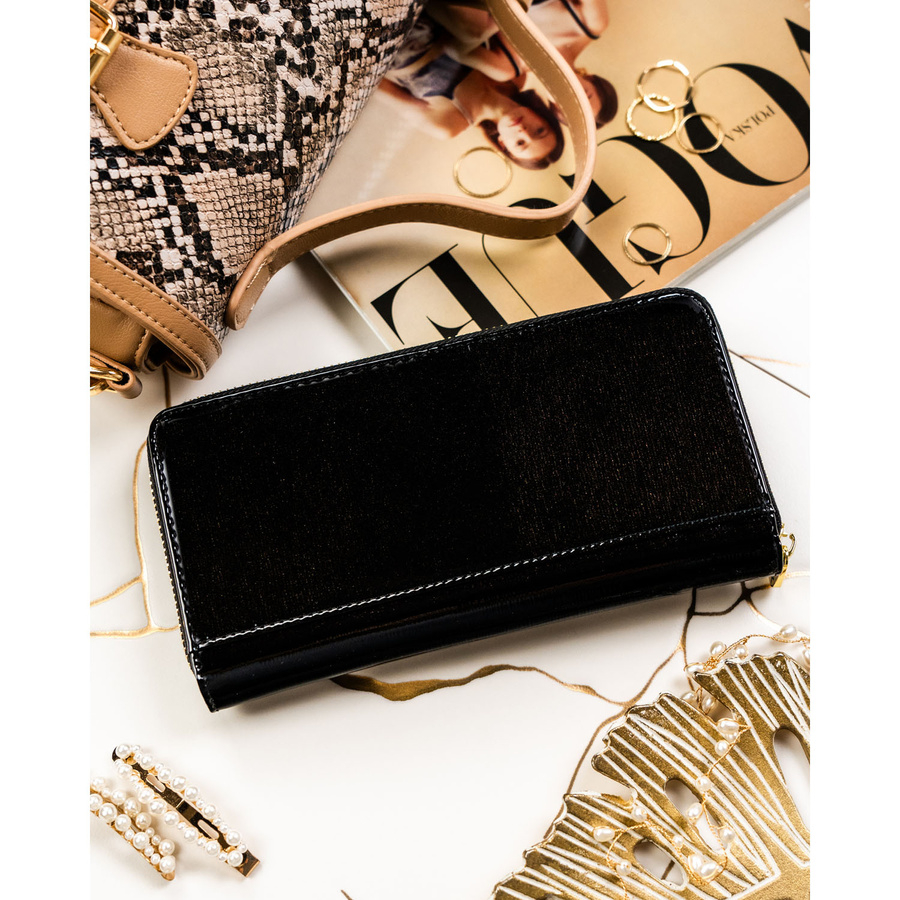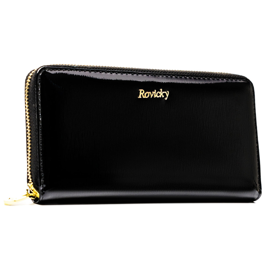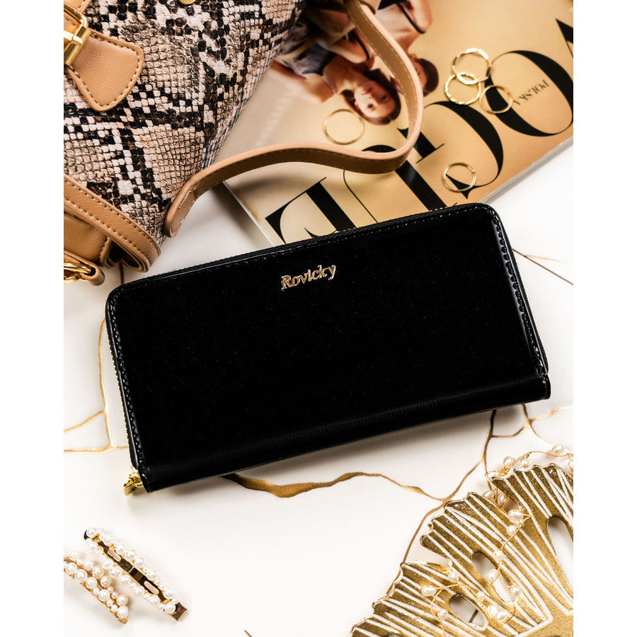 Czarny portfel-piórnik damski z lakierowanej skóry naturalnej wyposażony w system RFID  - Rovicky