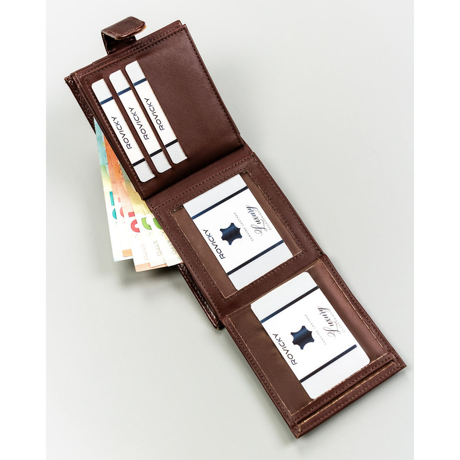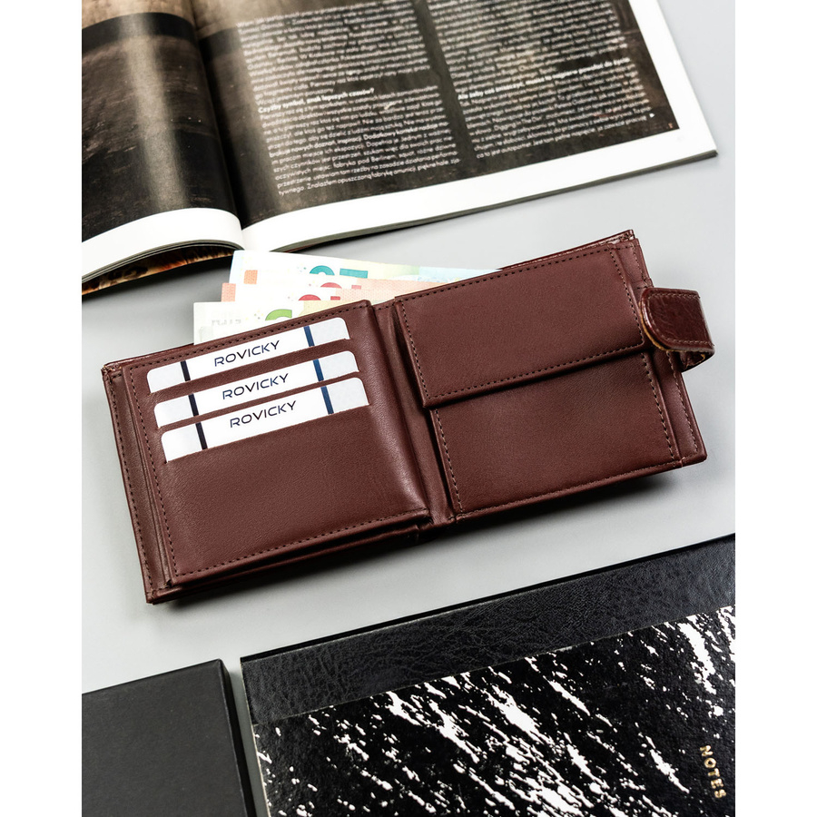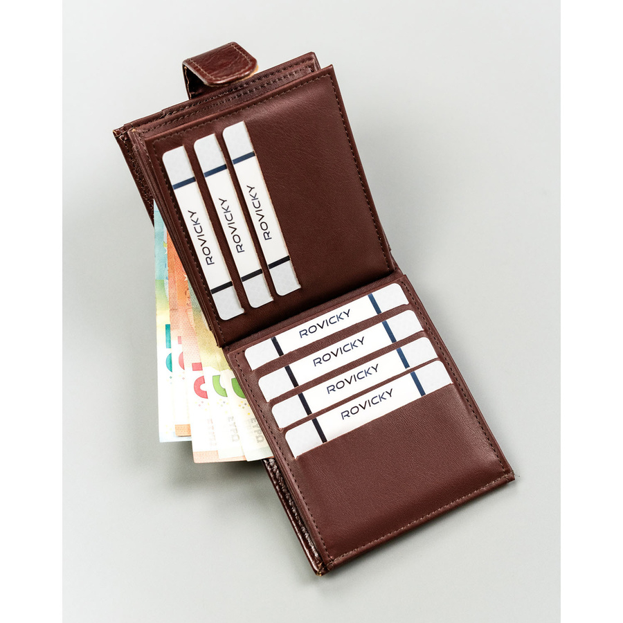 Poziomy układ sprawia, że po otwarciu wszystkie karty są widoczne i łatwo dostępne. To praktyczny duży portfel męski, który pomaga utrzymać porządek.