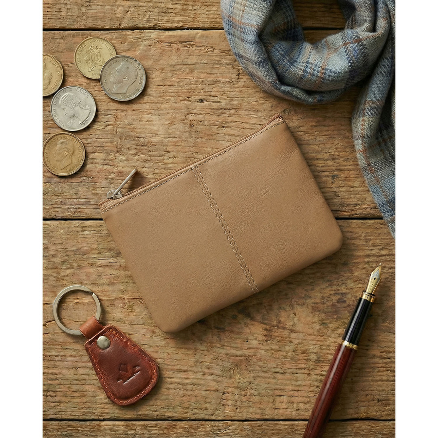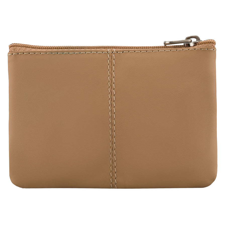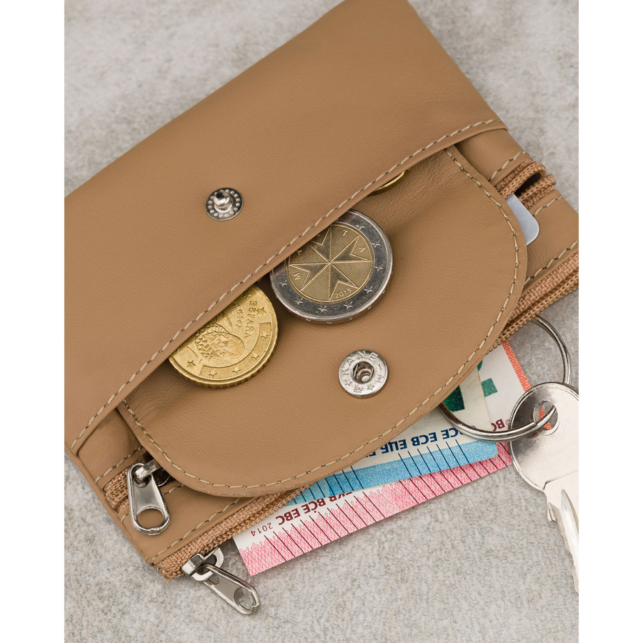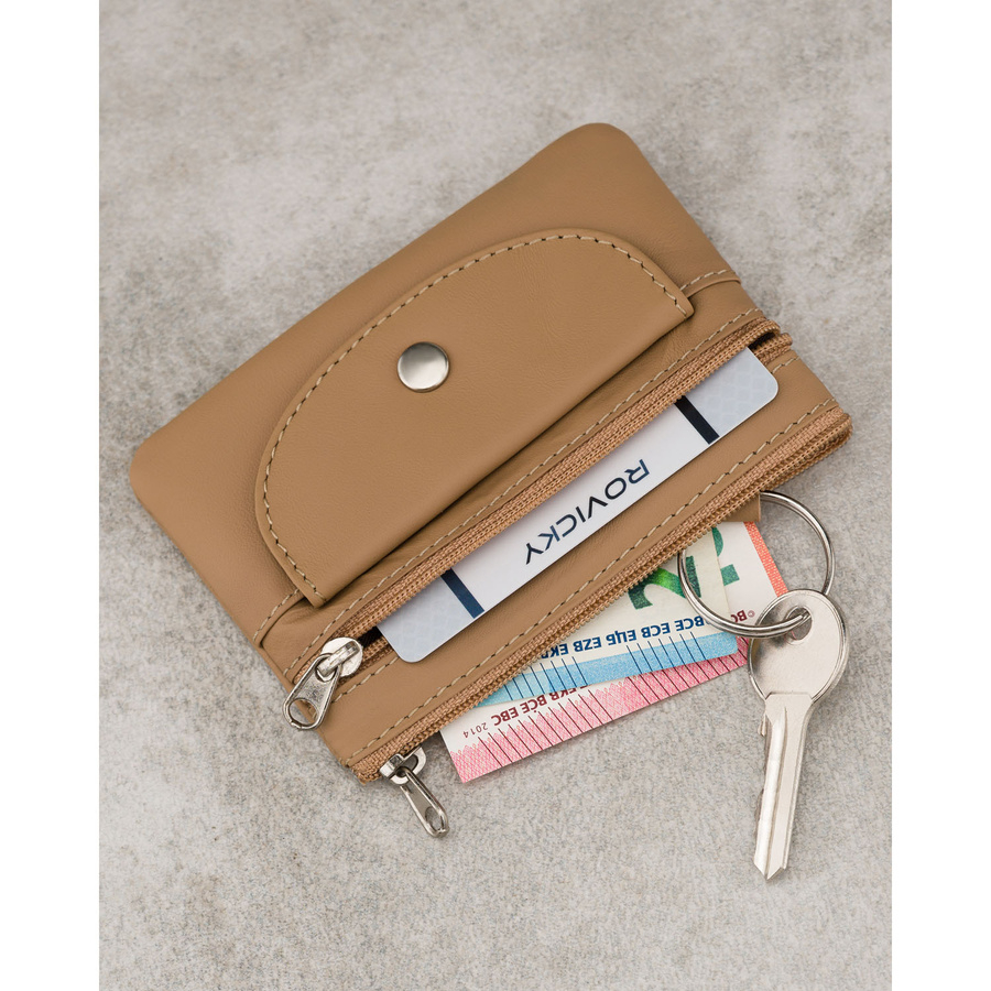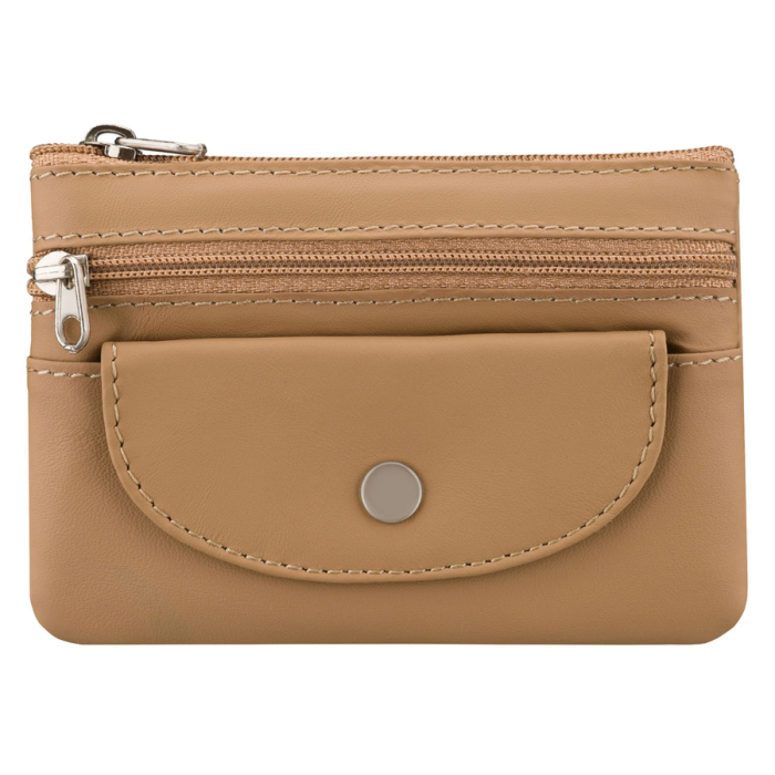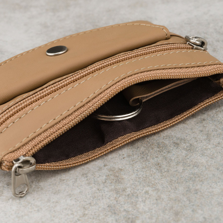 Jasnobrązowe etui na klucze ze skóry naturalnej z zewnętrzną kieszenią na zatrzask, zamykane suwakiem